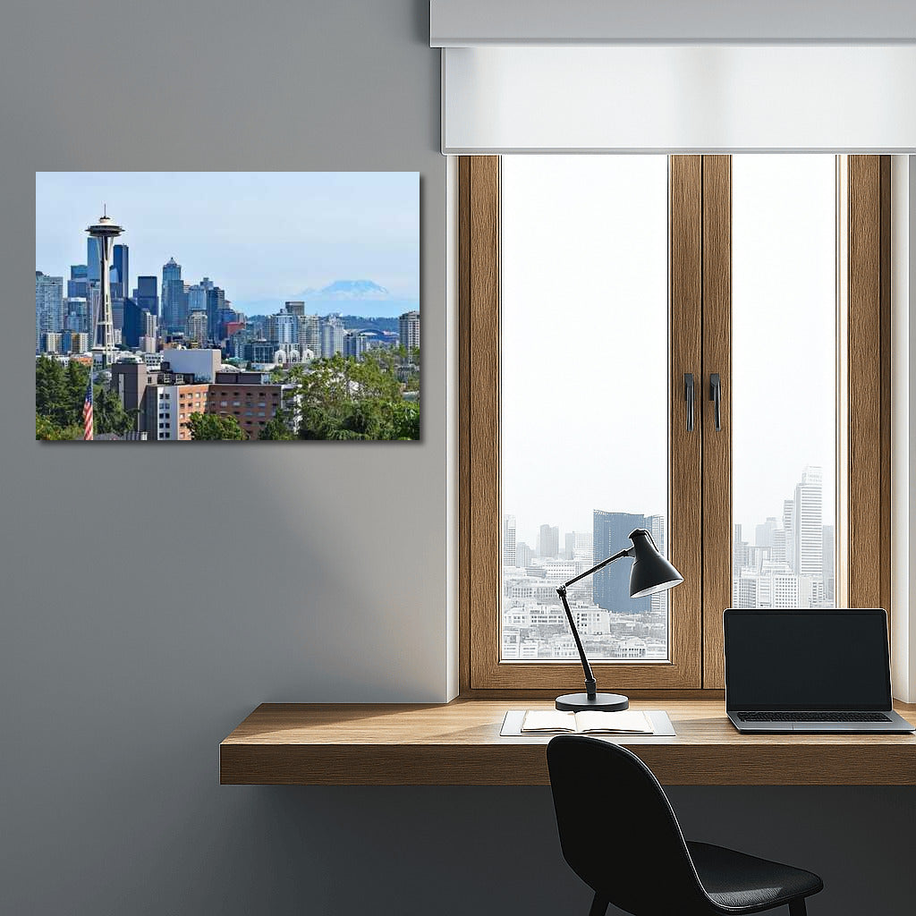 The timeless spirit of Seattle is captured on this poster: The Space Needle rises above the city, representing the freedom and inspiration of Washington. See more from the collection: Country Art
