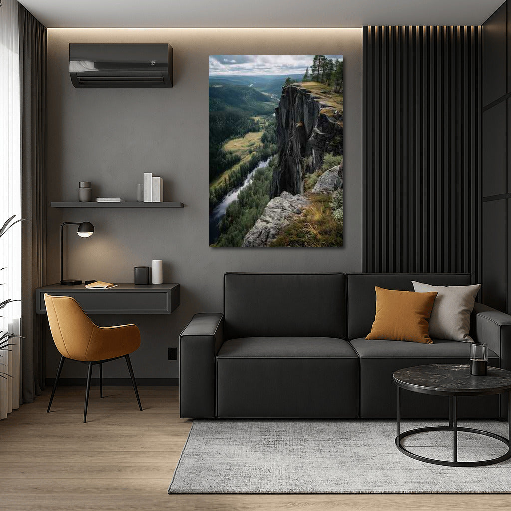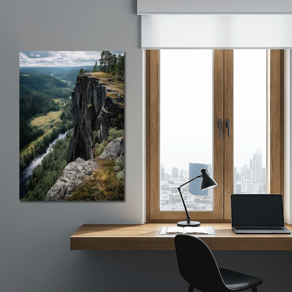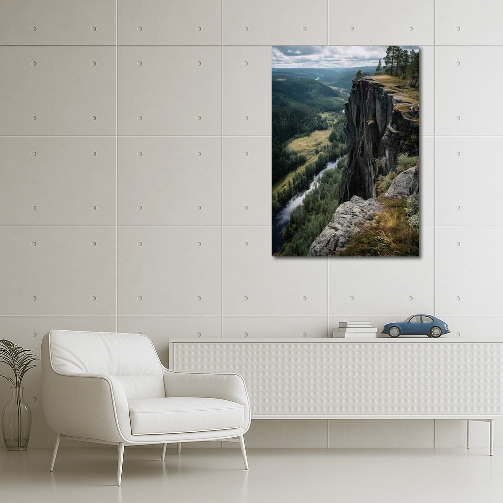 Enjoy the breathtaking view of steep cliffs and endless nature in this painting. Perfect wall art for inspiration. See more from the collection: Cliffside Views Art