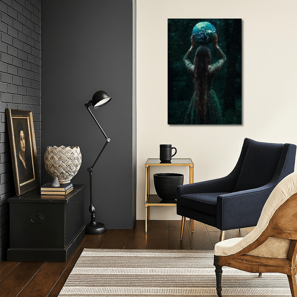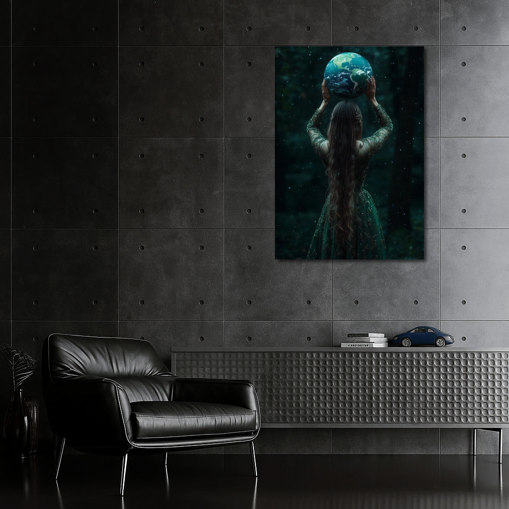 Mysterious wall art: figure holding the world surrounded by stars and forest. Immerse yourself in the magic and harmony of nature. See more from the collection: Mixed Wall Art