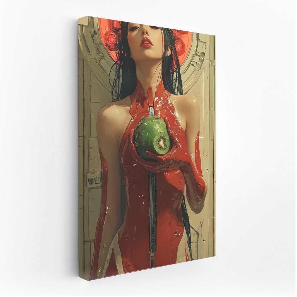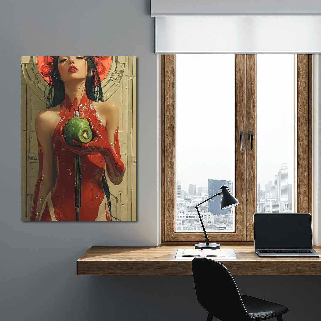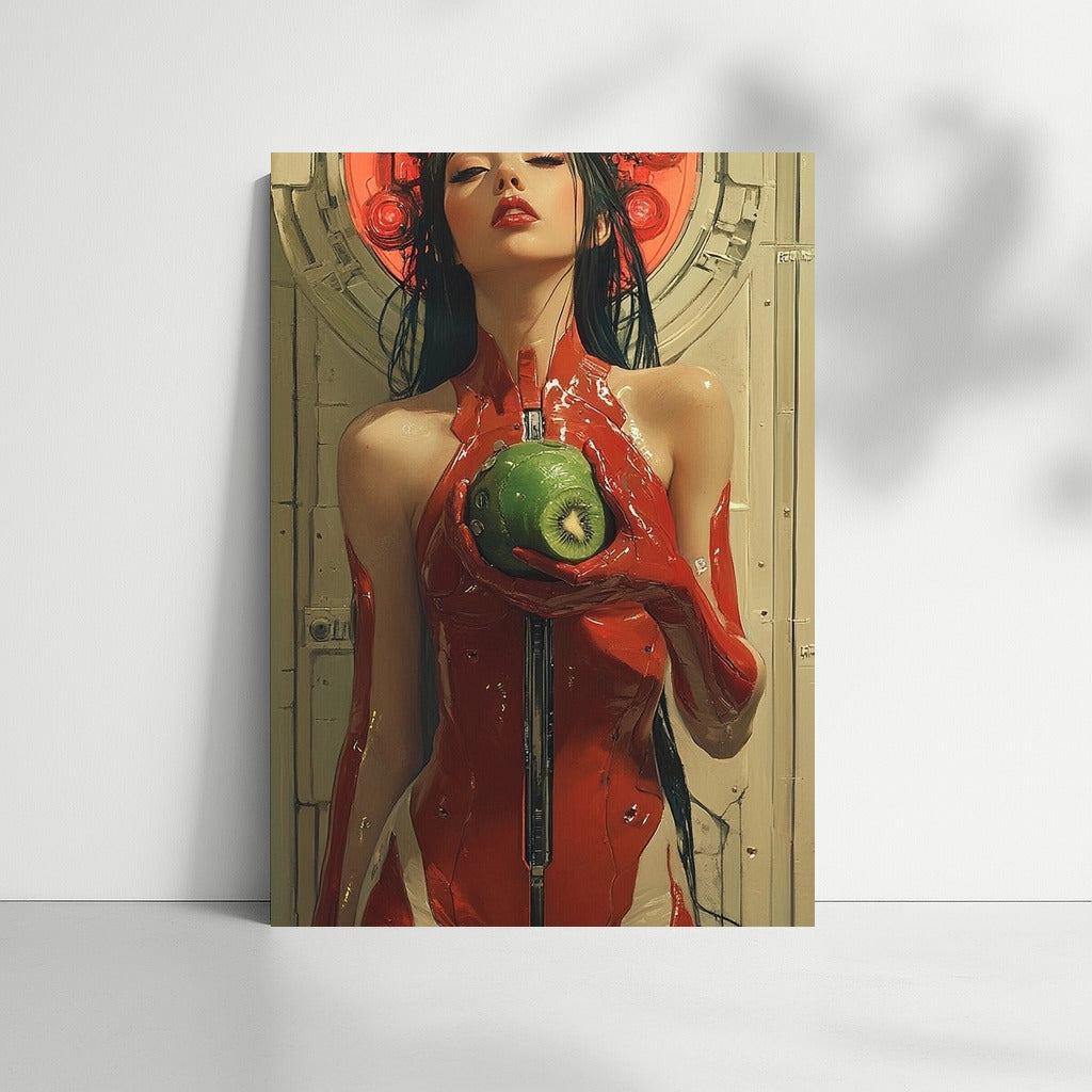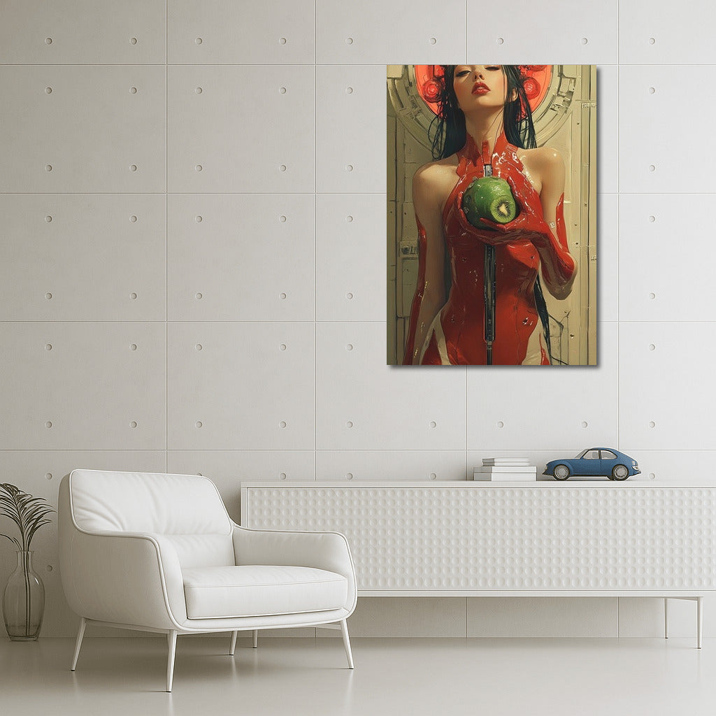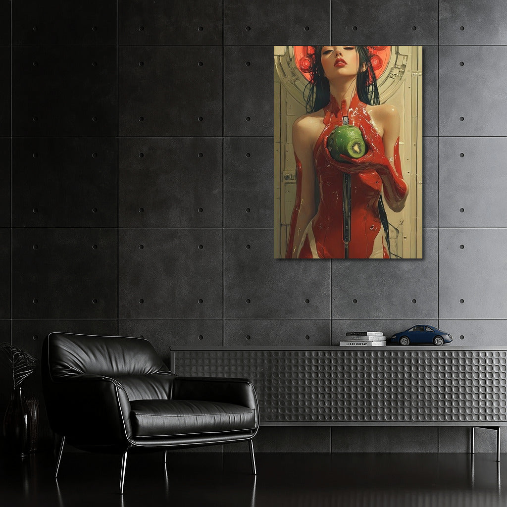 Futuristic painting: a mysterious figure with an apple in the center of the plot. Contemporary wall art for bold interiors. See more from the collection: Wall Art with Women