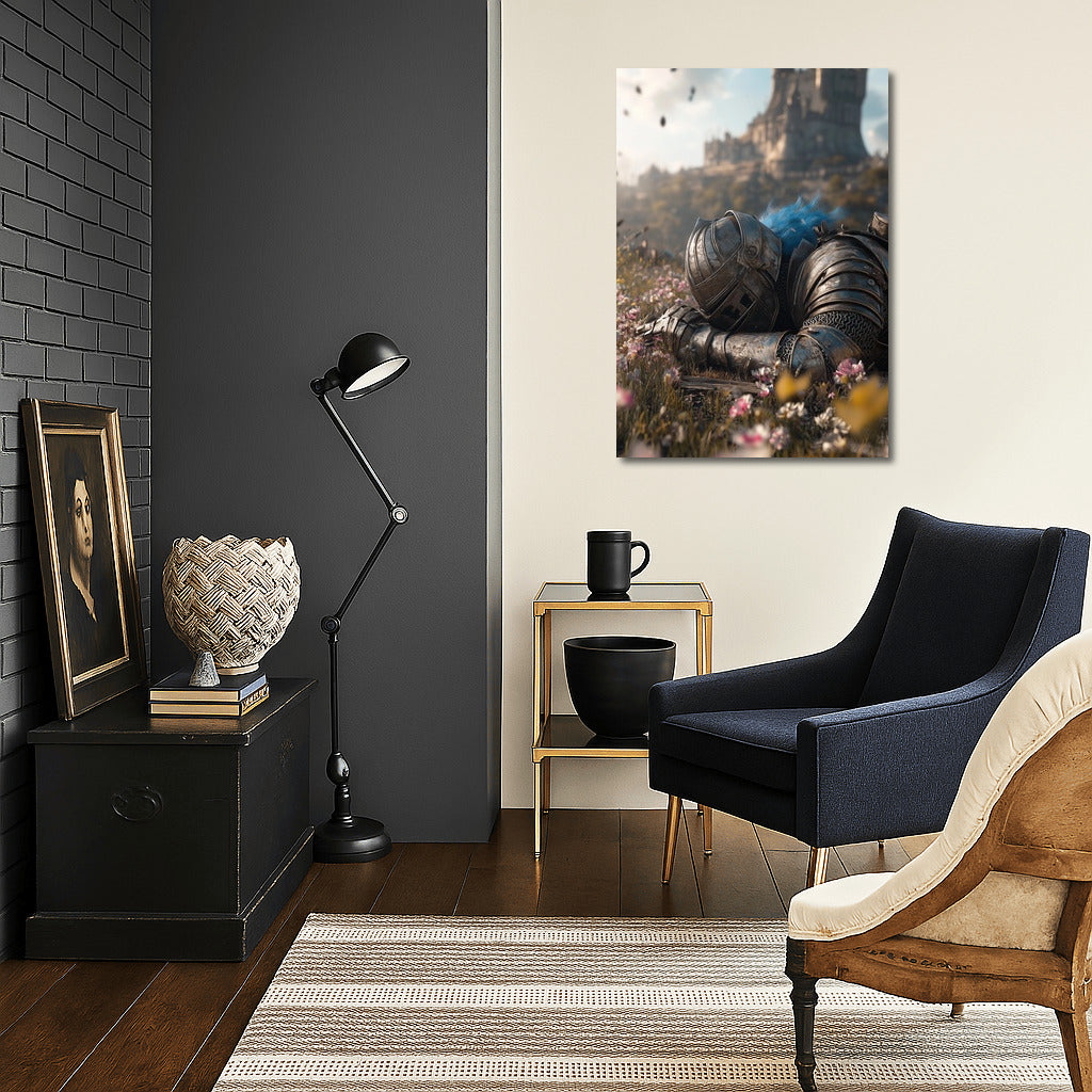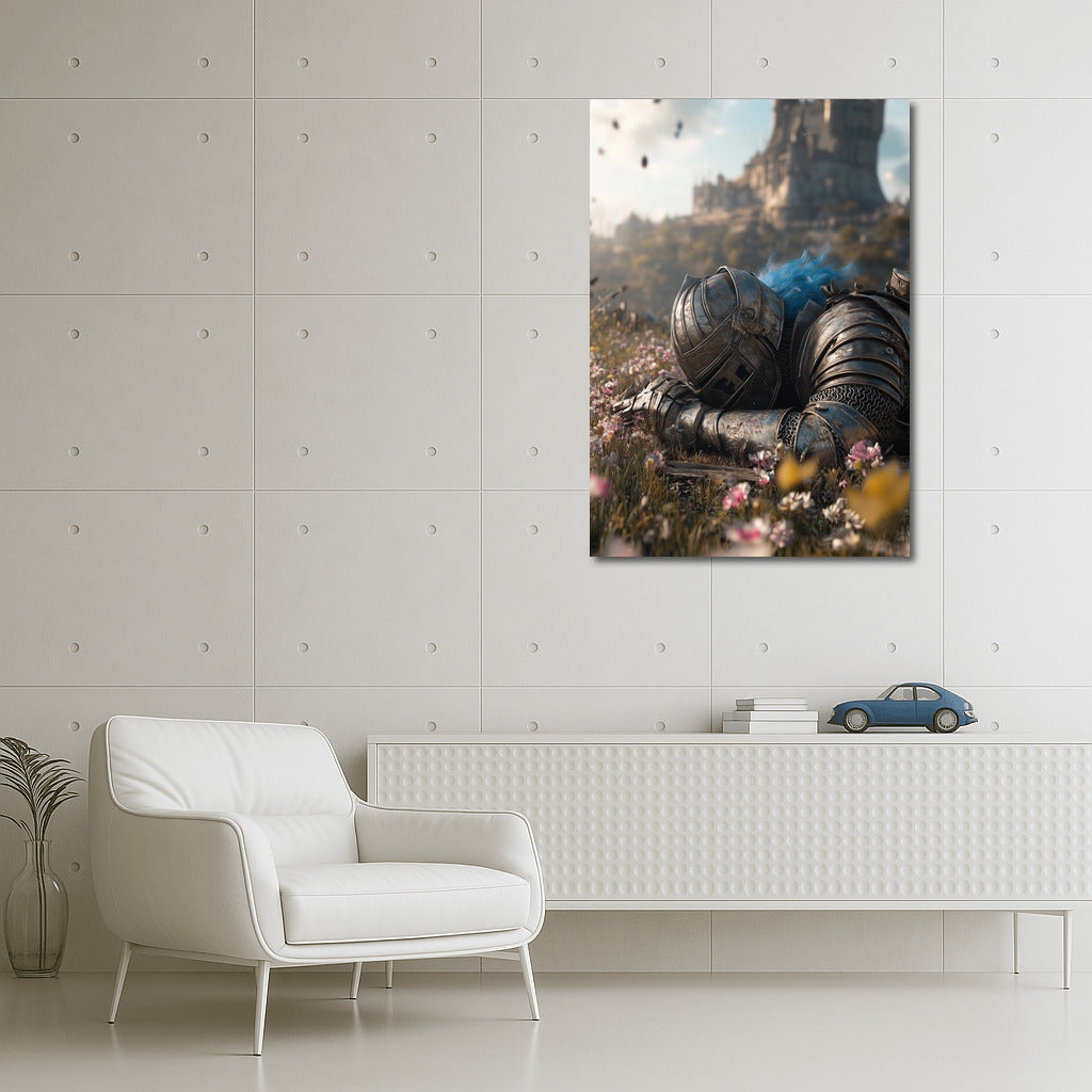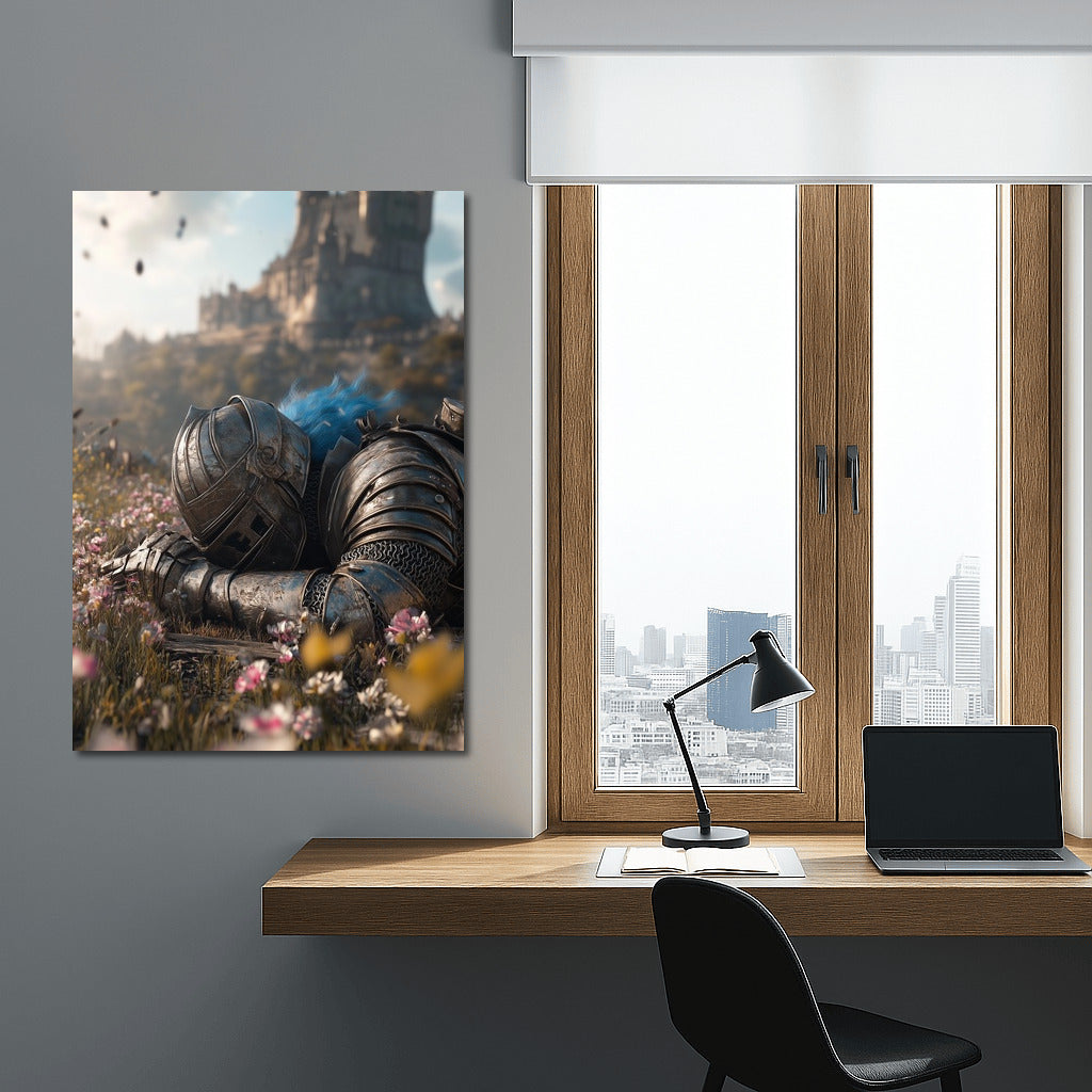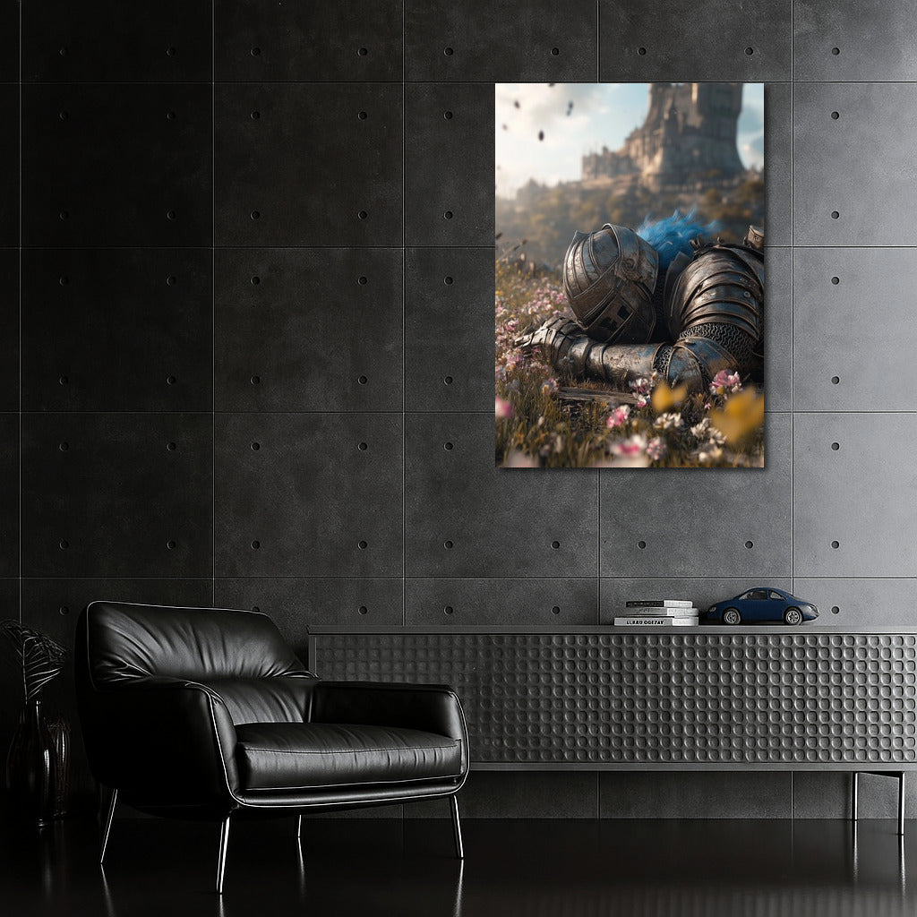 Knight in armor resting on a flower meadow, majestic castle in the background. Poster for inspiration and dreams. See more from the collection: Samurai Art