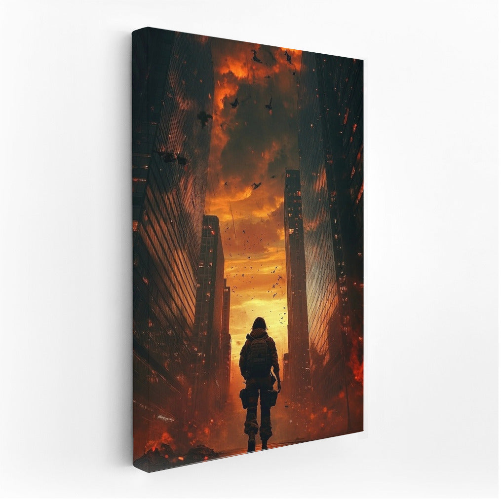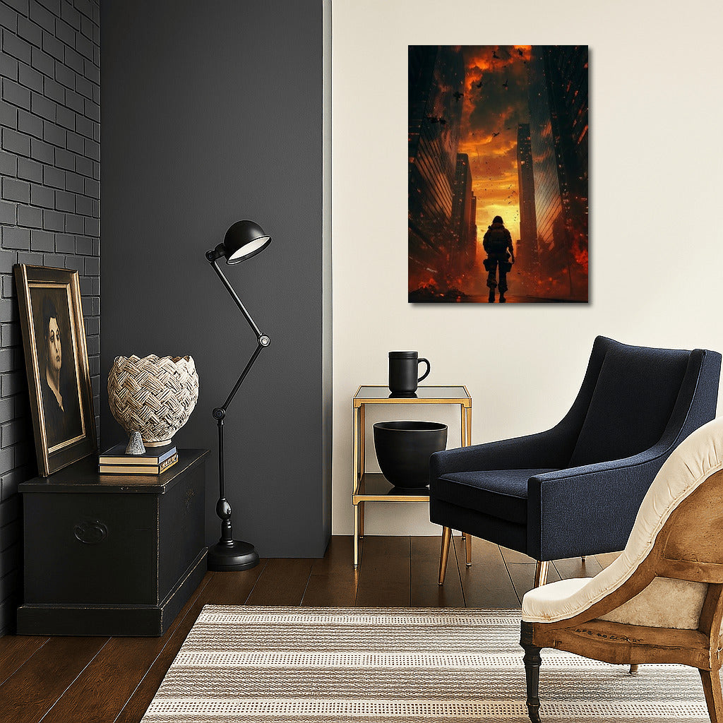 Urban Apocalypse: A silhouette of a man in front of a burning sky. Immerse yourself in the drama of post-apocalyptic wall art. See more from the collection: Mixed Wall Art