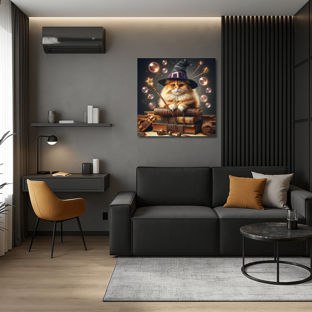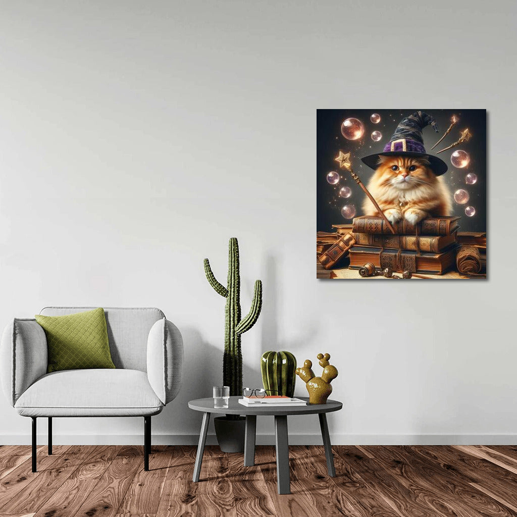 A charming cat in a wizard's hat is surrounded by the magic of books and stars. Add a little magic to your interior with this poster! See more from the collection: Animals Art