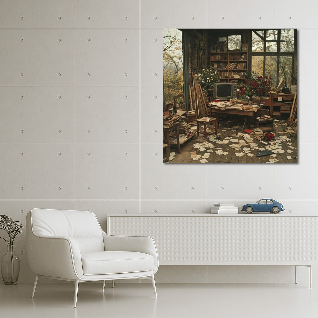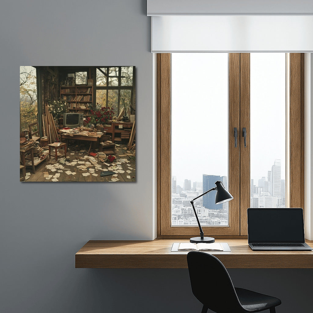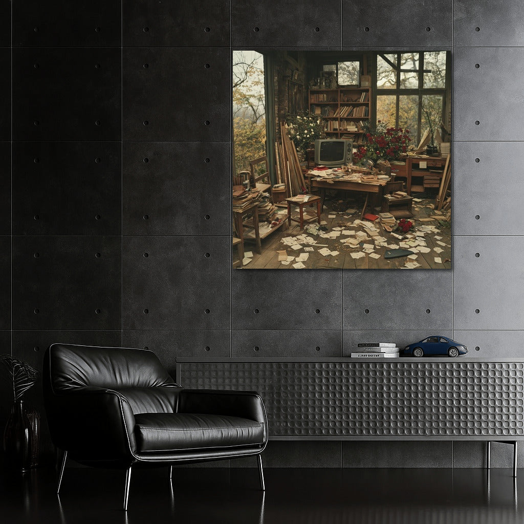 A poster of cozy creative chaos. Wall art where time stands still in the charm of an old office. See more from the collection: Mixed Wall Art