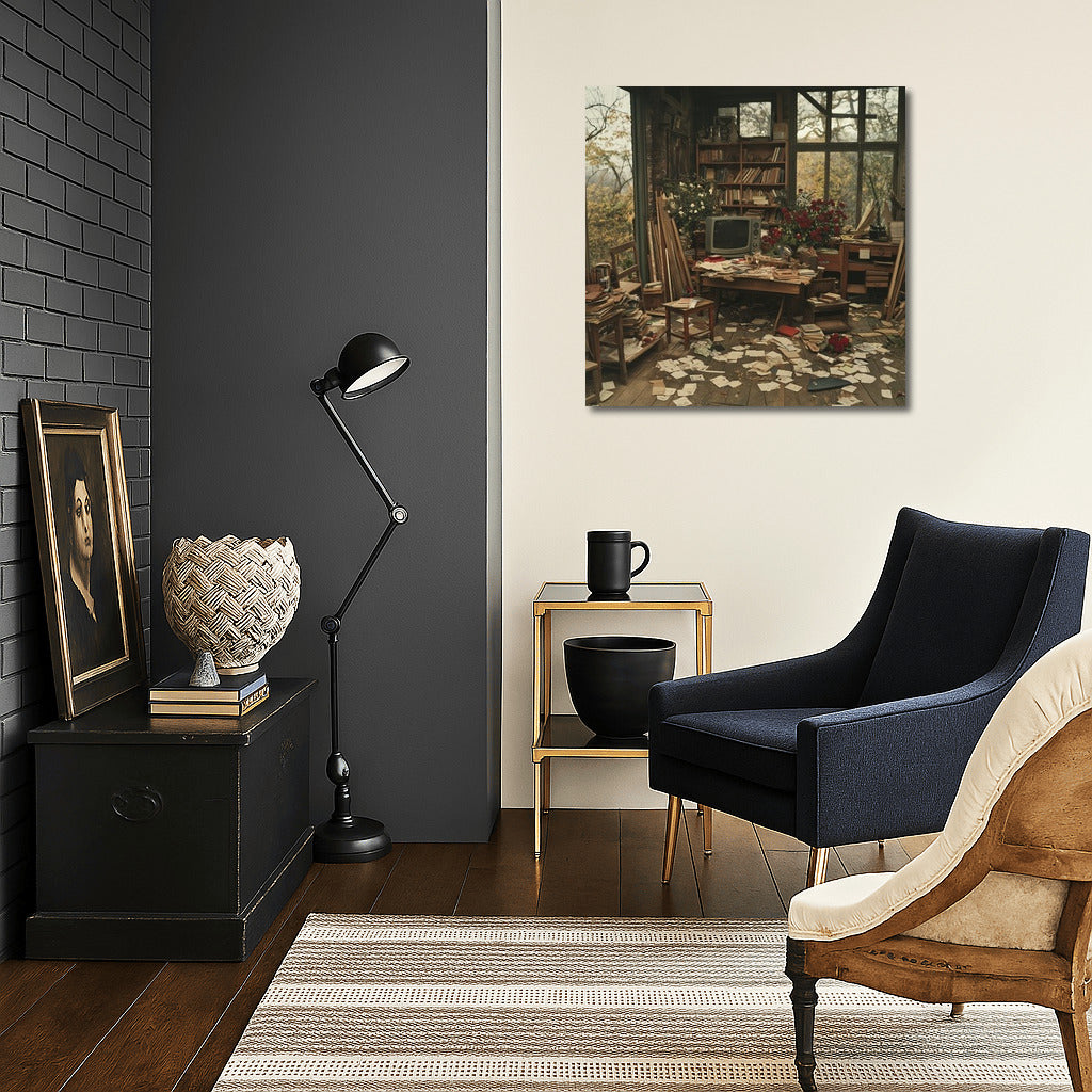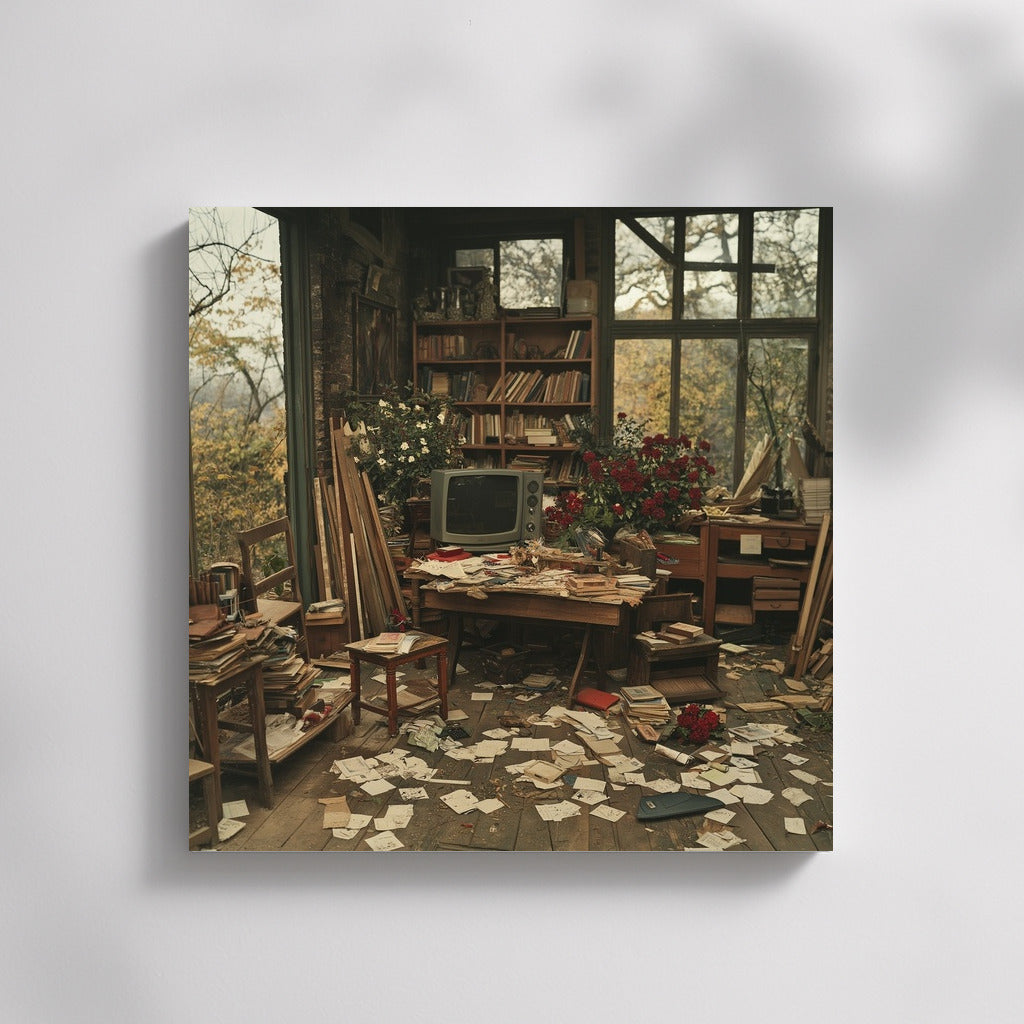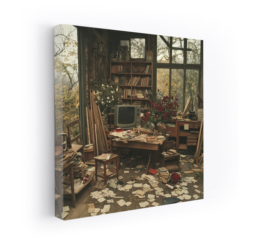 A poster of cozy creative chaos. Wall art where time stands still in the charm of an old office. See more from the collection: Mixed Wall Art