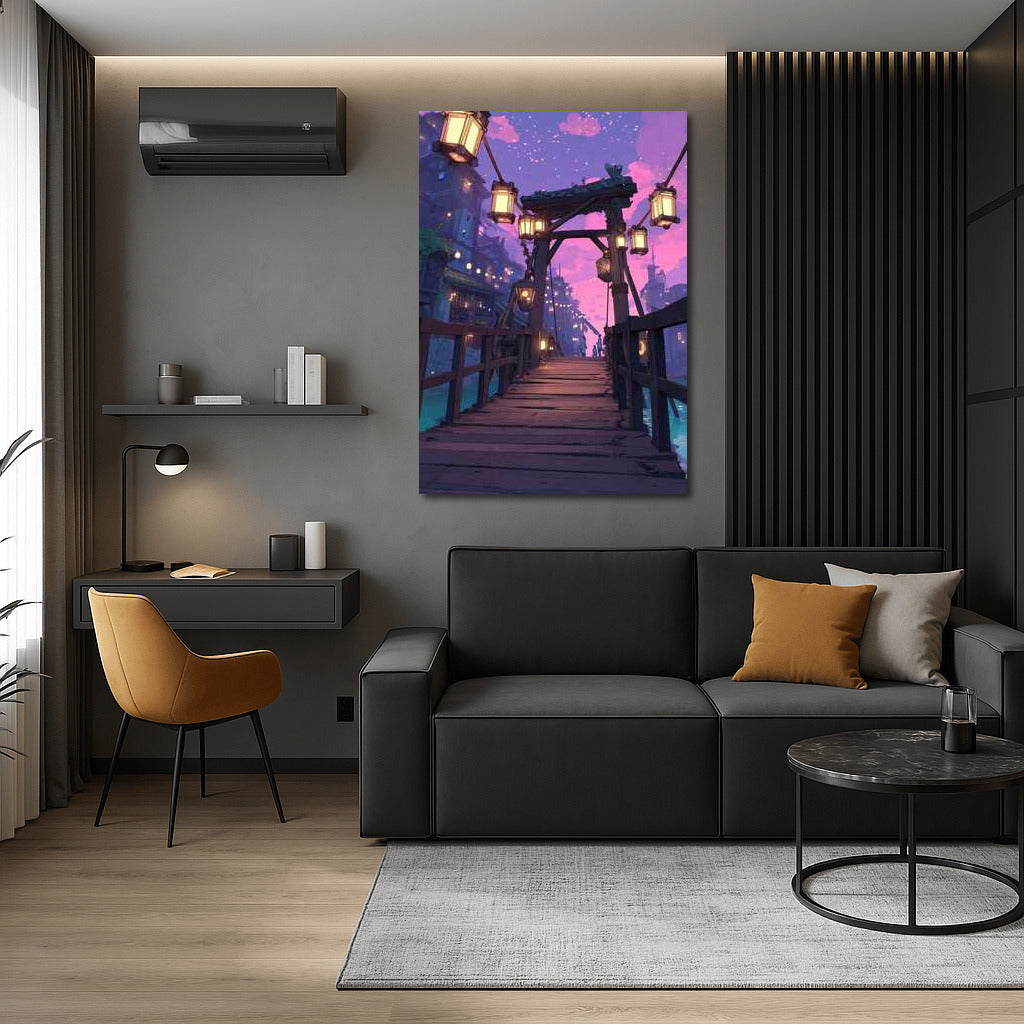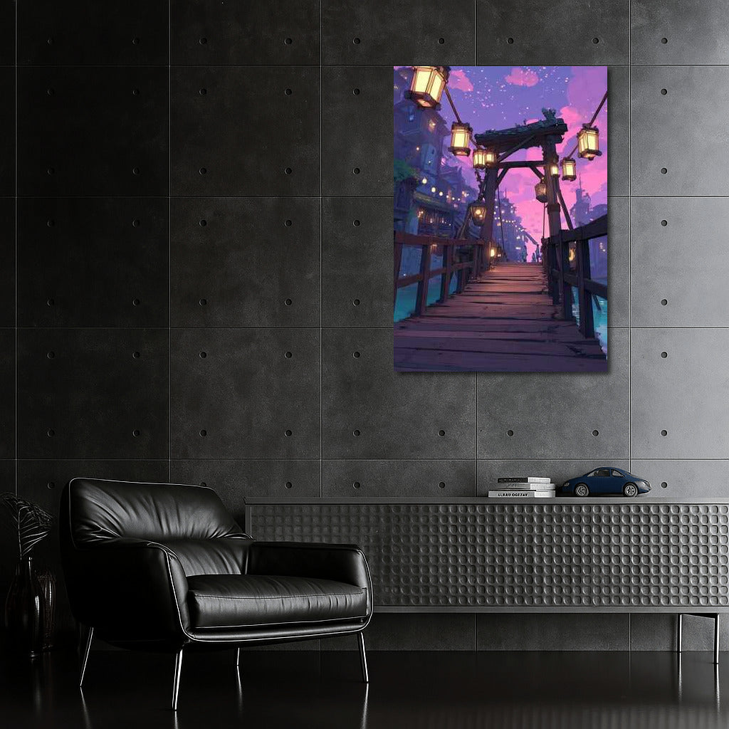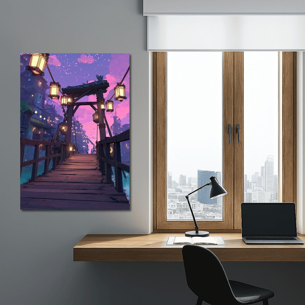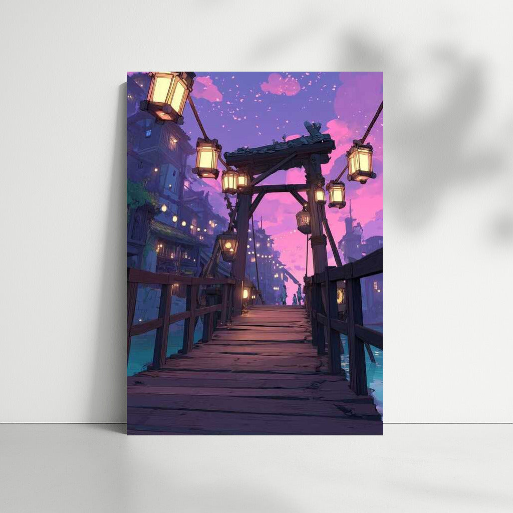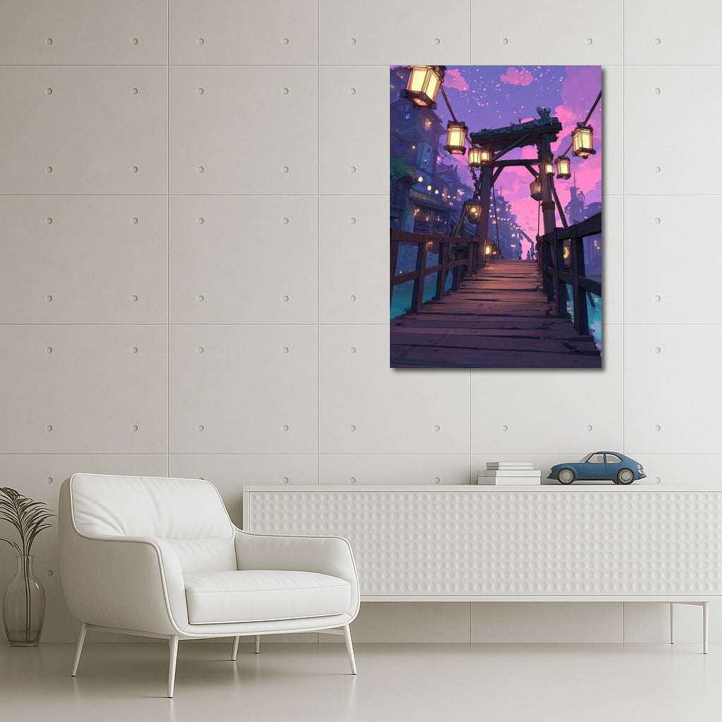 Enter a fantasy world with this painting: an architectural bridge illuminated by lanterns creates magical wall art. See more from the collection: Architectural Art
