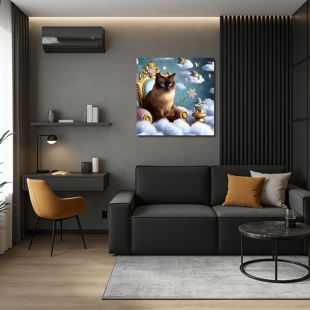 Burmese cat on a cloud throne creates weather with a magic wand. Magical wall art for dreamers! See more from the collection: Animals Art