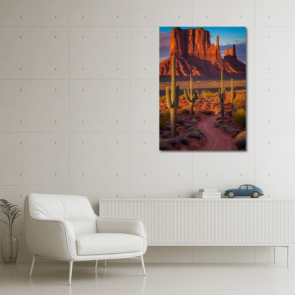 Get into the spirit of Arizona with this stunning poster featuring majestic cacti against the unforgettable backdrop of the Wild West. See more from the collection: Country Art
