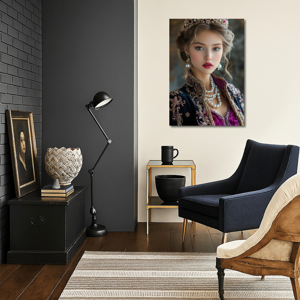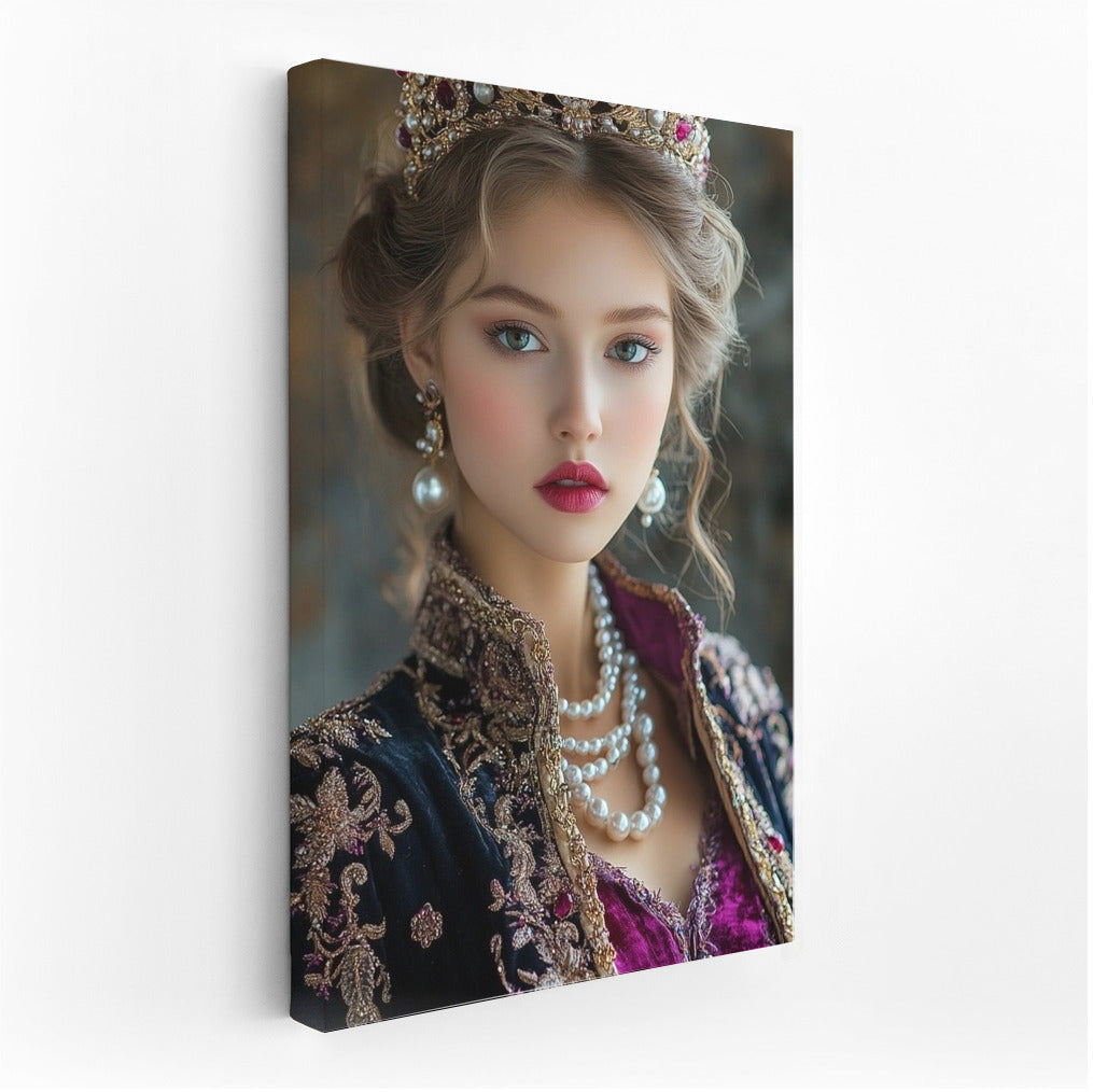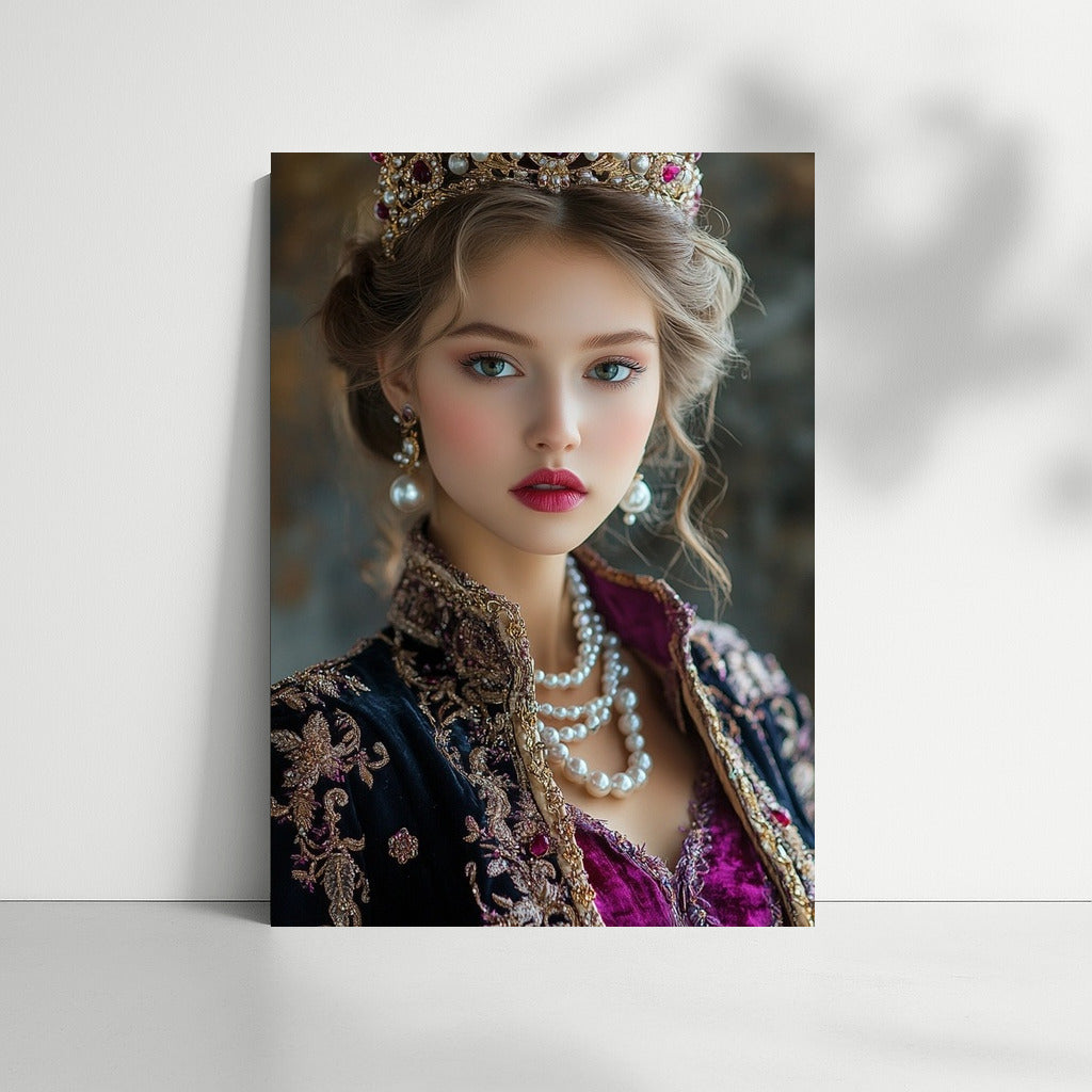 An elegant painting of a royal person wearing a luxurious crown. This wall art will add elegance to your interior. See more from the collection: Wall Art with Women