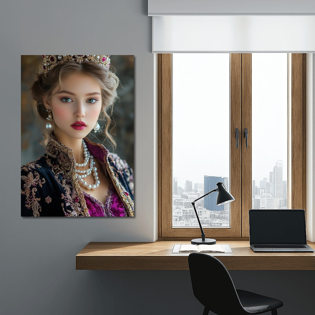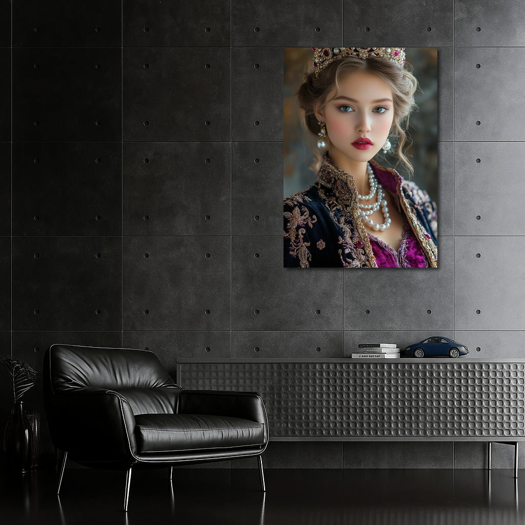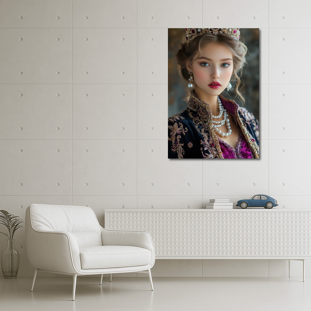 An elegant painting of a royal person wearing a luxurious crown. This wall art will add elegance to your interior. See more from the collection: Wall Art with Women