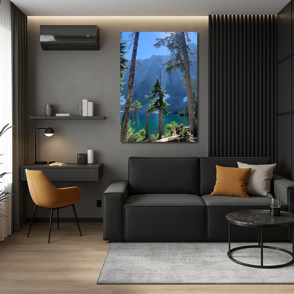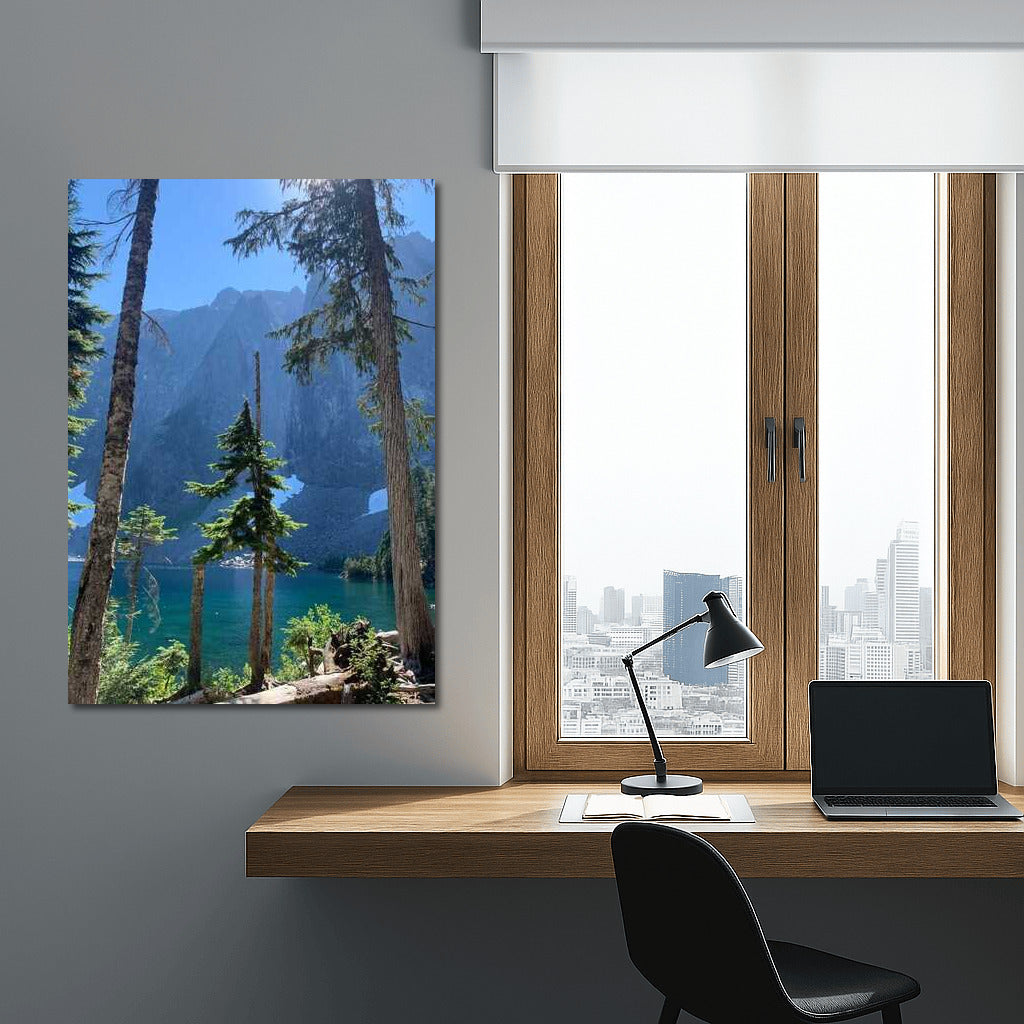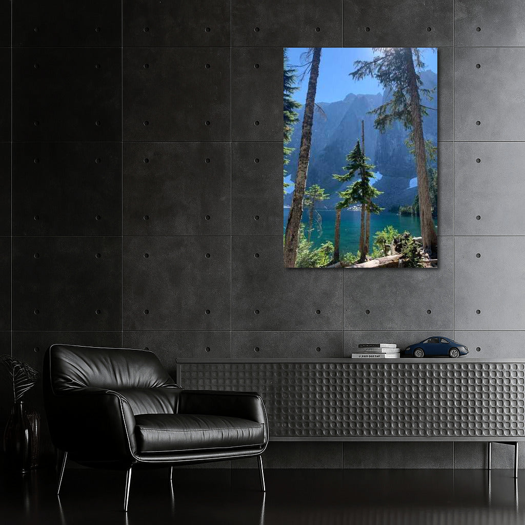 The poster captivates with the beauty of virgin nature: majestic mountains and turquoise lake Washington. Wall art for the soul. See more from the collection: Country Art