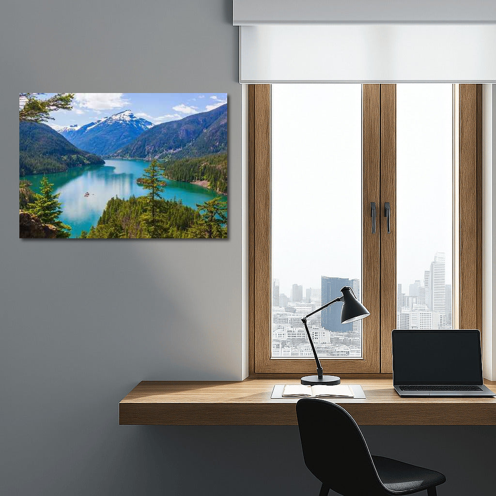 Poster with breathtaking view of mountains and lake of Washington. Feel the grandeur of nature of USA in wall art. See more from the collection: Country Art