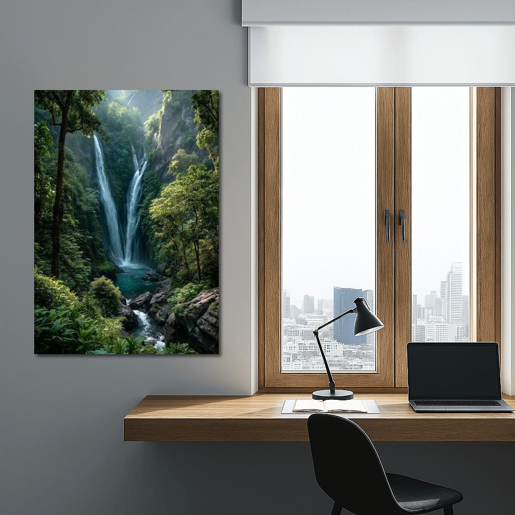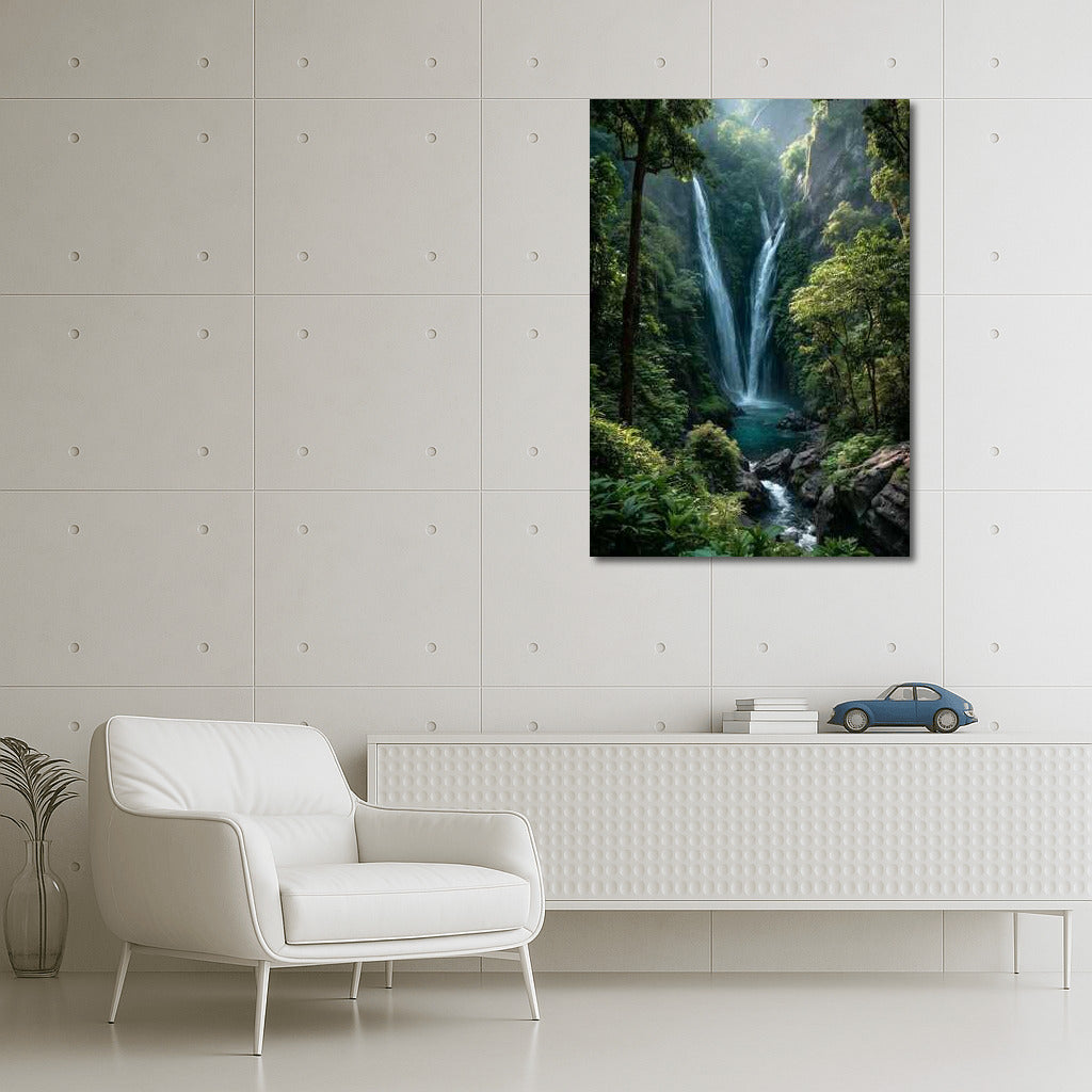 Immerse yourself in the world of nature's magic with this poster: majestic waterfalls framed by green landscapes are mesmerizing. See more from the collection: Nature & Landscapes Art