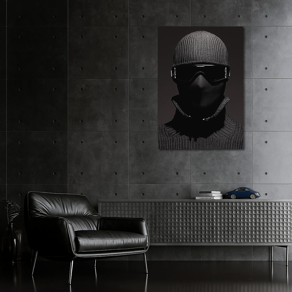 Mysterious figure in a black mask: a poster for those who appreciate stylish and modern wall art in a minimalist spirit. See more from the collection: Mixed Wall Art