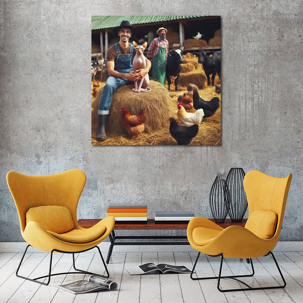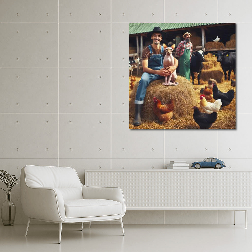 In this painting Sphynx On a Rural Farm 2, farm life comes to life with chickens, hay, and a mysterious sphynx. Wall art for a cozy feel. See more from the collection: Animals Art