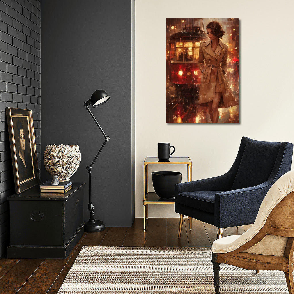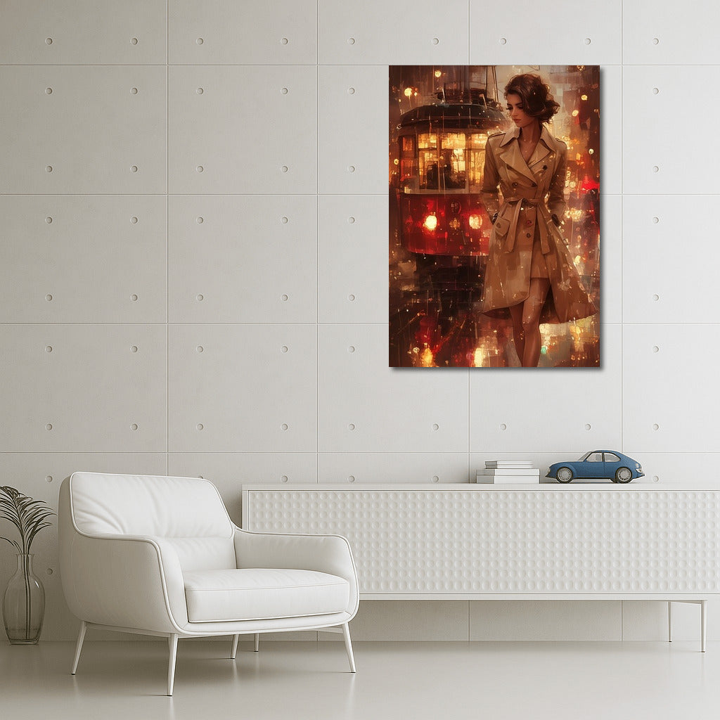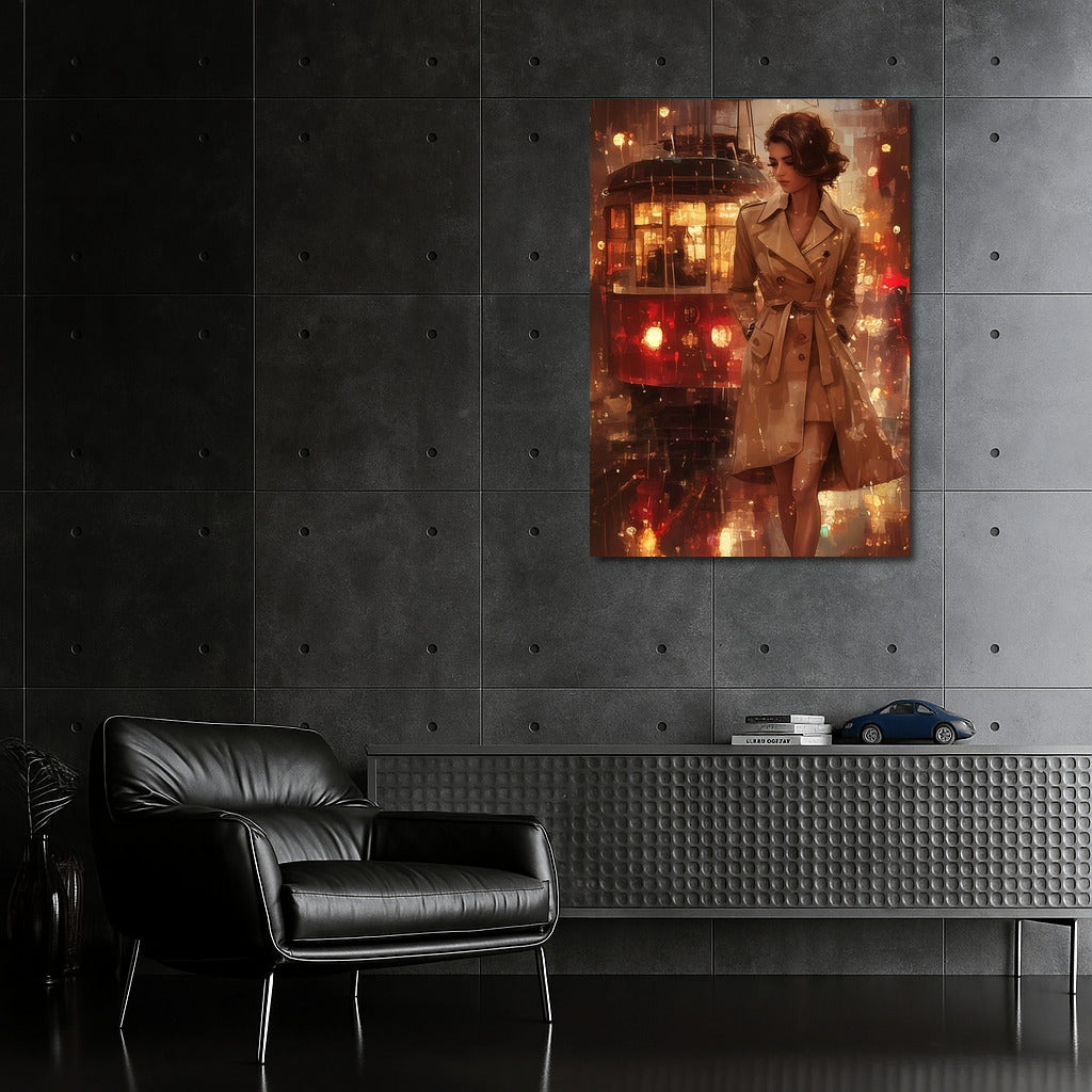 An elegant figure in a cloak and a city tram in the glow of lights - exquisite wall art for your space. See more from the collection: Mixed Wall Art