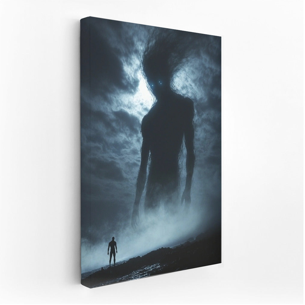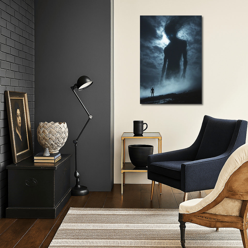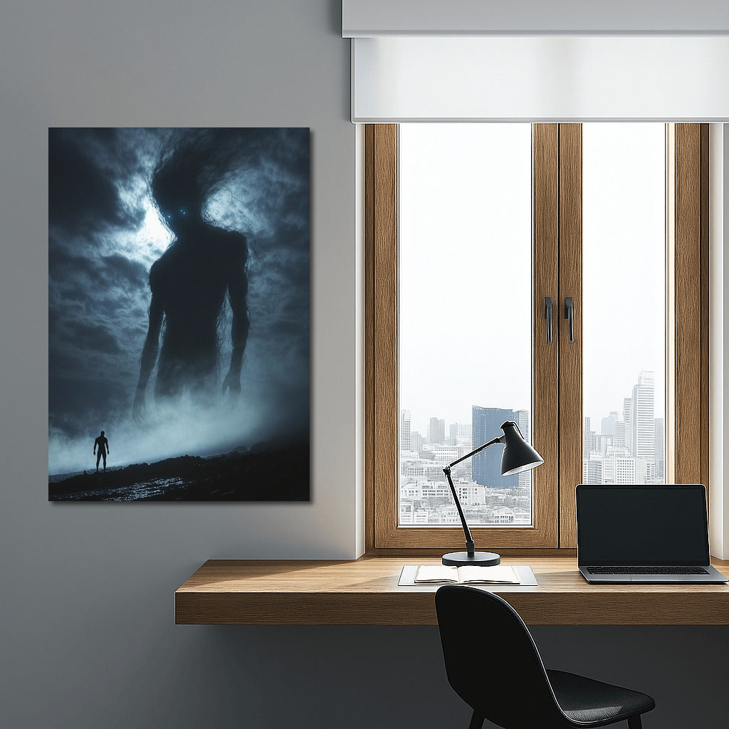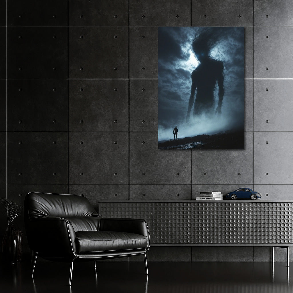 Mystery and grandeur: an enigmatic silhouette rises in the night. The painting immerses you in an atmosphere of mysticism and fantasy. Wall art. See more from the collection: Mixed Wall Art