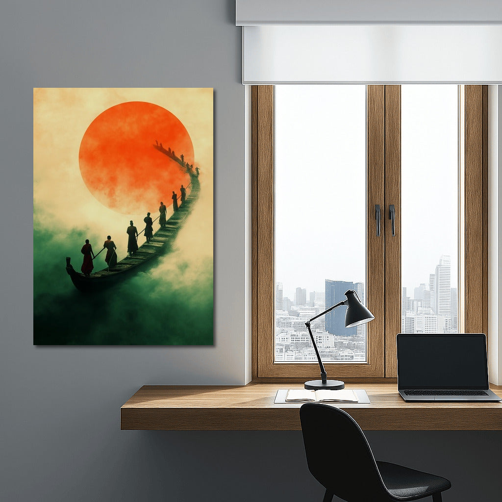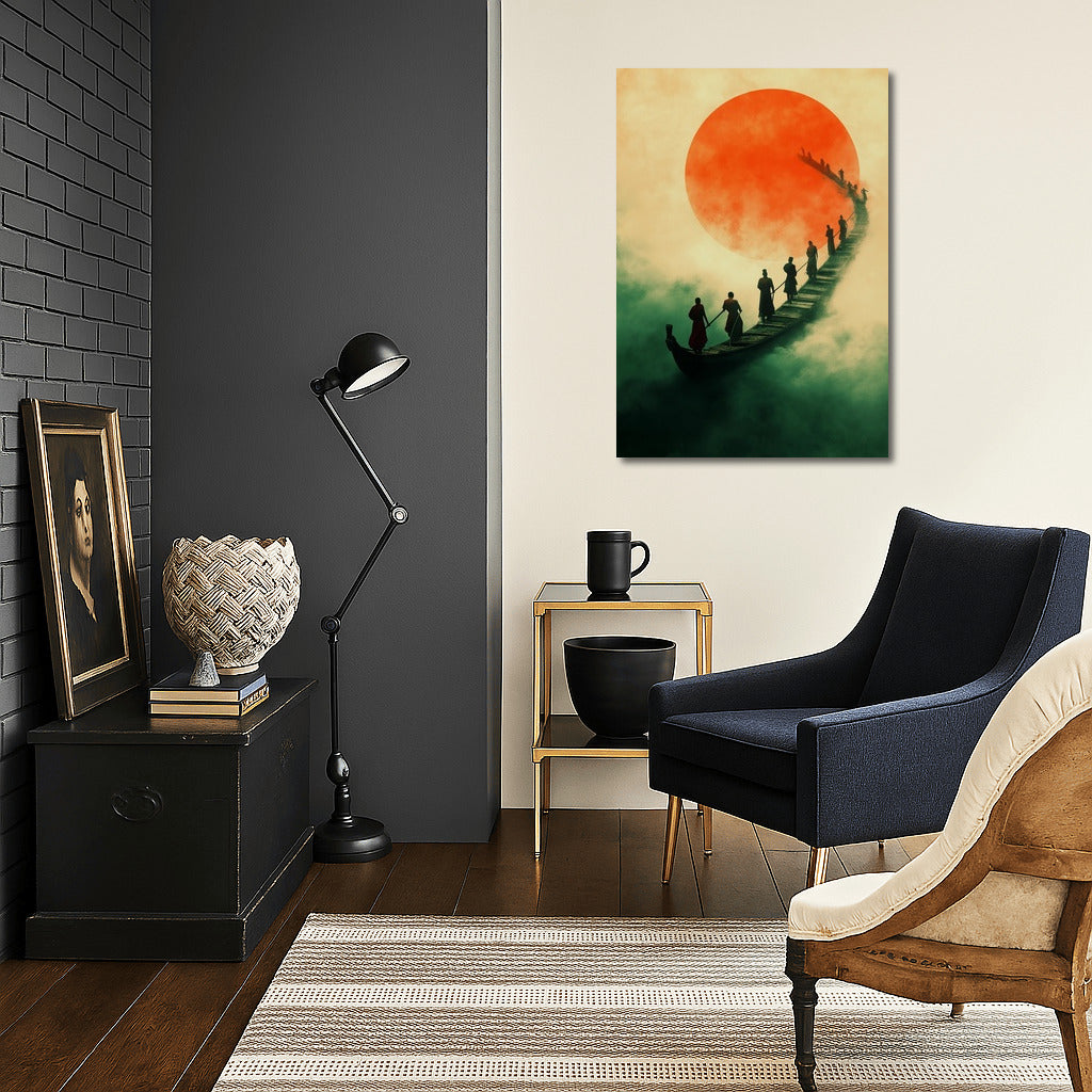 Mystery and inspiration: poster with figures on the bridge to the sun. Beautiful wall art for dreamers and adventurers! See more from the collection: Mixed Wall Art