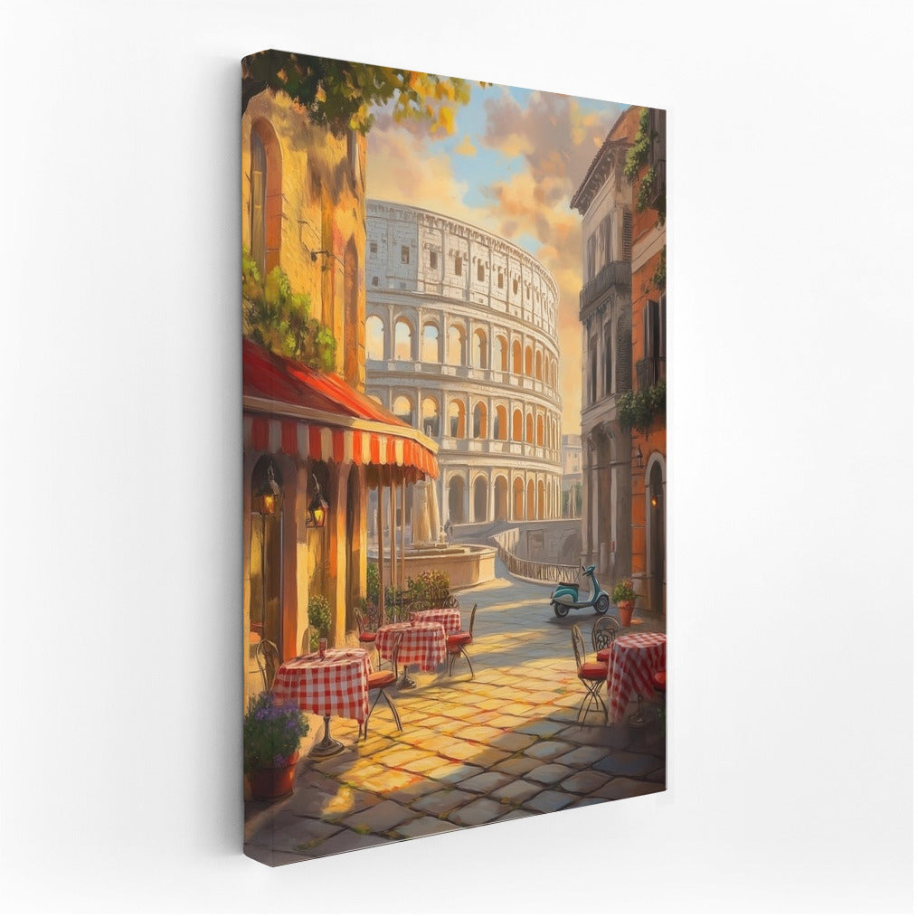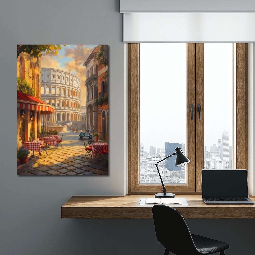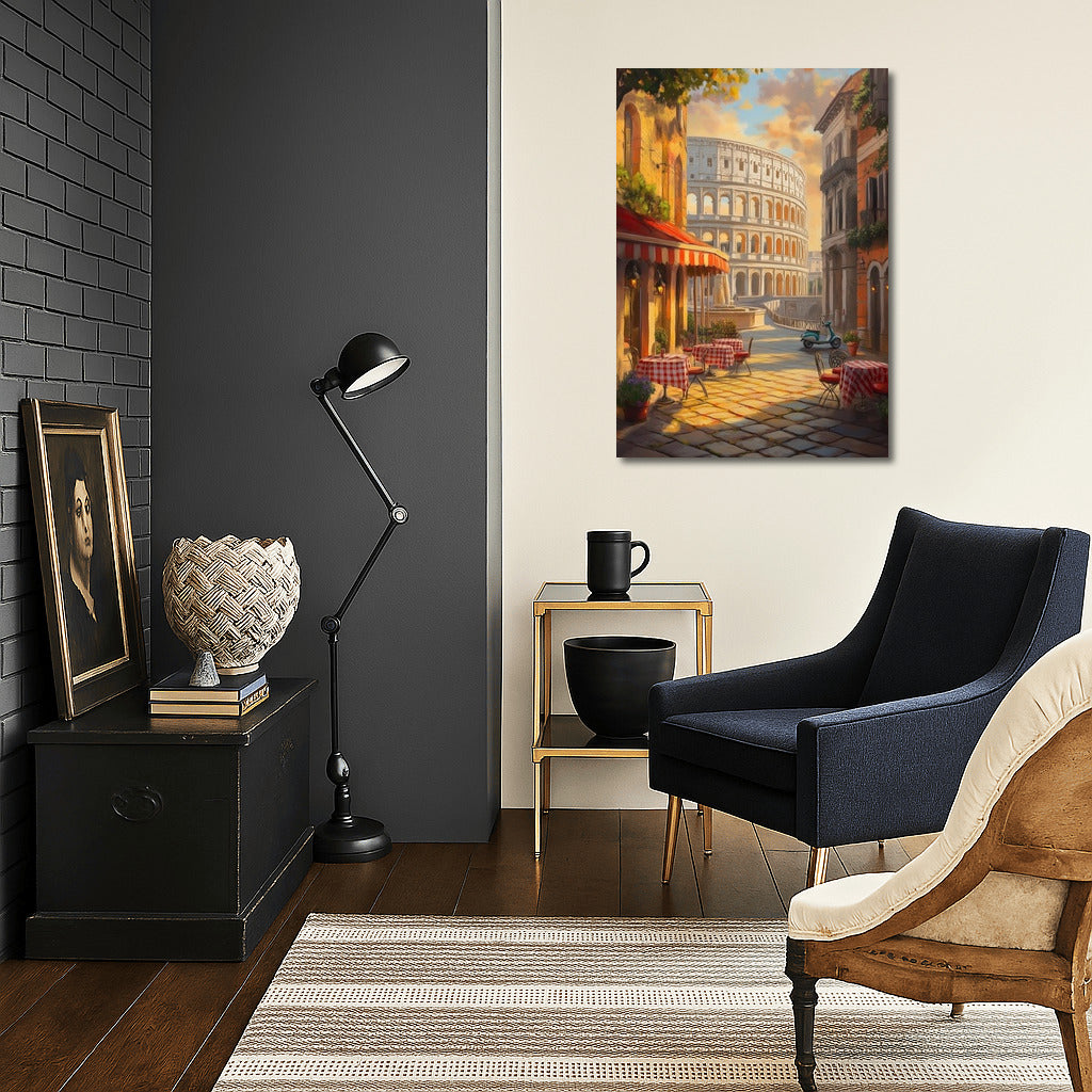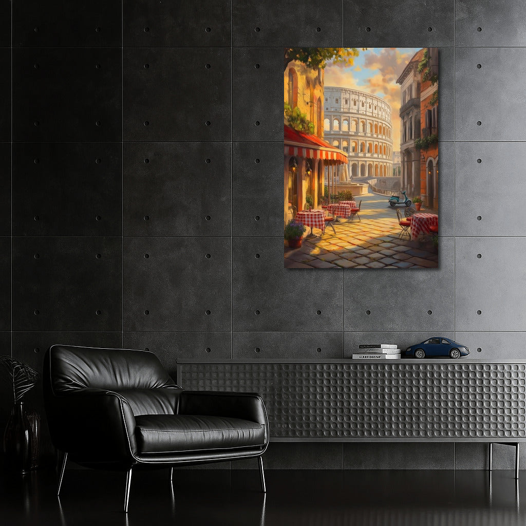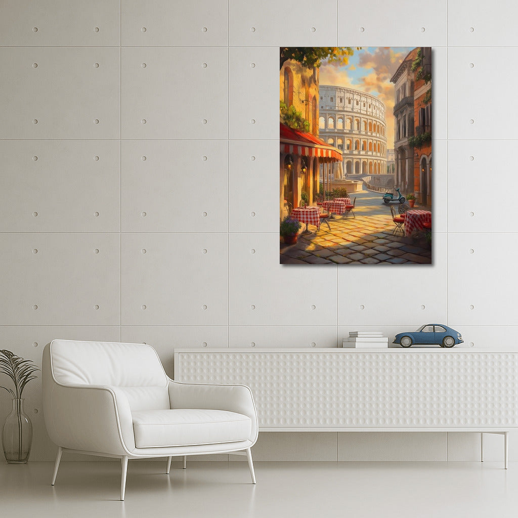 A charming painting of a Roman street leading to the Colosseum. Wall art that is filled with Italian flair. See more from the collection: Cityscapes & Skylines Art