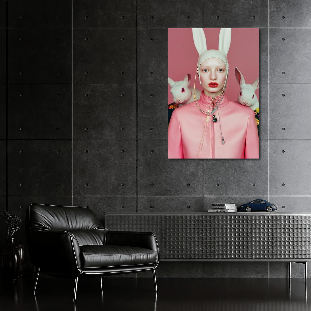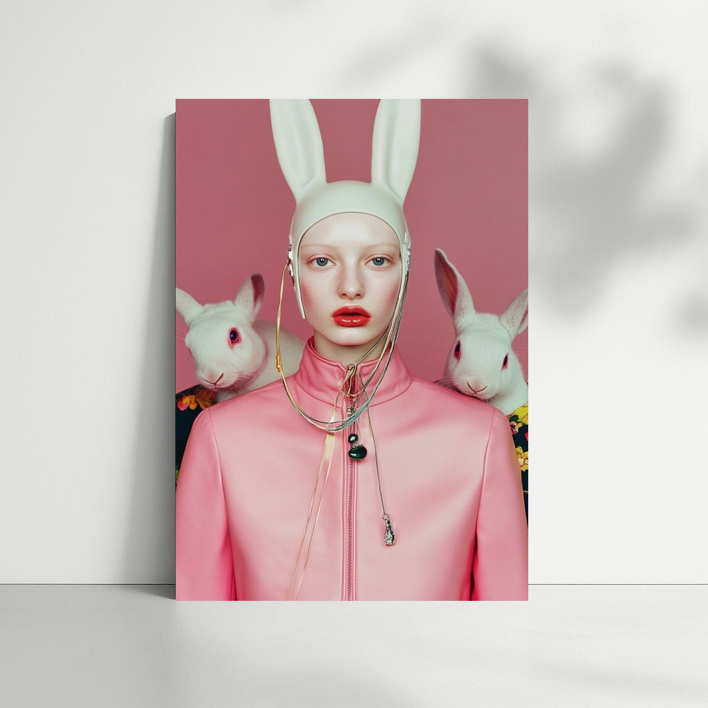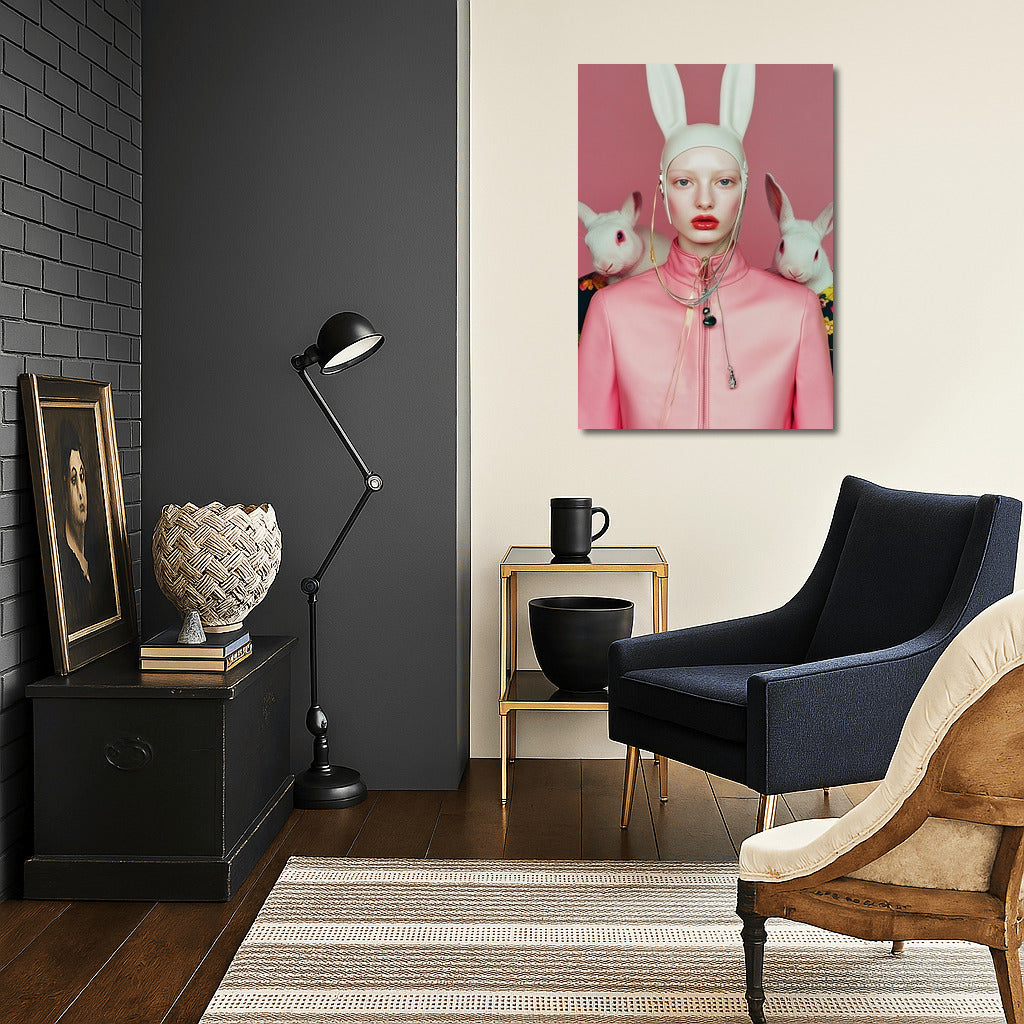 A mysterious figure in pink surrounded by snow-white rabbits, this poster will be a bold accent to your wall art. See more from the collection: Mixed Wall Art