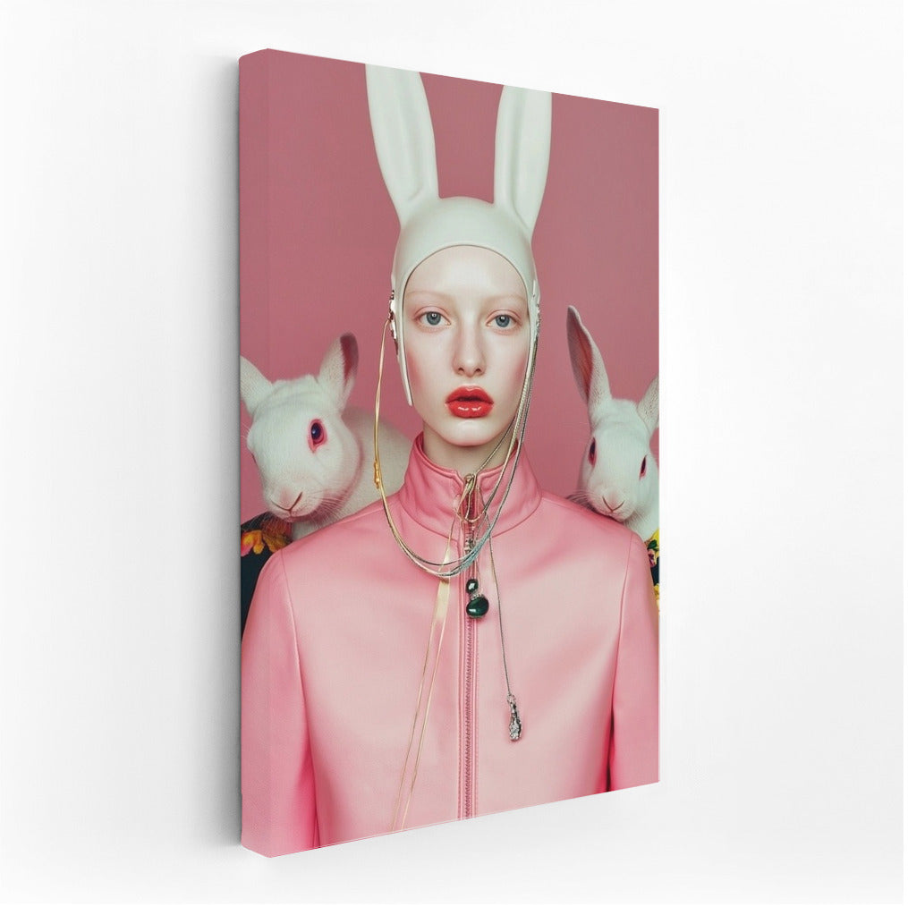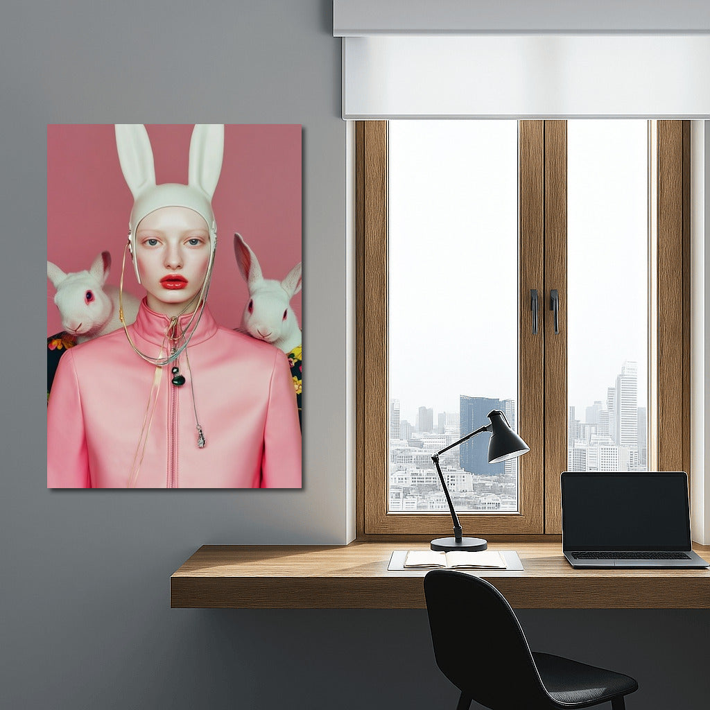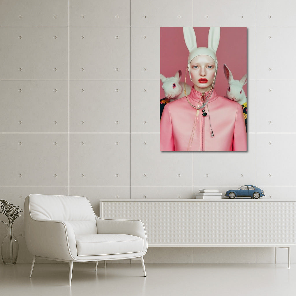 A mysterious figure in pink surrounded by snow-white rabbits, this poster will be a bold accent to your wall art. See more from the collection: Mixed Wall Art
