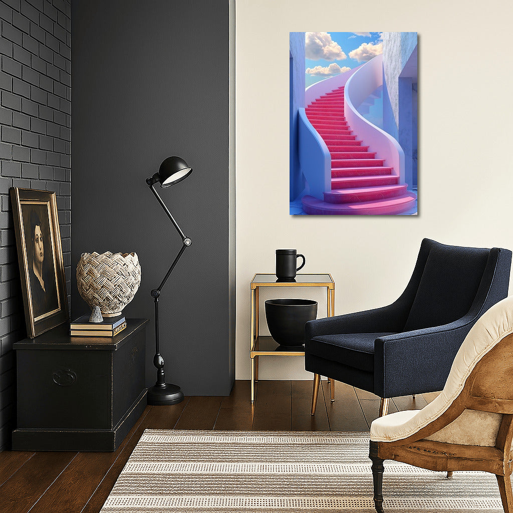 A vibrant painting of a pink staircase leading to heaven. This poster will liven up any space with its unique design! See more from the collection: Mixed Wall Art