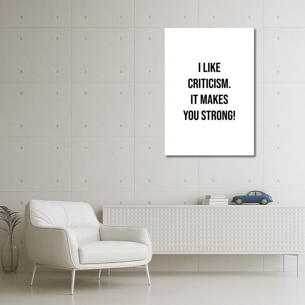 Wall art for true leaders. I like criticism. It makes you strong! Motivation and inspiration that are always with you. See more from the collection: Inspirational & Motivational Quotes Art