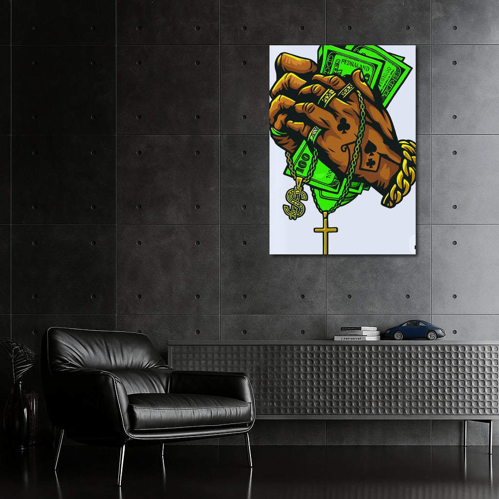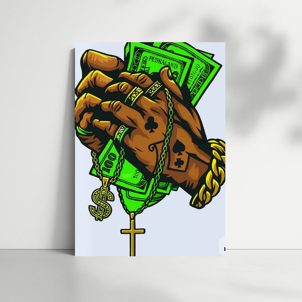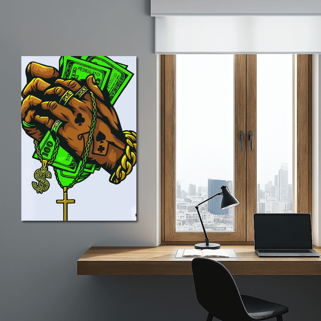 A stylish poster with symbols of wealth: tightly squeezed banknotes and jewelry - an accent in your wall art. See more from the collection: Money Art