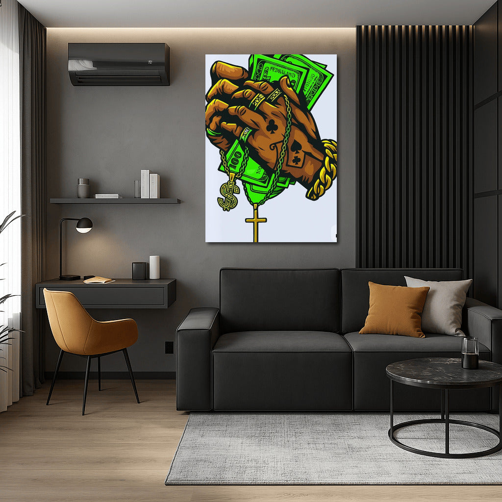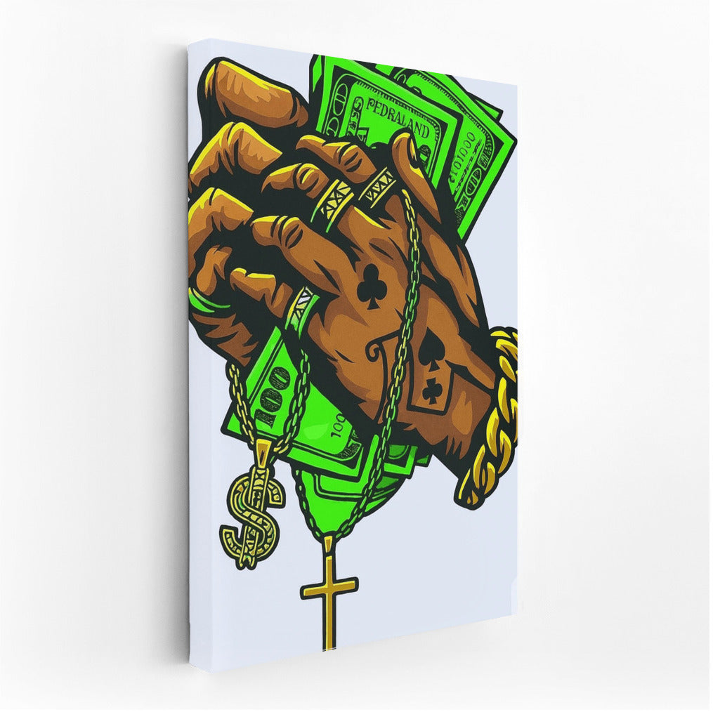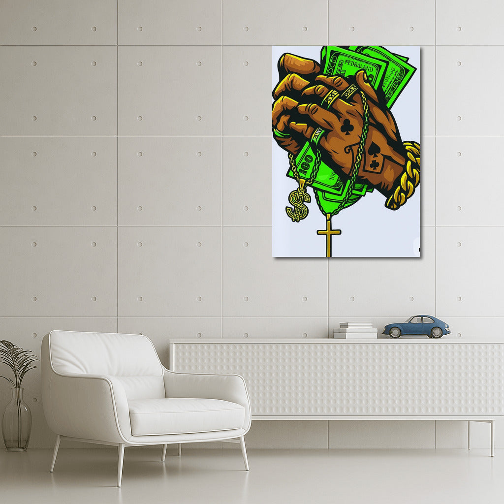 A stylish poster with symbols of wealth: tightly squeezed banknotes and jewelry - an accent in your wall art. See more from the collection: Money Art