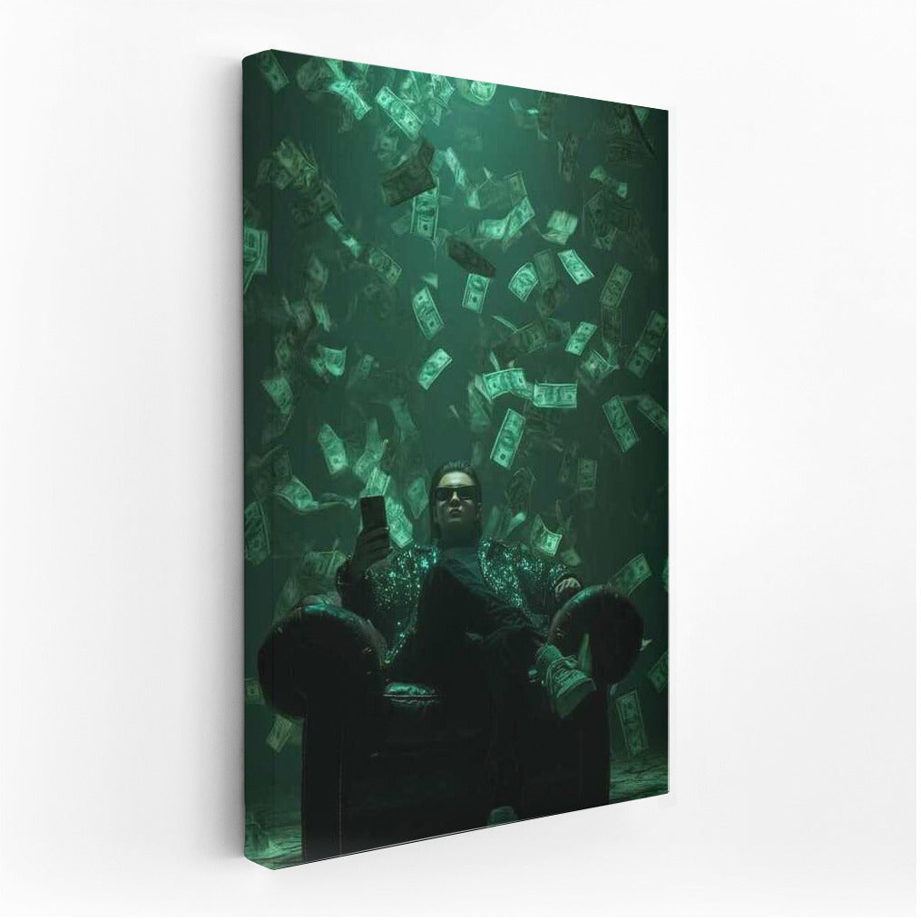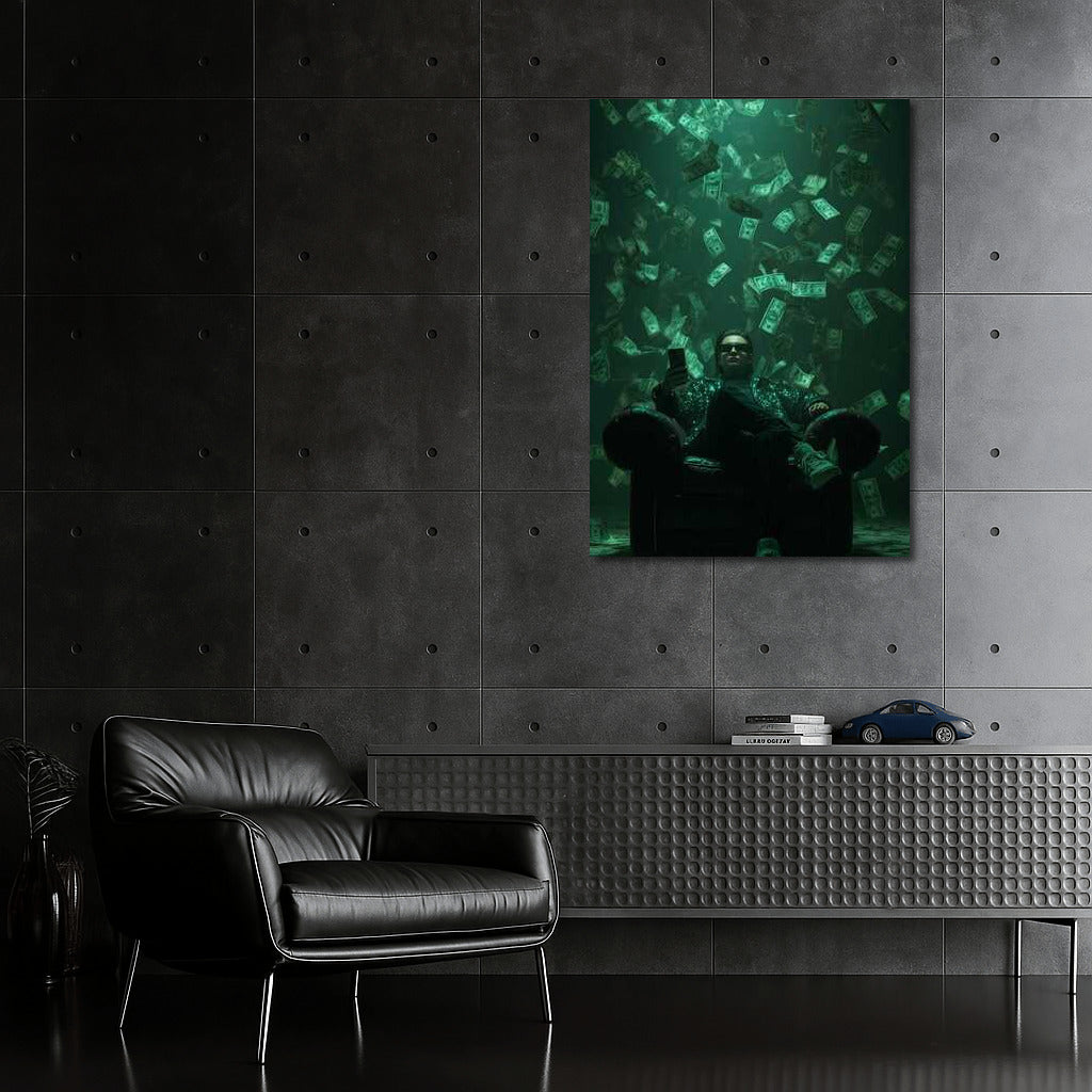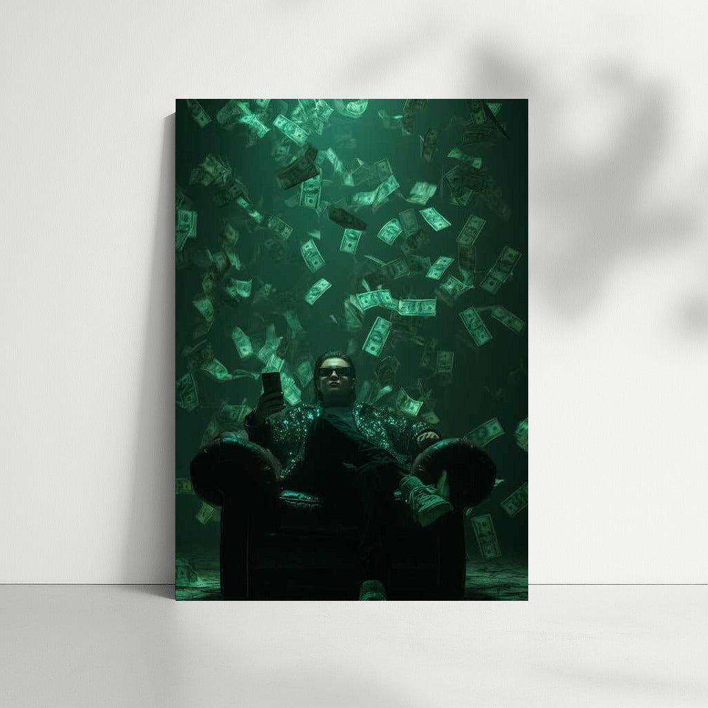 A whirlwind of banknotes around a calm figure. This poster will become a bright accent of your space, symbolizing power and success. See more from the collection: Money Art