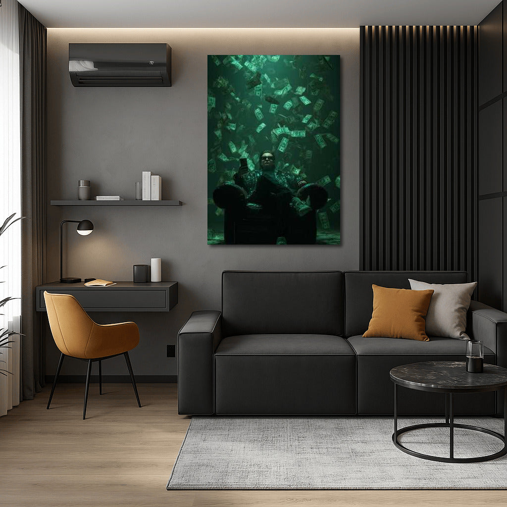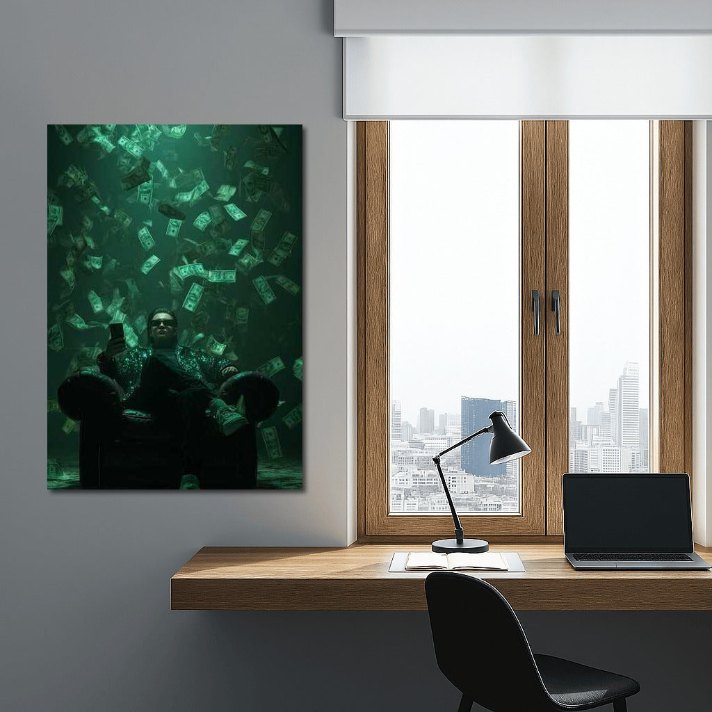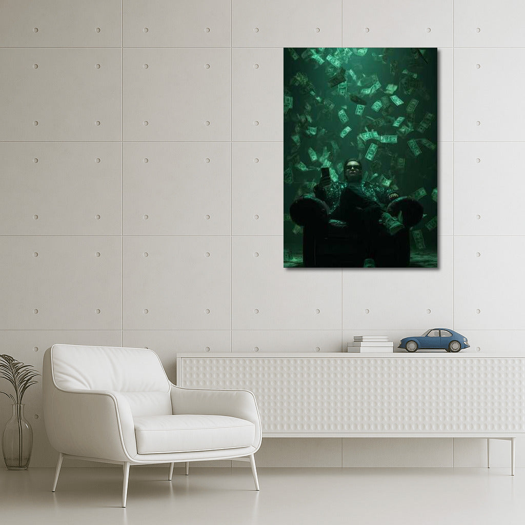 A whirlwind of banknotes around a calm figure. This poster will become a bright accent of your space, symbolizing power and success. See more from the collection: Money Art