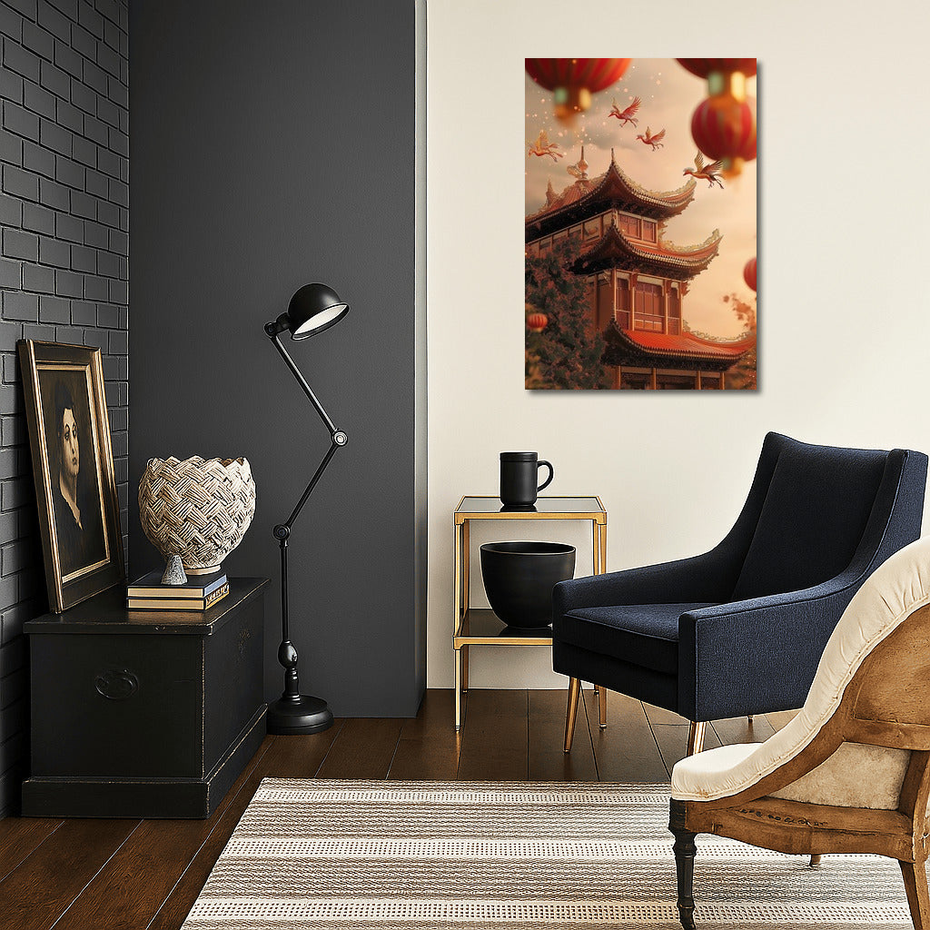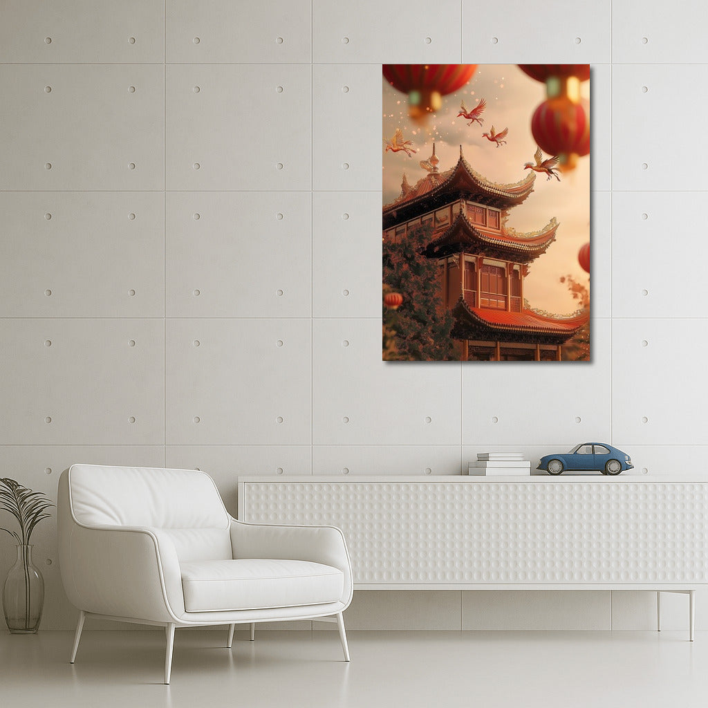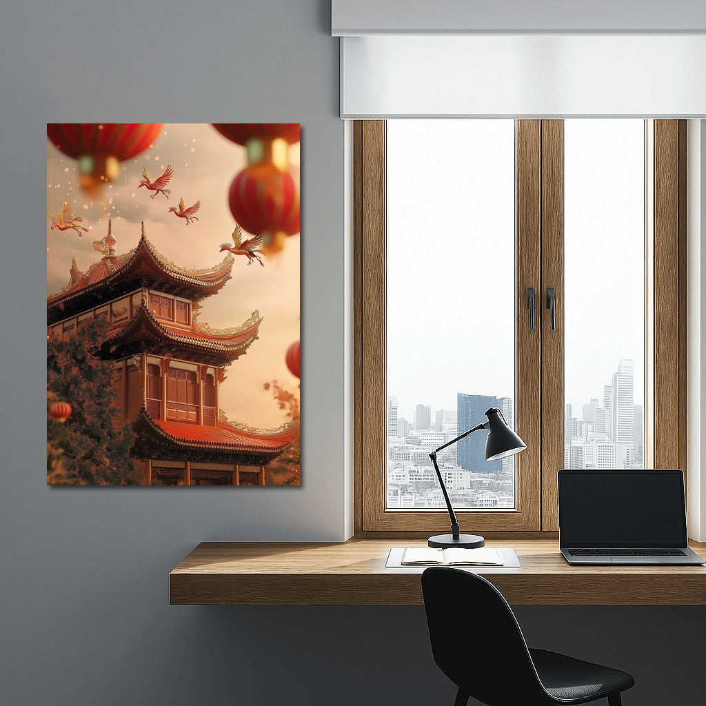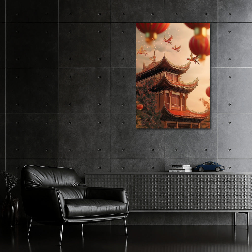 Immerse yourself in the magic of the East with this painting: air lanterns and mystical birds over an ancient palace. Dream wall art. See more from the collection: Mixed Wall Art