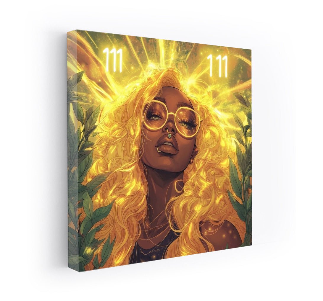 Poster with a charming girl surrounded by glow and plants. Wall art that attracts attention and inspiration. See more from the collection: Mixed Wall Art