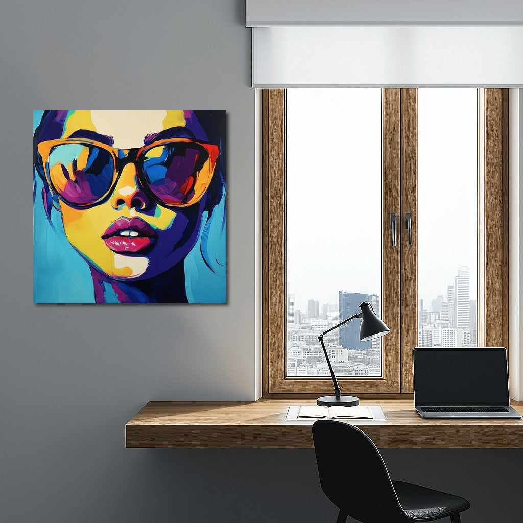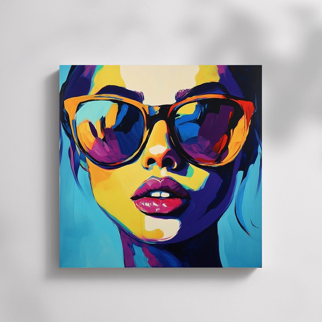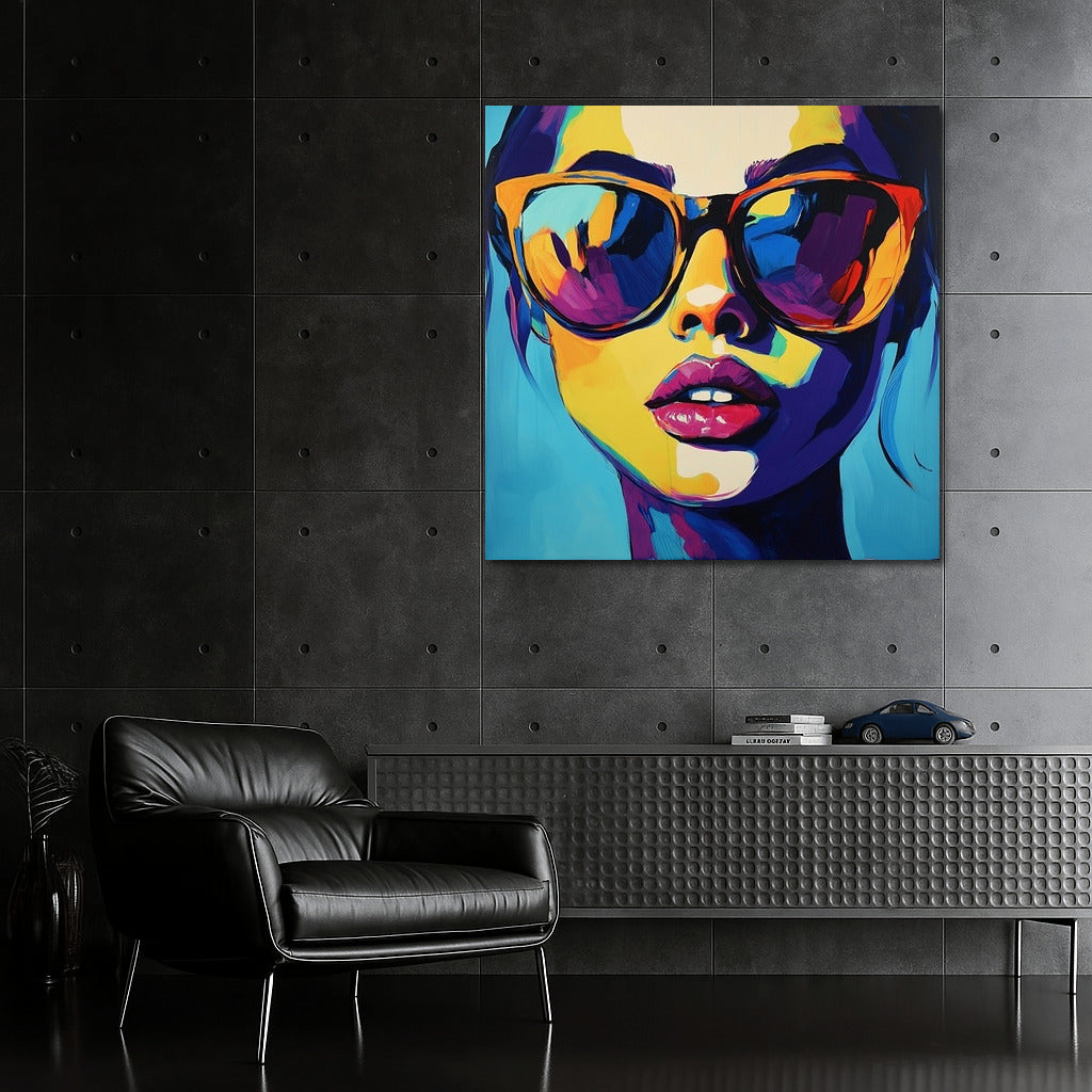 A bright poster with an abstract face in glasses - stylish wall art, will liven up any space. Pop art in every stroke! See more from the collection: Pop Art