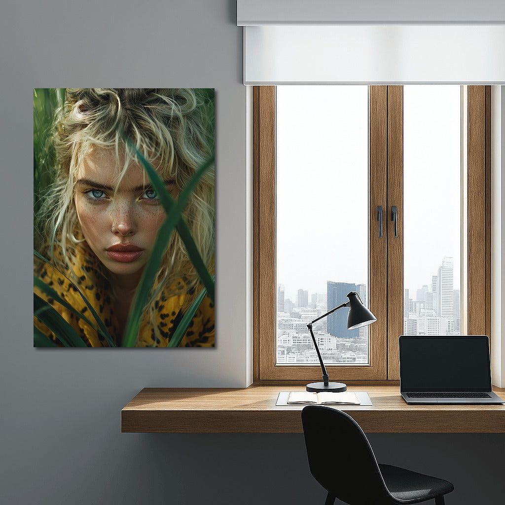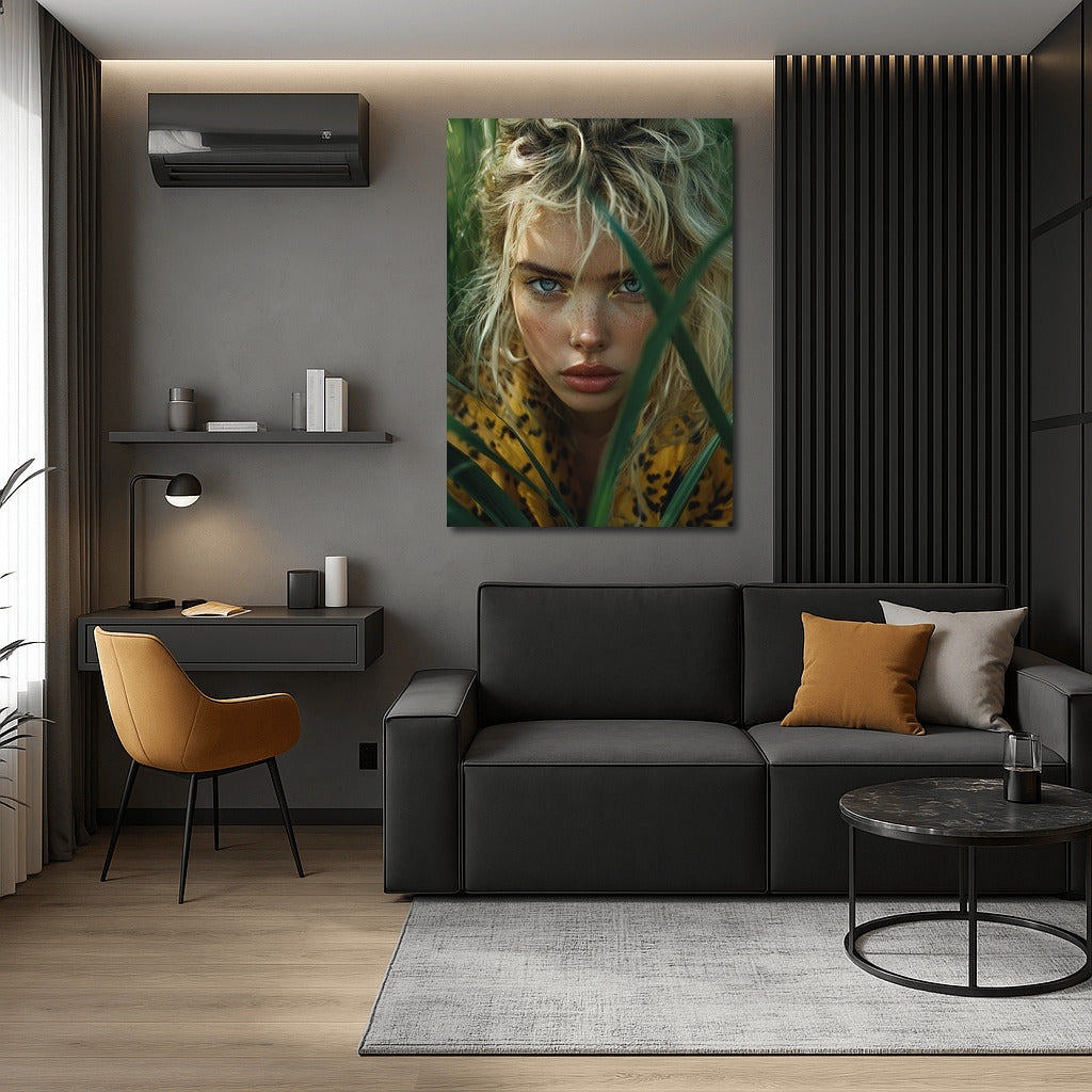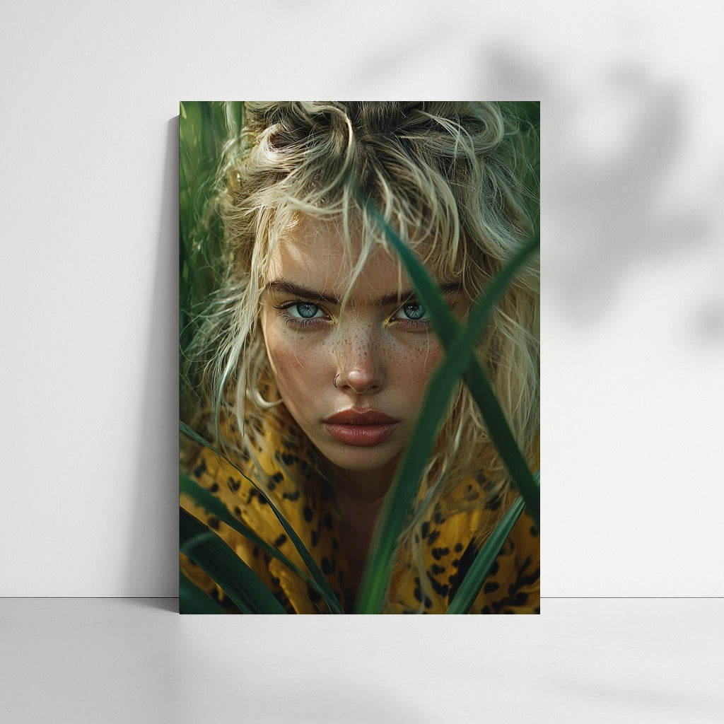 Bright poster: a mysterious look from green foliage. Art coming to life on the wall will add mystery to your interior. See more from the collection: Wall Art with Women