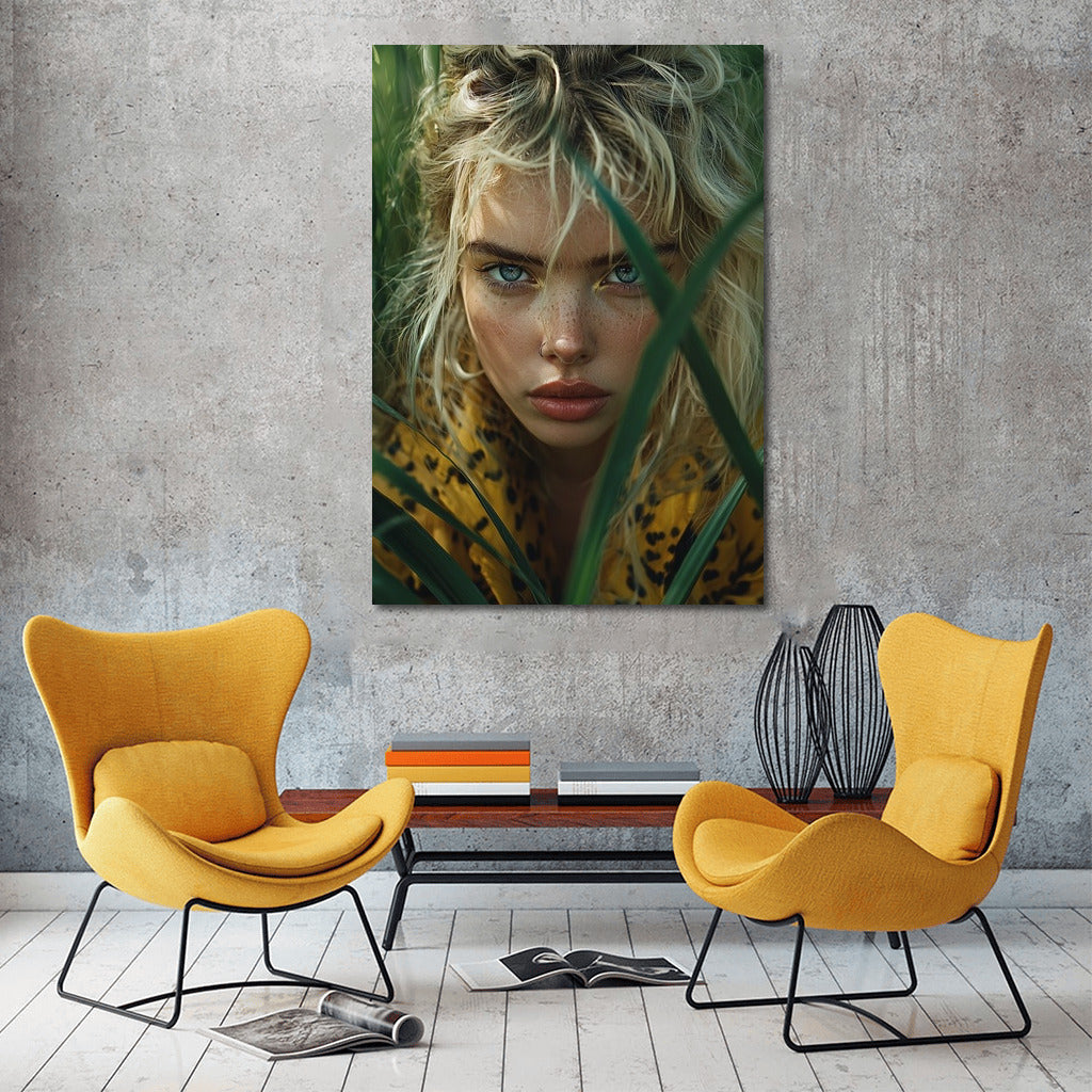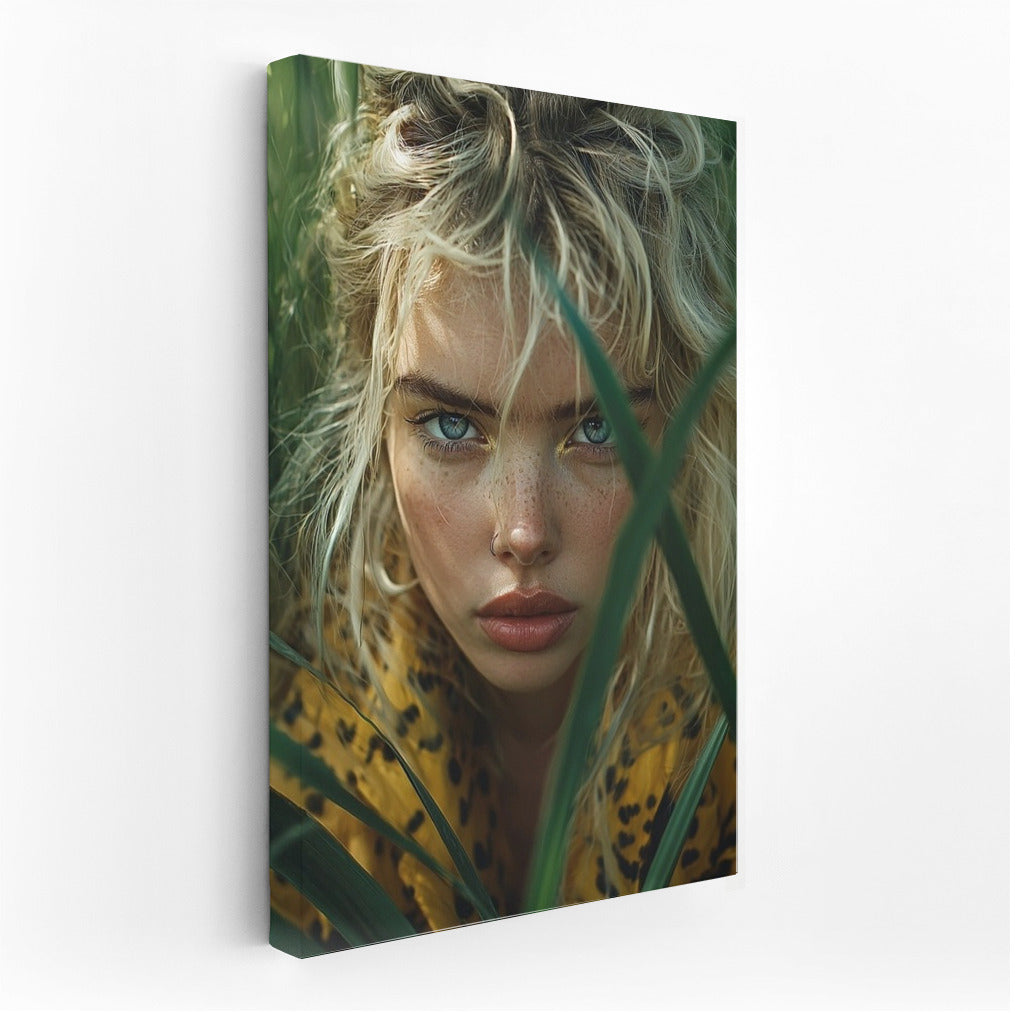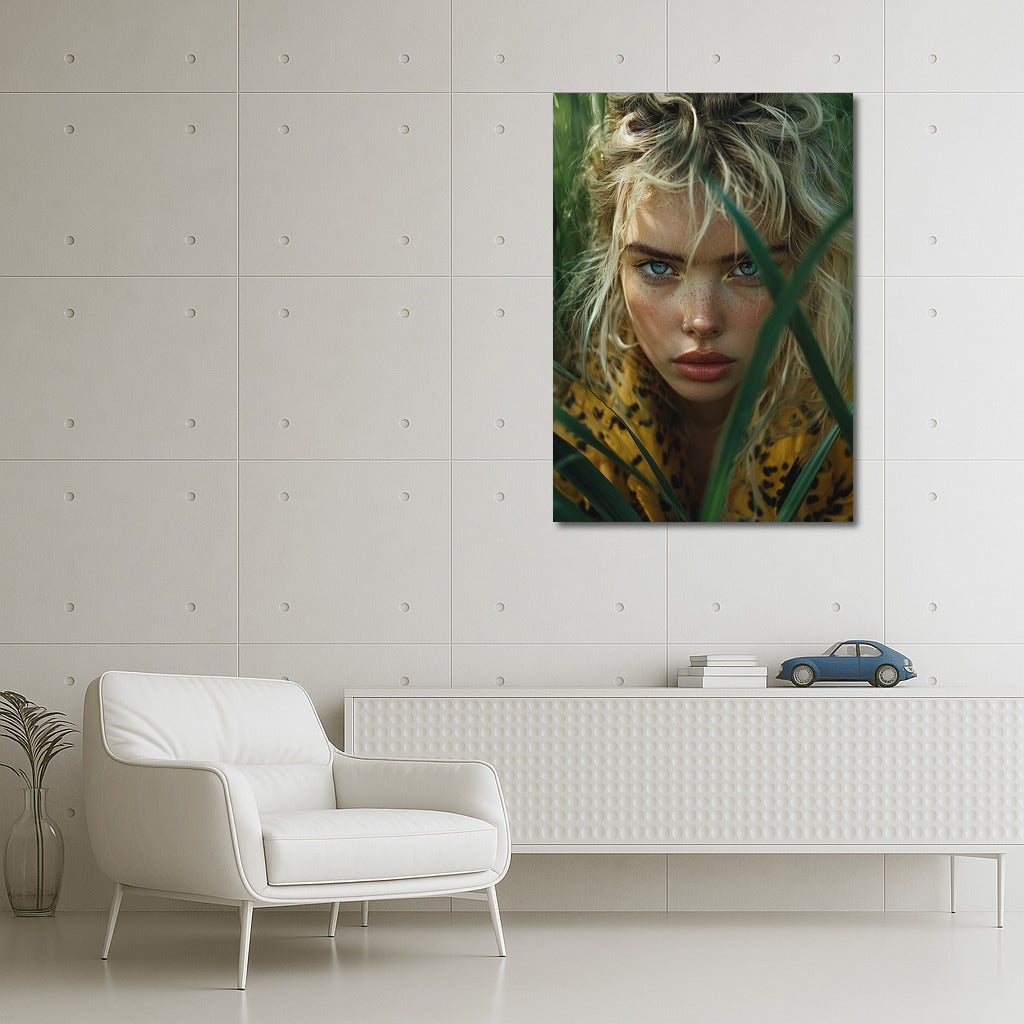 Bright poster: a mysterious look from green foliage. Art coming to life on the wall will add mystery to your interior. See more from the collection: Wall Art with Women