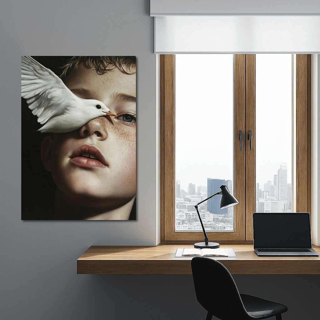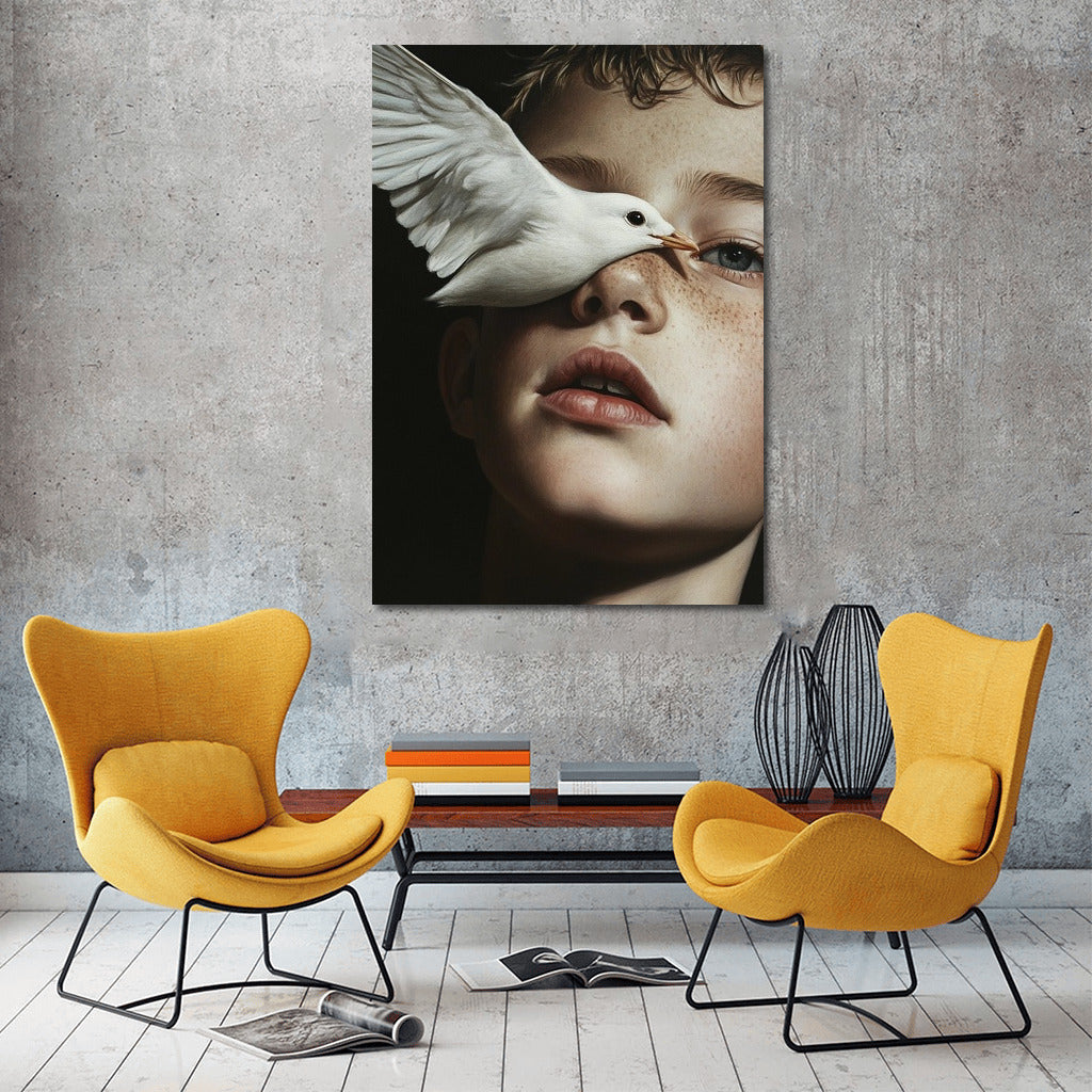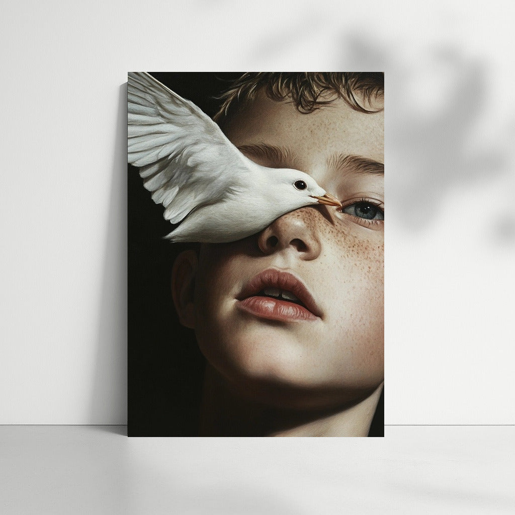 Dive into a dream with this painting: the gentle flight of a bird and a thoughtful look. A poster that inspires and enchants. See more from the collection: Mixed Wall Art