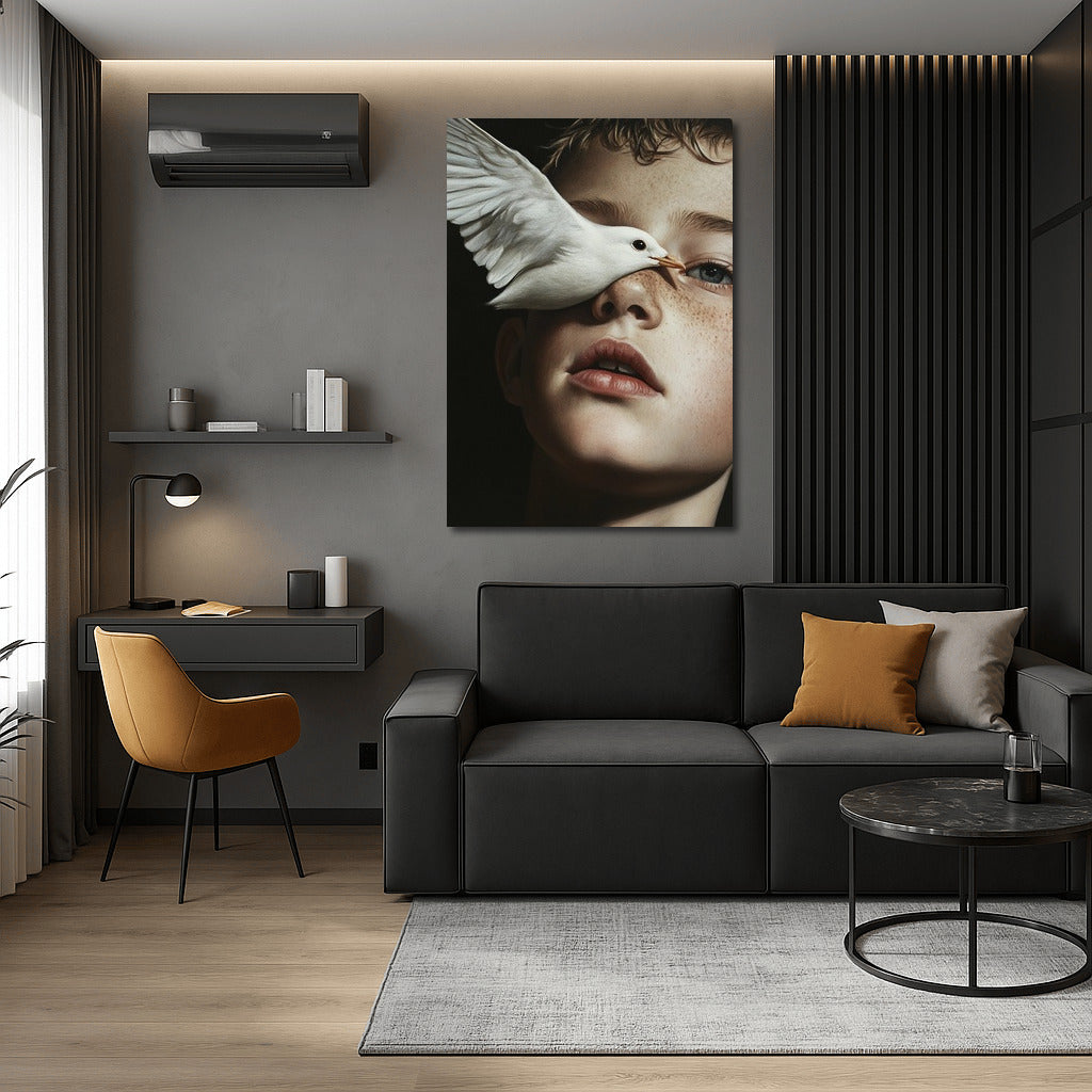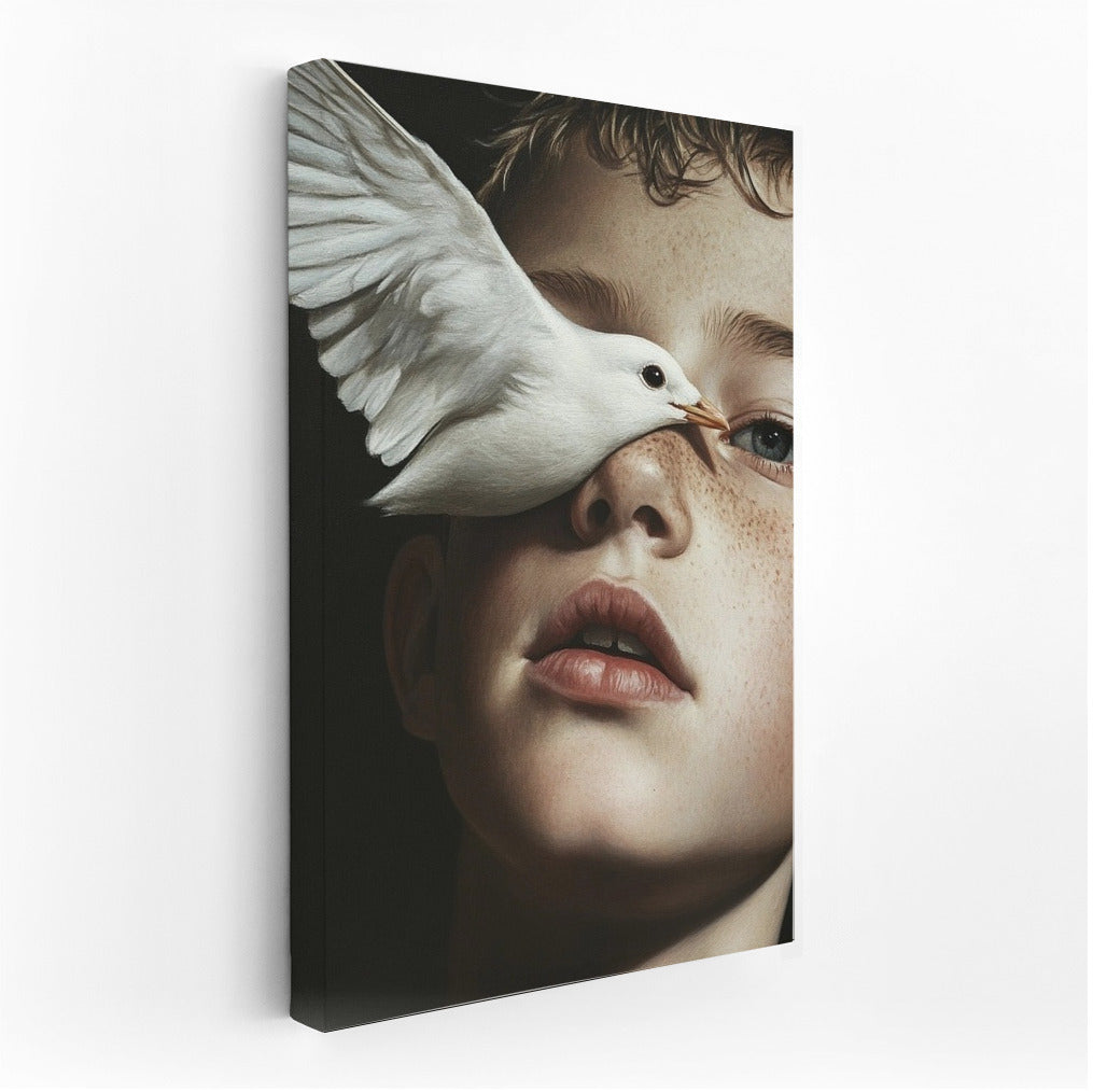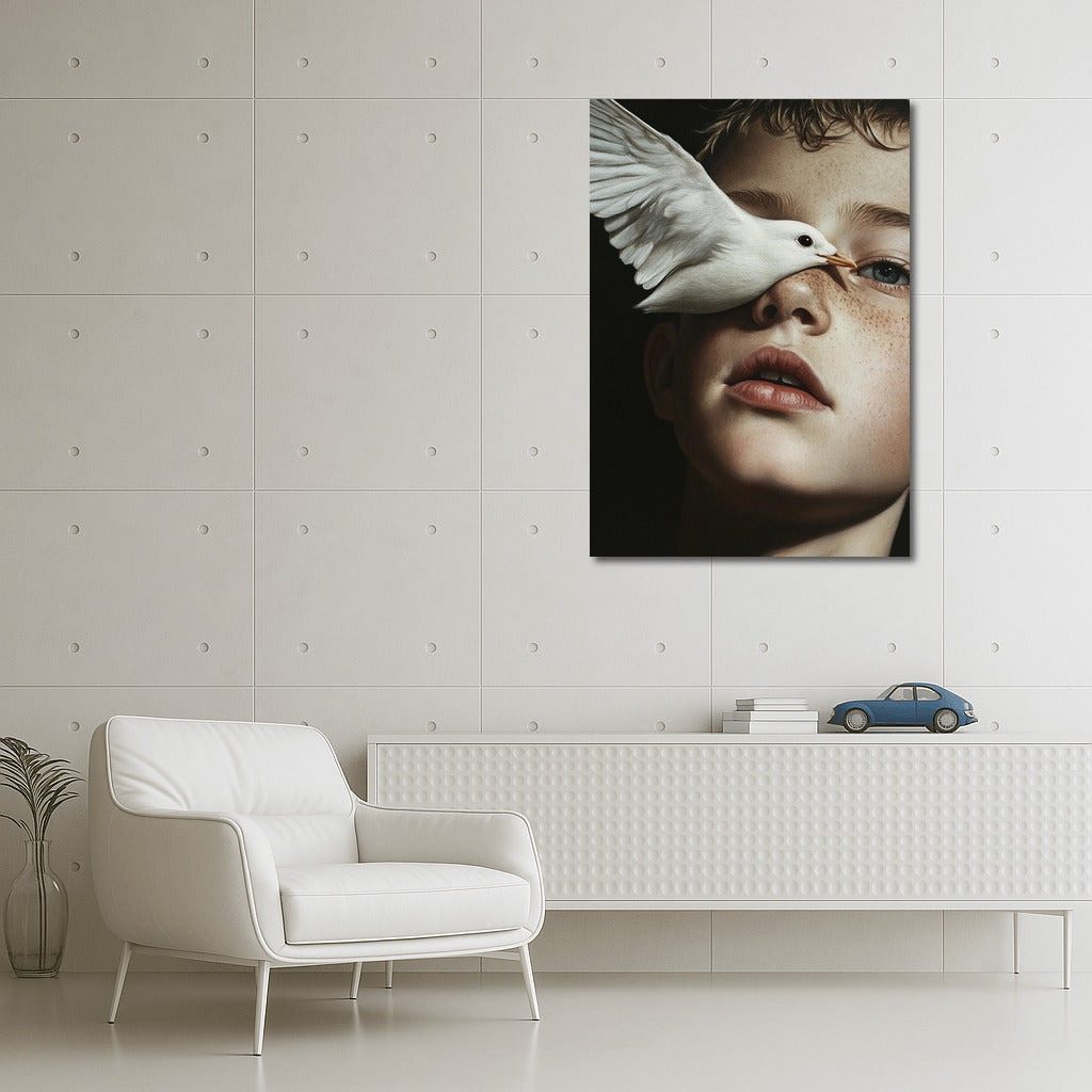 Dive into a dream with this painting: the gentle flight of a bird and a thoughtful look. A poster that inspires and enchants. See more from the collection: Mixed Wall Art