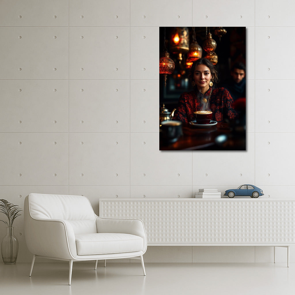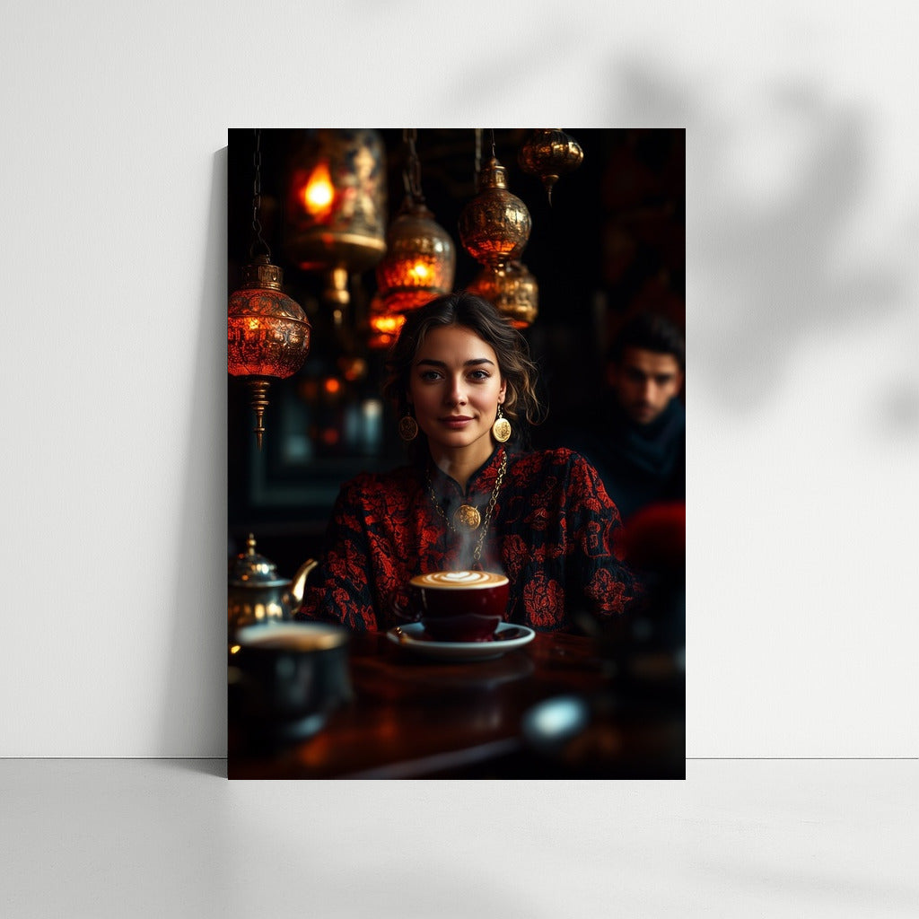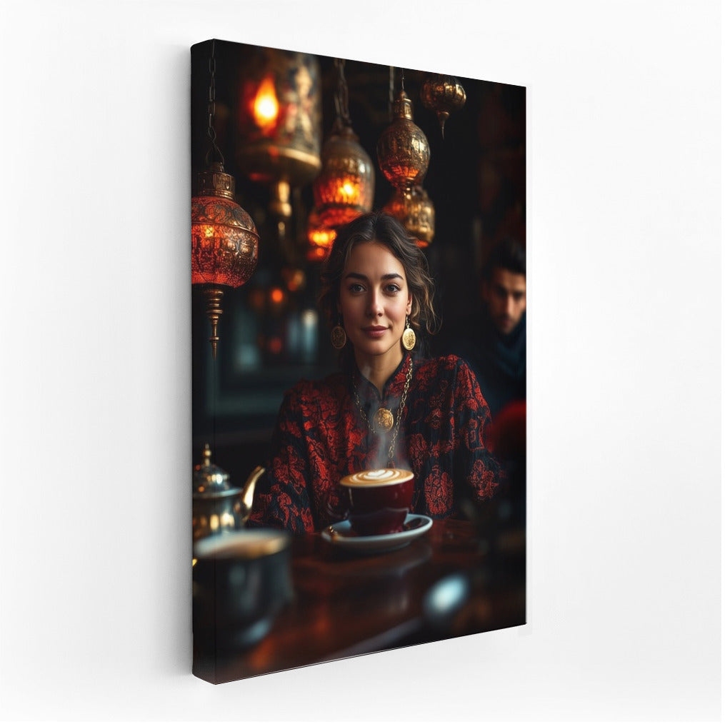 Warmth of oriental coziness in the poster: mysterious look, golden shine of lamps and aroma of coffee. Wall art with charm of the East. See more from the collection: Wall Art with Women