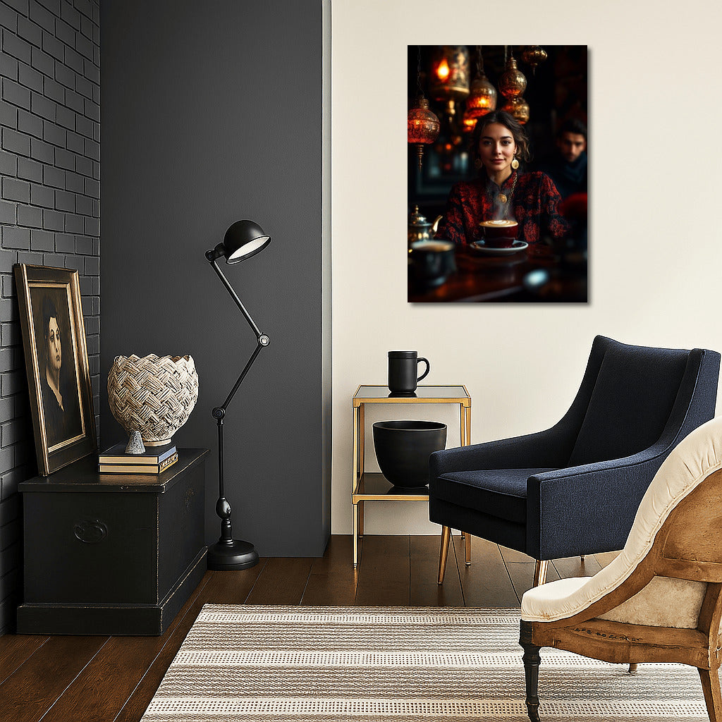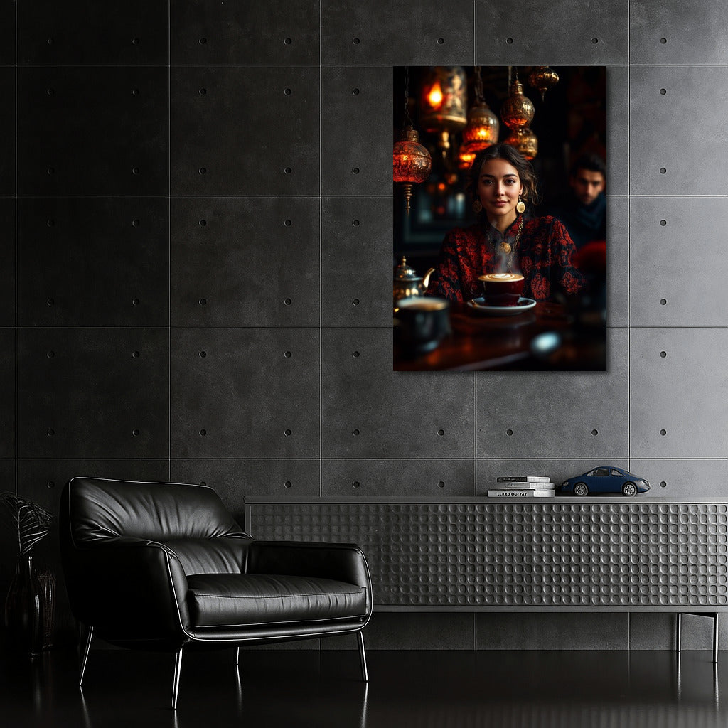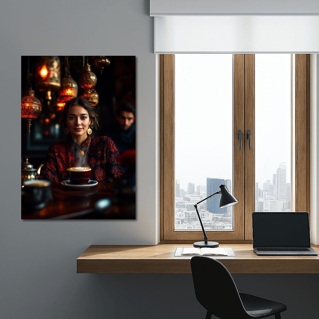 Warmth of oriental coziness in the poster: mysterious look, golden shine of lamps and aroma of coffee. Wall art with charm of the East. See more from the collection: Wall Art with Women