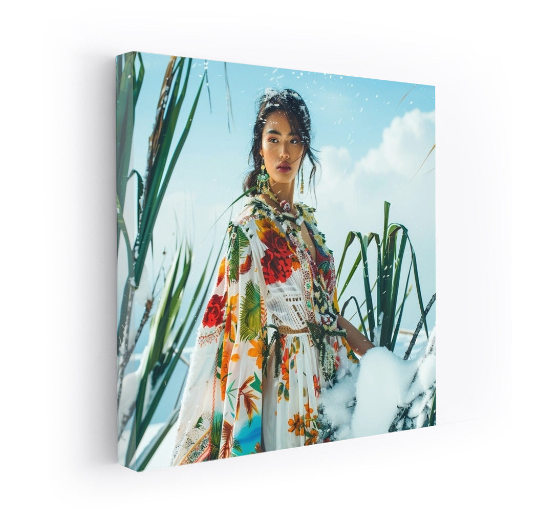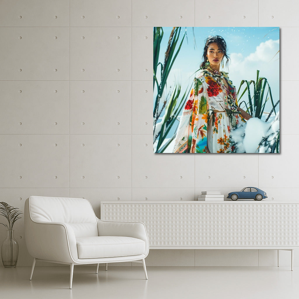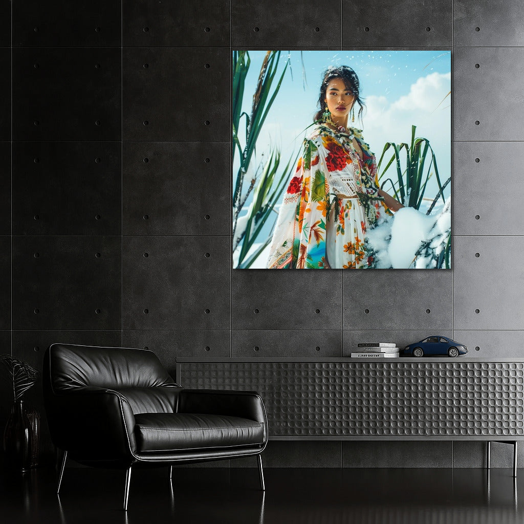 A vibrant poster featuring a mysterious character in the middle of a tropical winter. Wall art that will liven up any interior. See more from the collection: Wall Art with Women