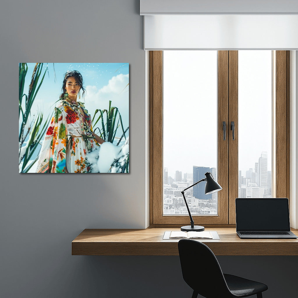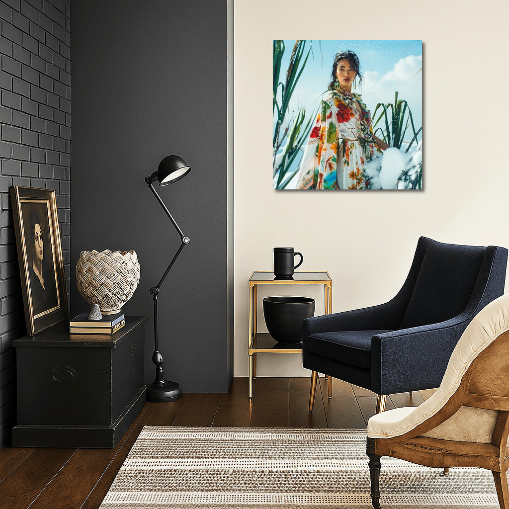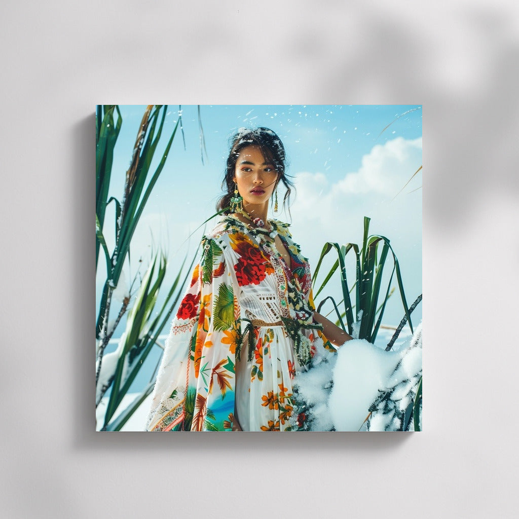 A vibrant poster featuring a mysterious character in the middle of a tropical winter. Wall art that will liven up any interior. See more from the collection: Wall Art with Women