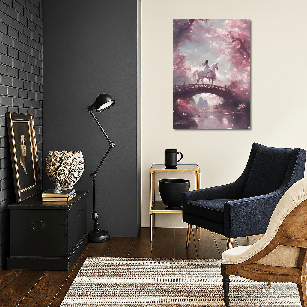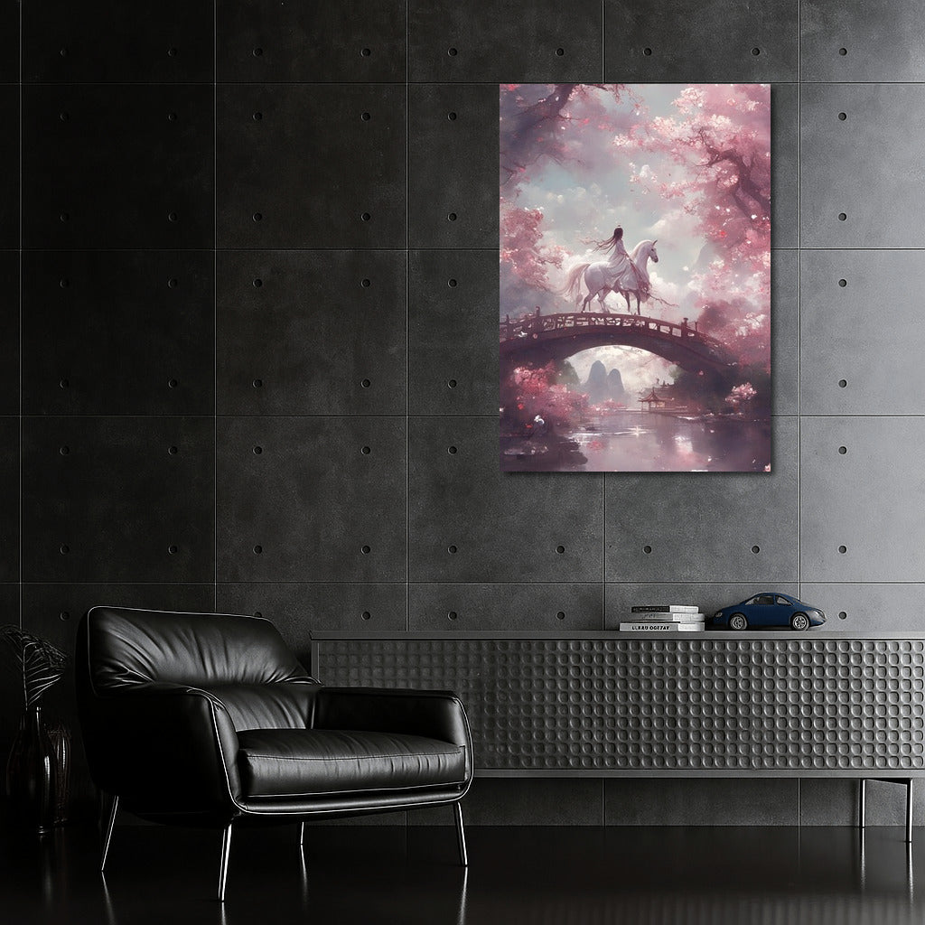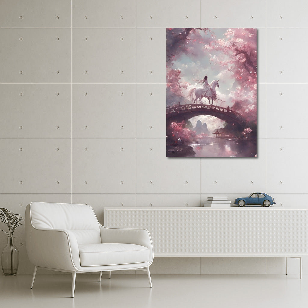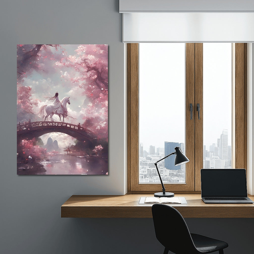 Mysterious figure on a white horse under sakura and sky. Mesmerizing poster art for your space. See more from the collection: Mixed Wall Art
