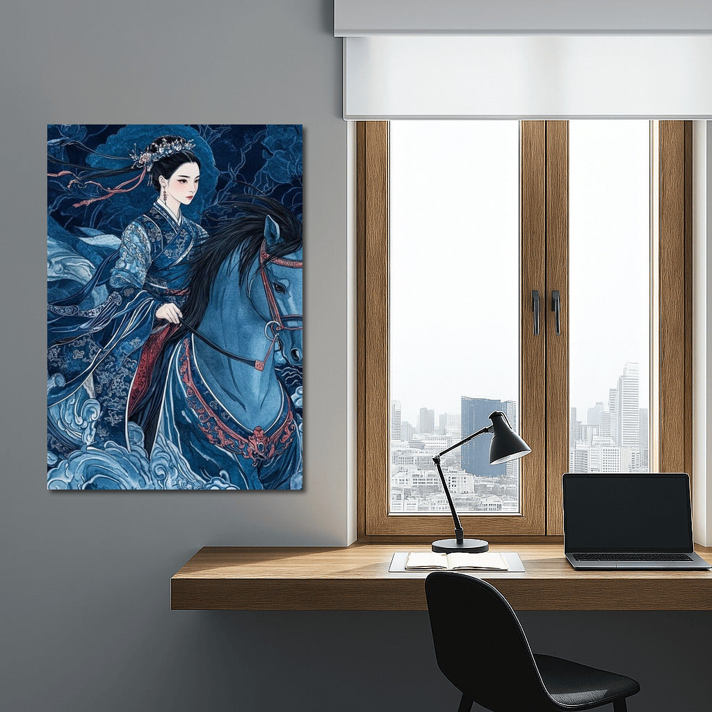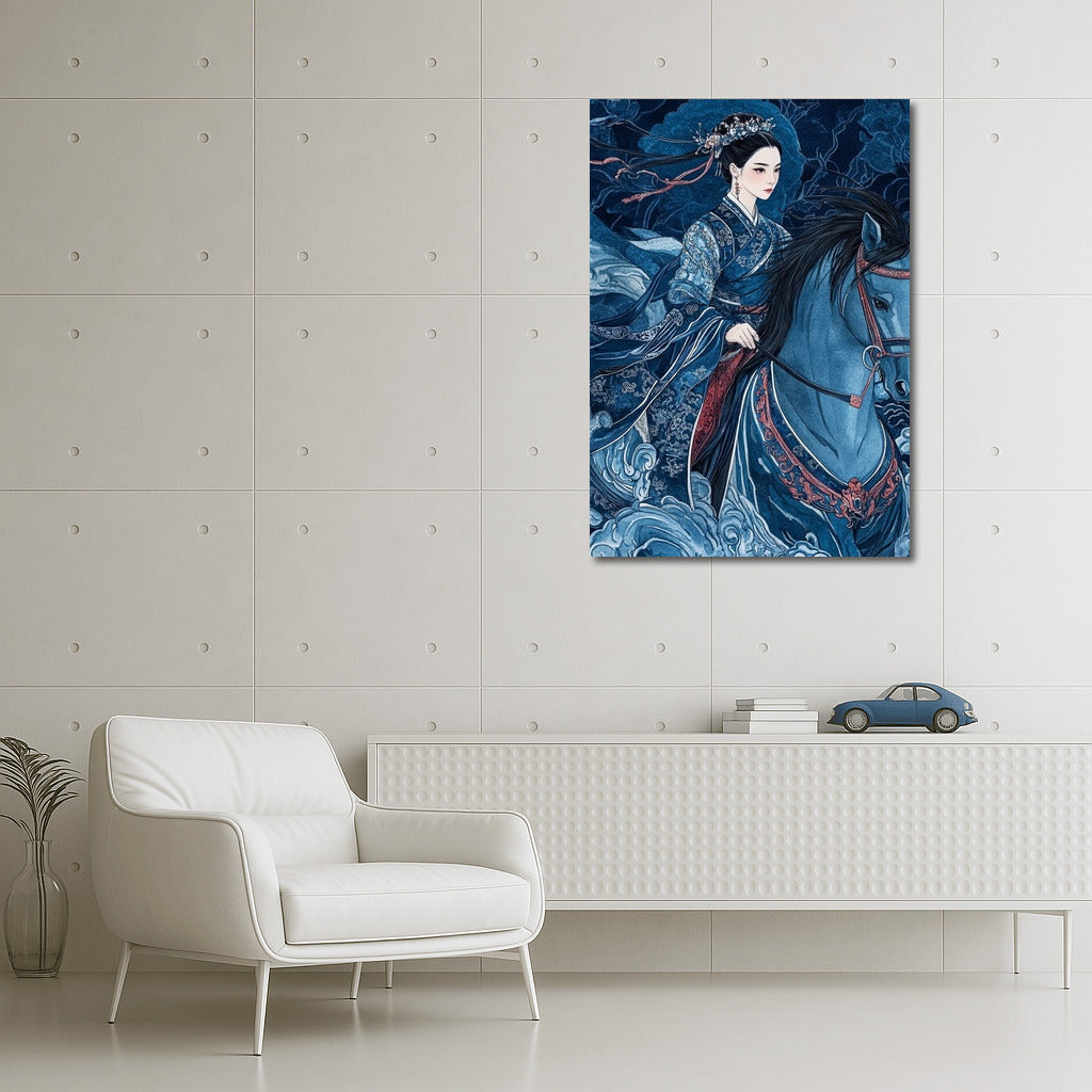 Majestic wall art: a mysterious figure in oriental clothes on a horse, merging with the stormy sky. Fantasy state. See more from the collection: Mixed Wall Art