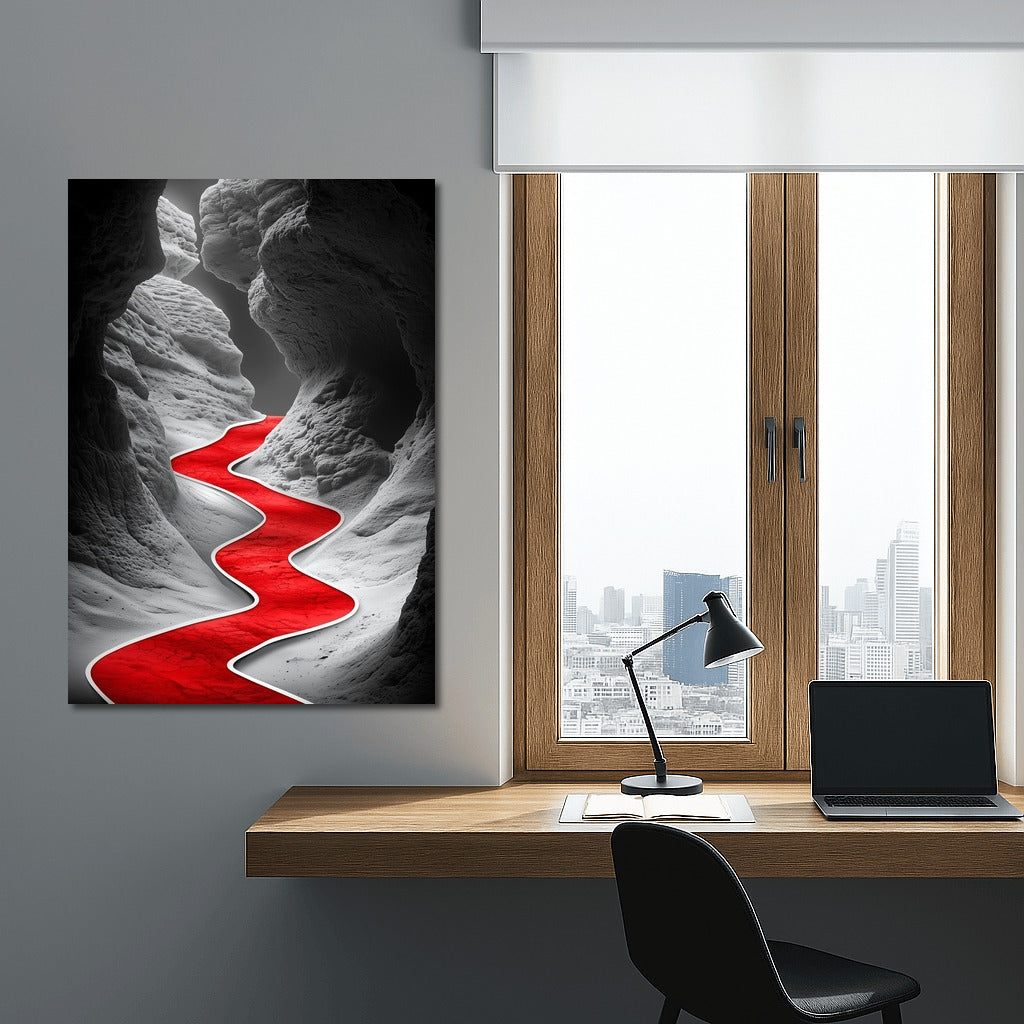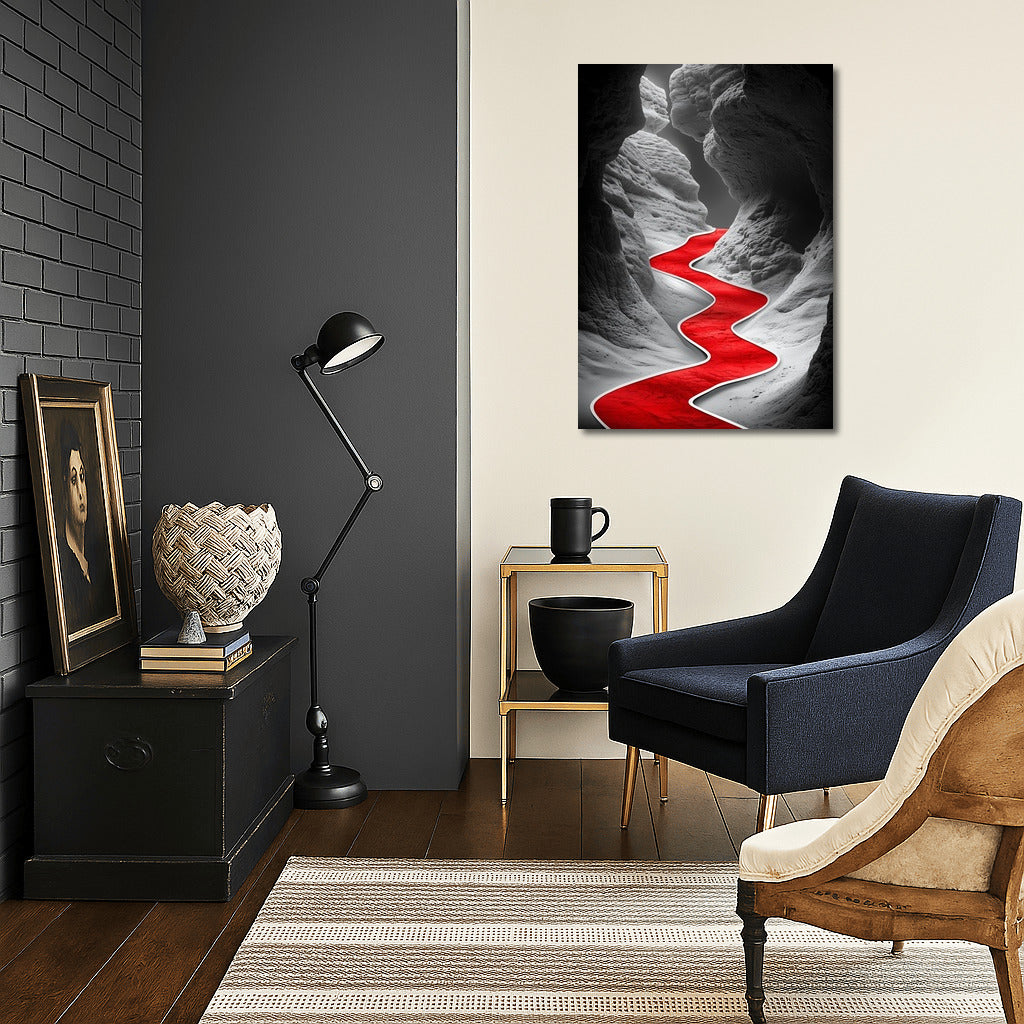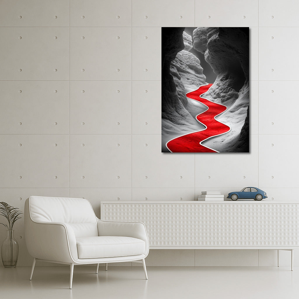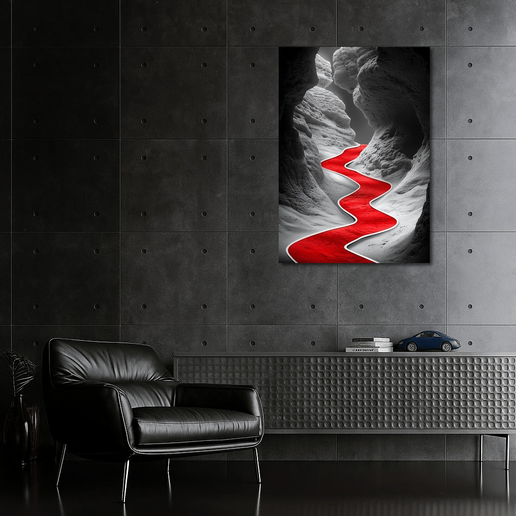 Poster: Mesmerizing play of shadows and colors - red road between snowy cliffs. Wall art that inspires travel. See more from the collection: Mixed Wall Art