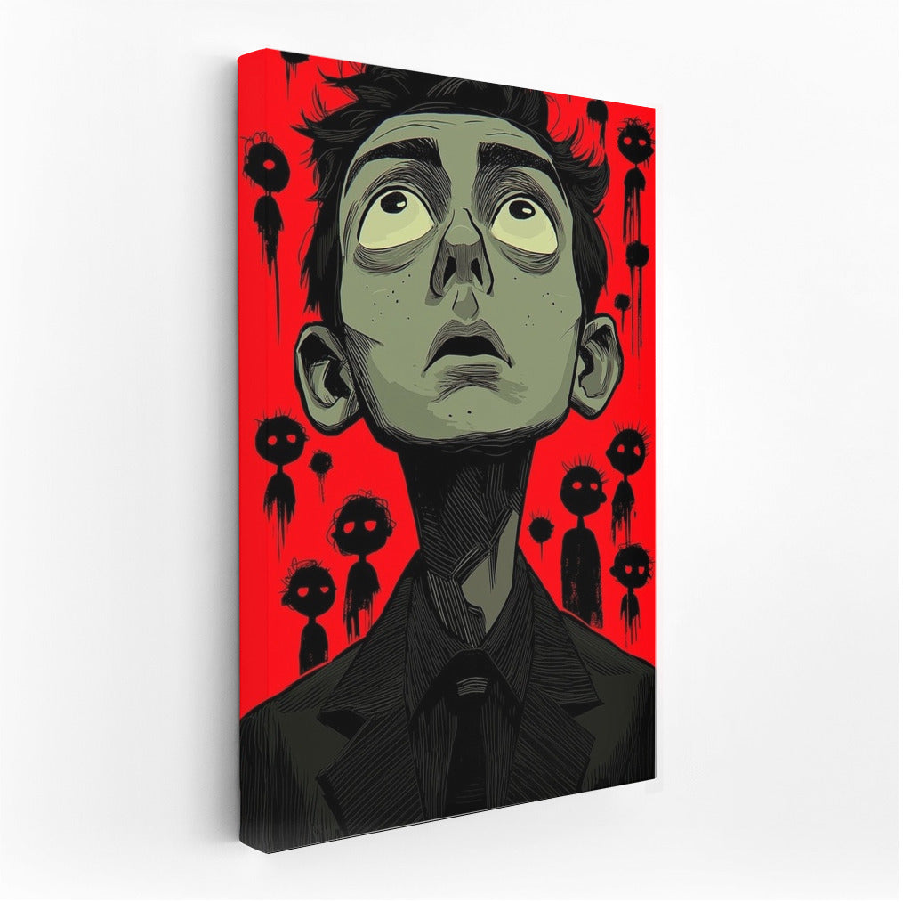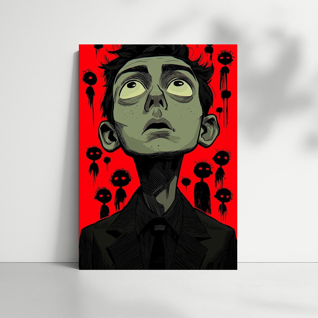 A mysterious poster of a pensive man on a scarlet background. Wall art that will add drama and style to your interior. See more from the collection: Mixed Wall Art