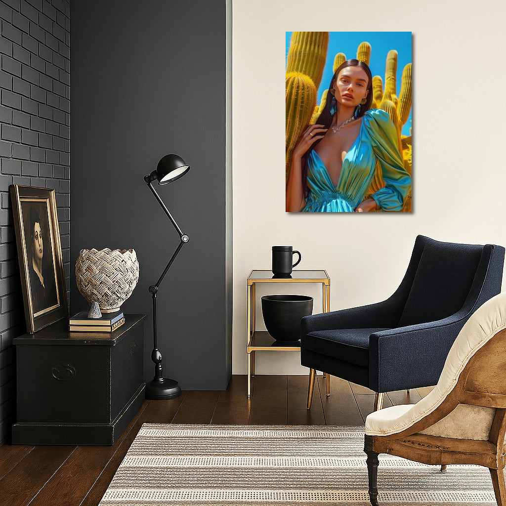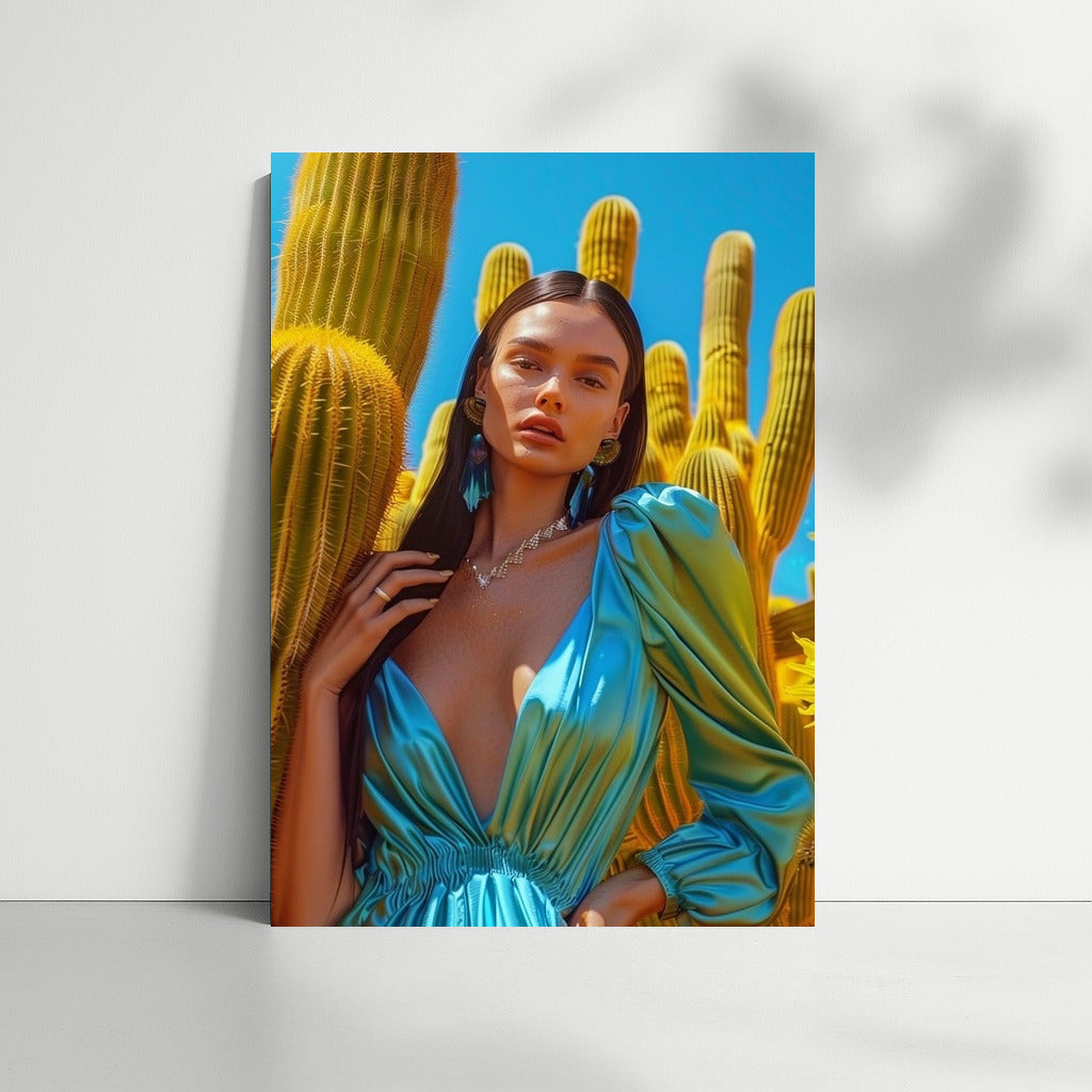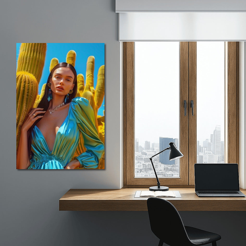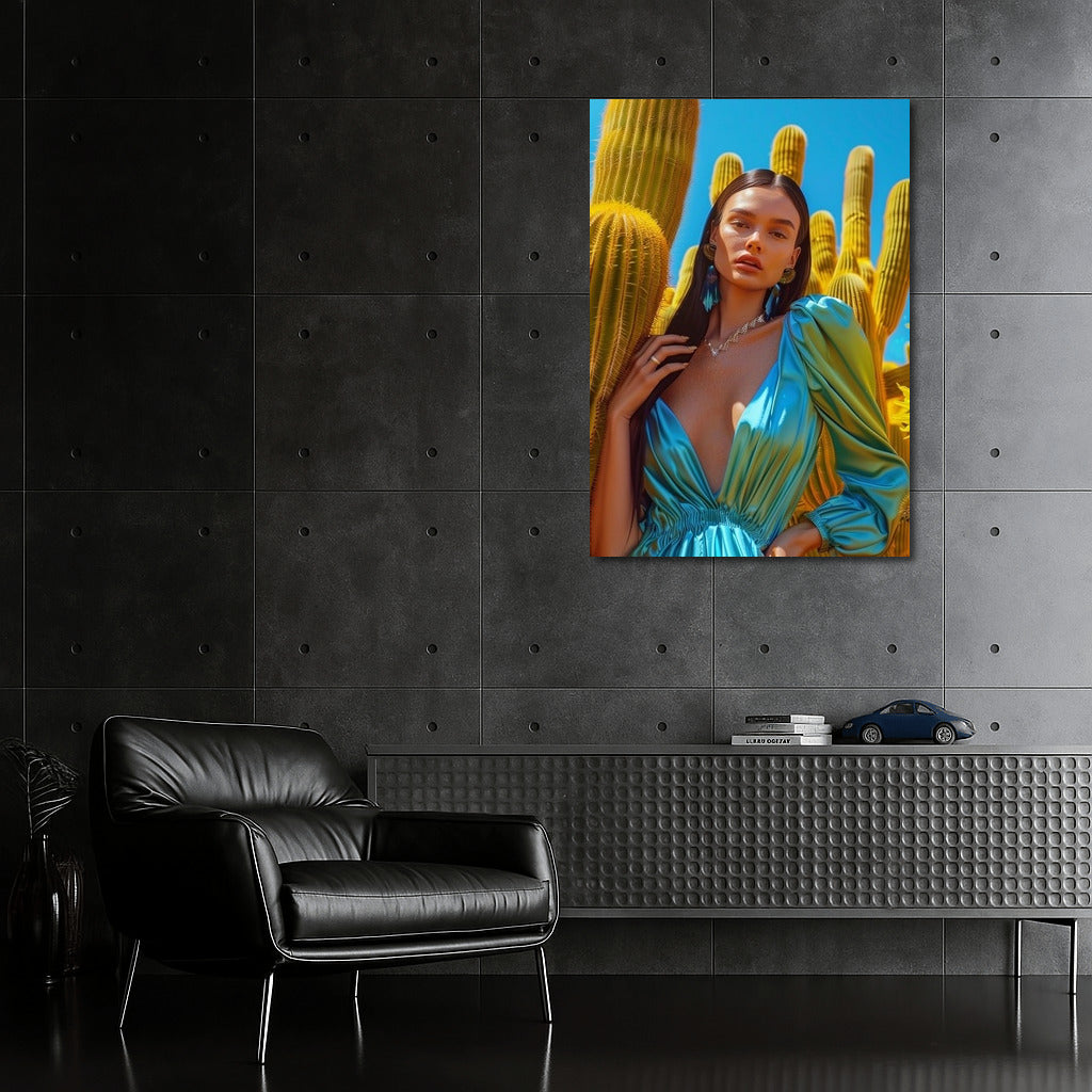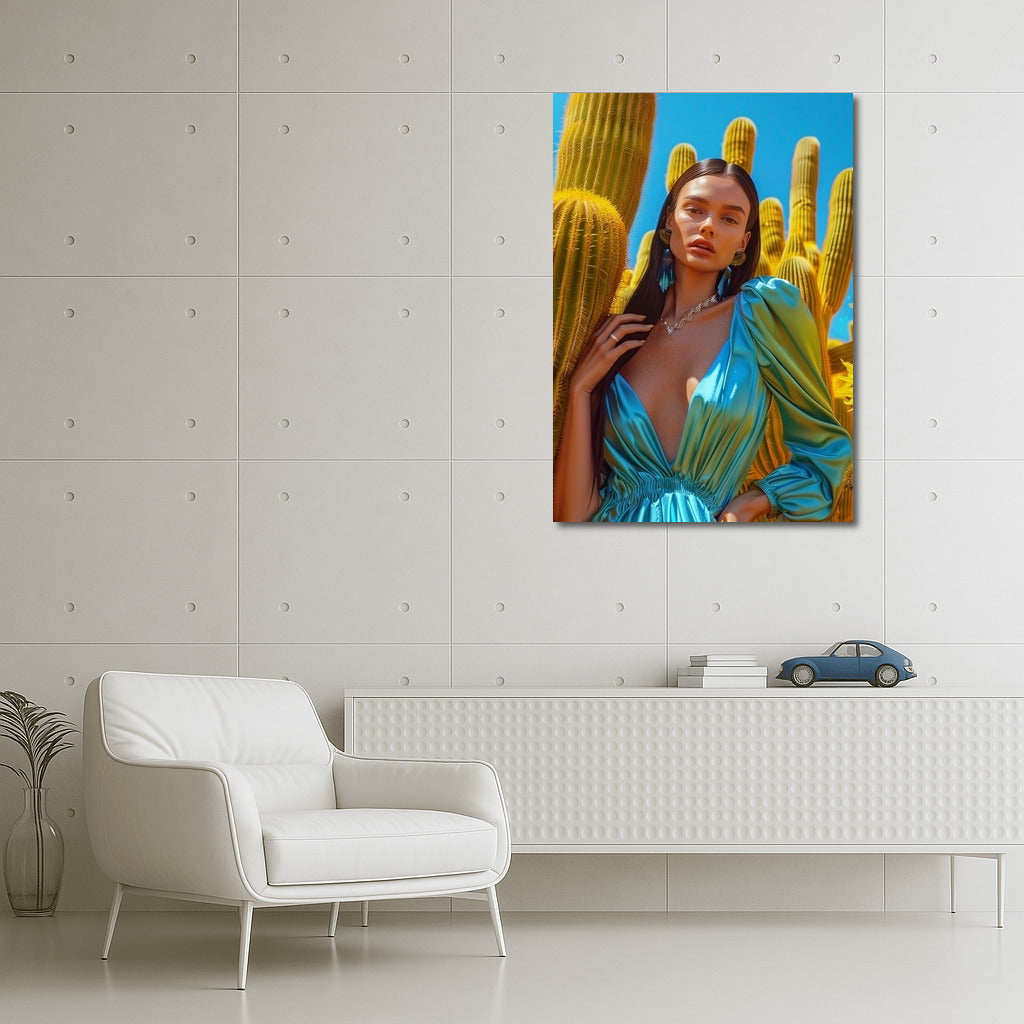 A vibrant painting of a mysterious figure among cacti. A perfect poster to add a unique touch to your space. See more from the collection: Wall Art with Women