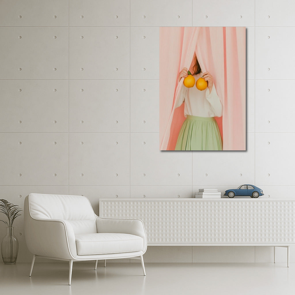 This painting: a mysterious girl hiding behind a curtain with bright oranges. The poster will liven up any space! See more from the collection: Mixed Wall Art