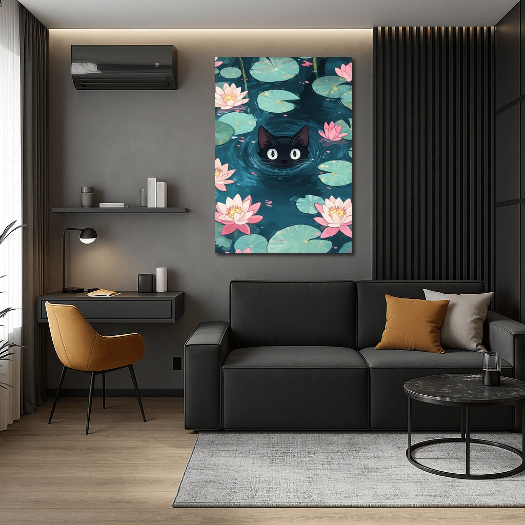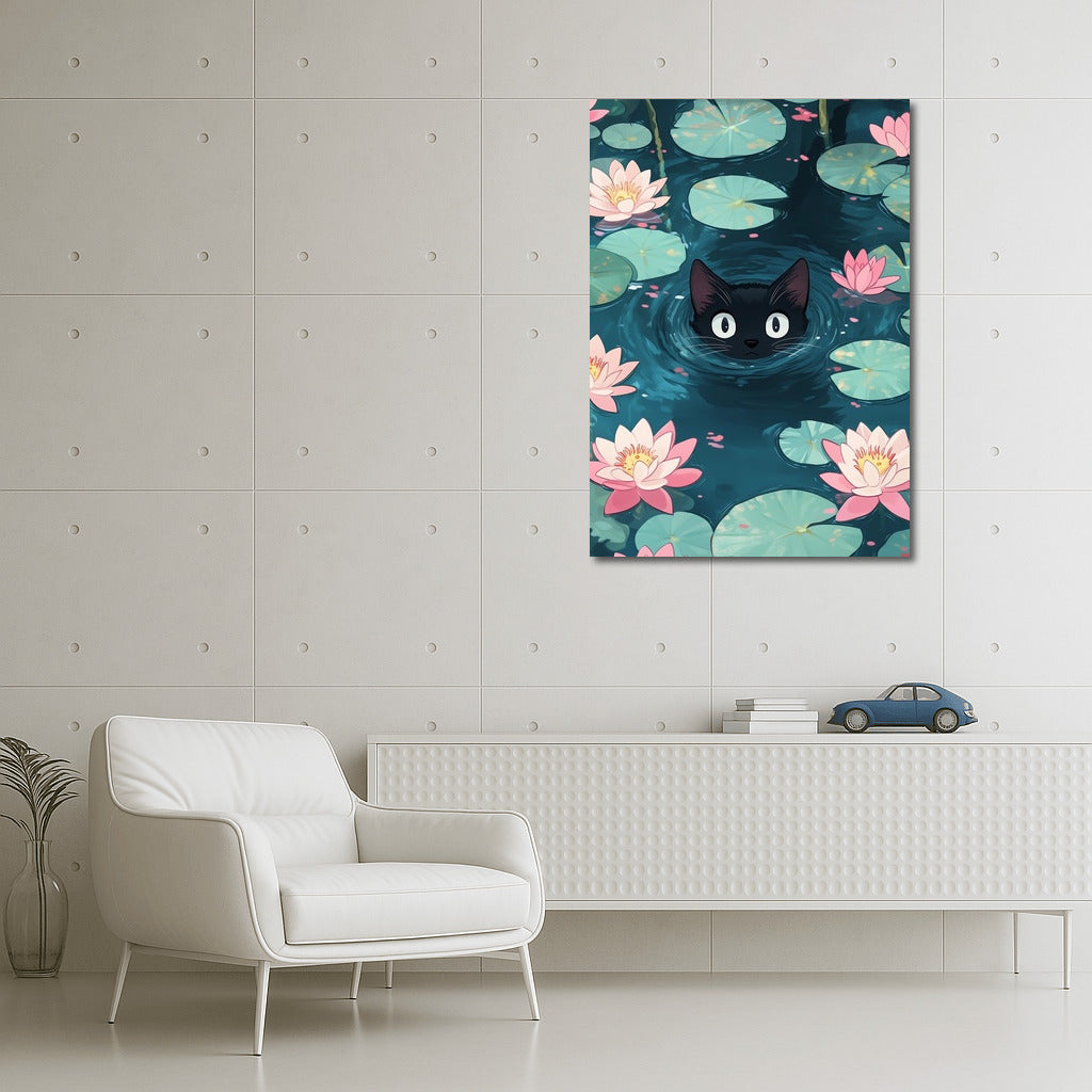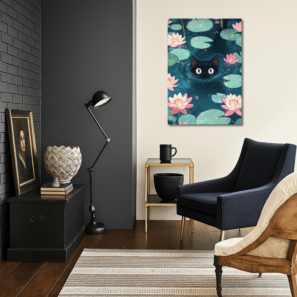 Black cat among lilies - magic in every stroke. A poster that will enliven your interior and add a touch of mystery. See more from the collection: Cartoon Art