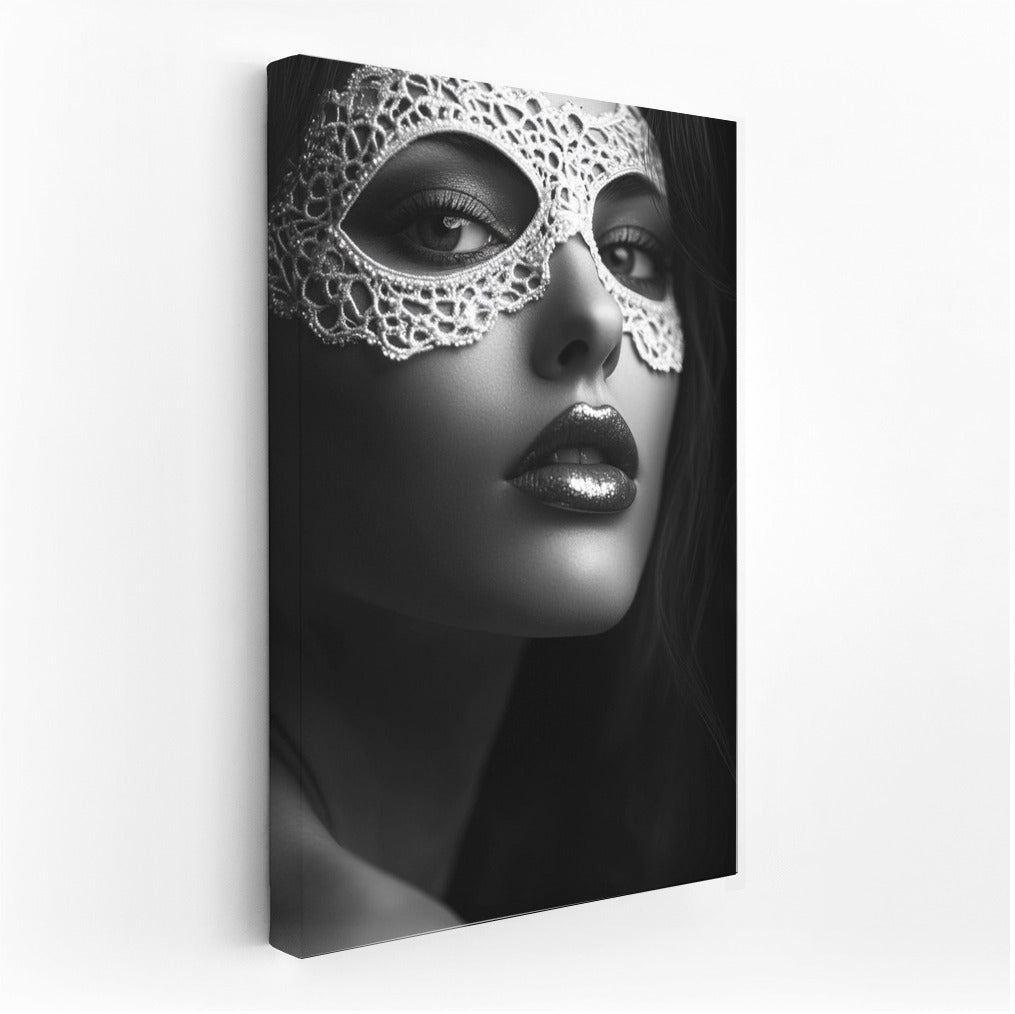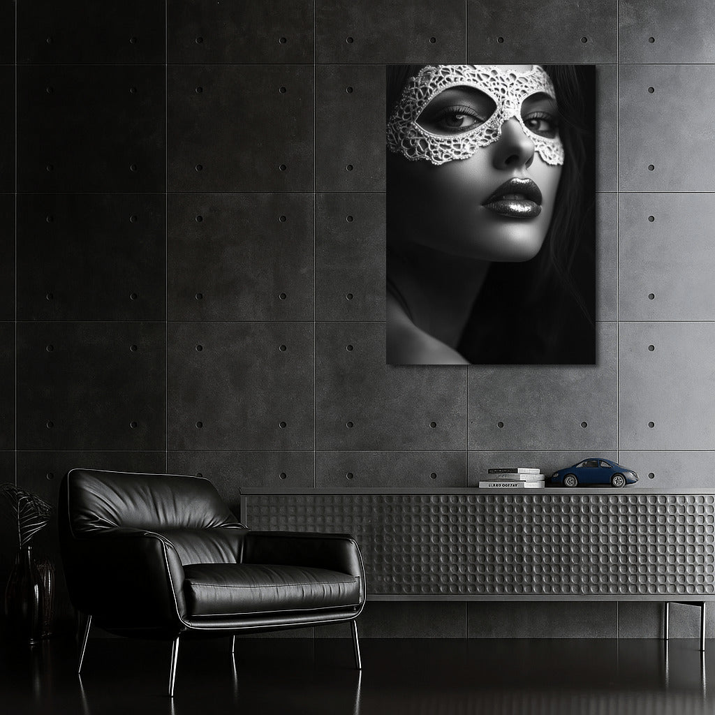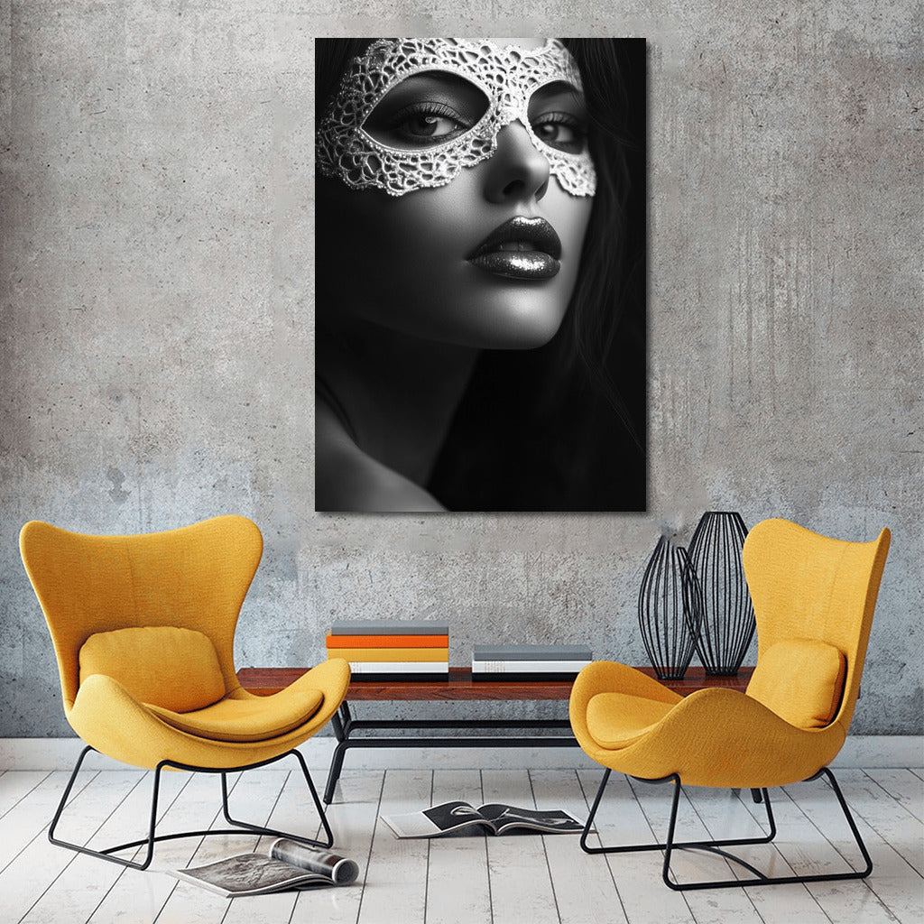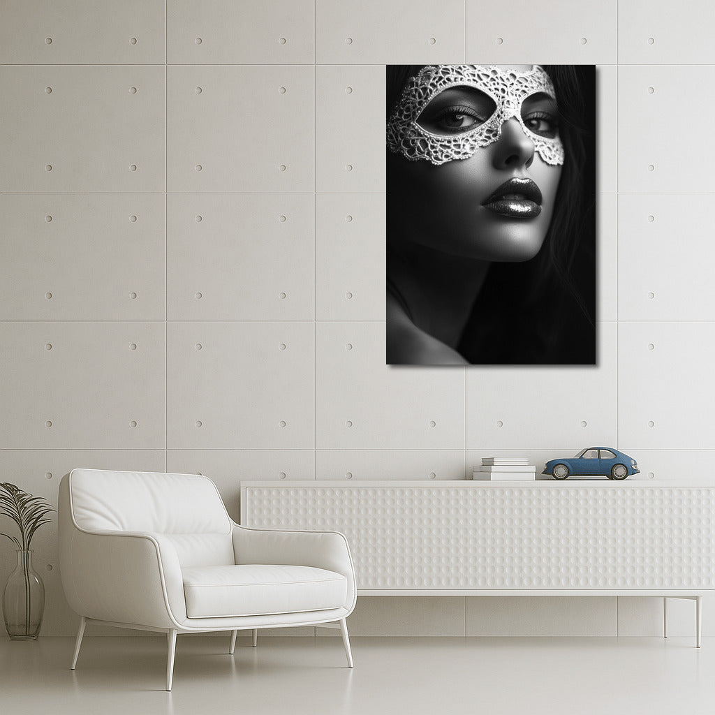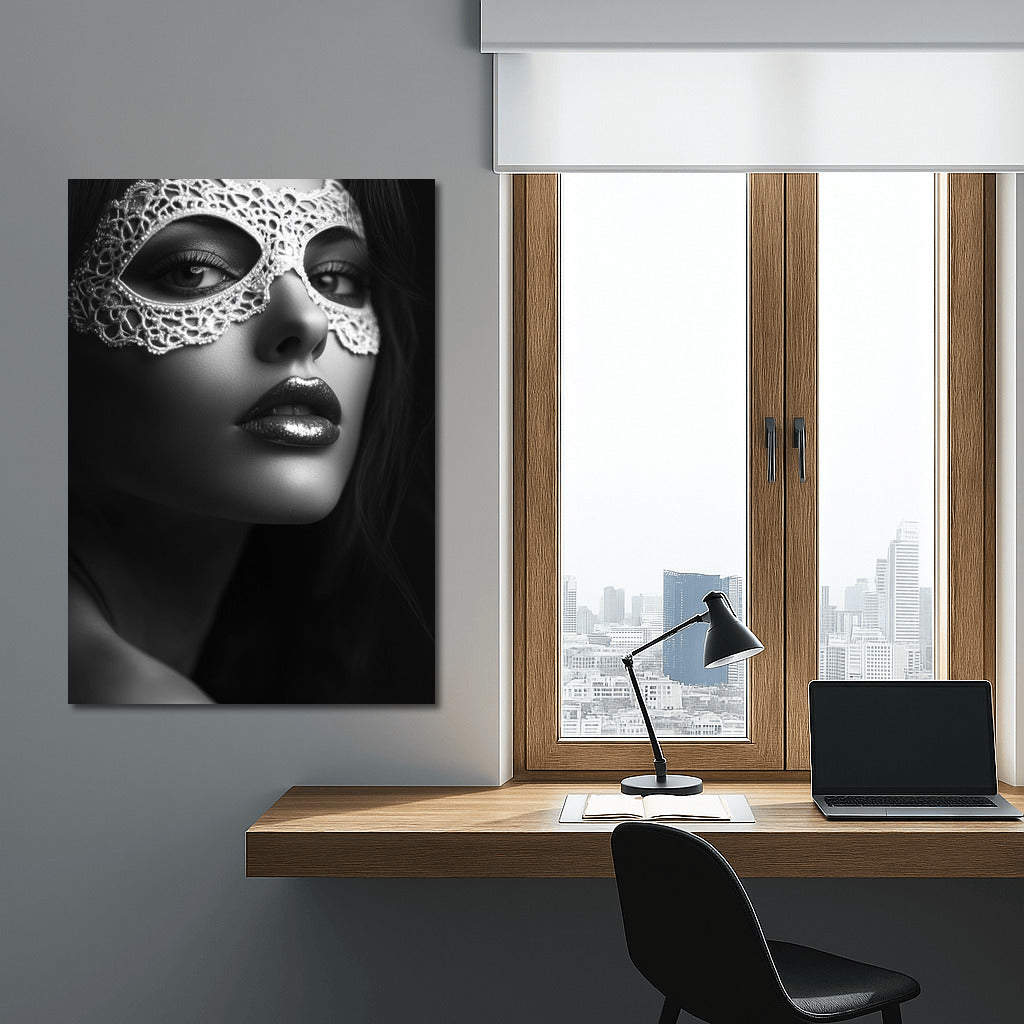 Mysterious girl in lace mask on the poster. Perfect wall art that highlights mystery and elegance. See more from the collection: Black and White Art